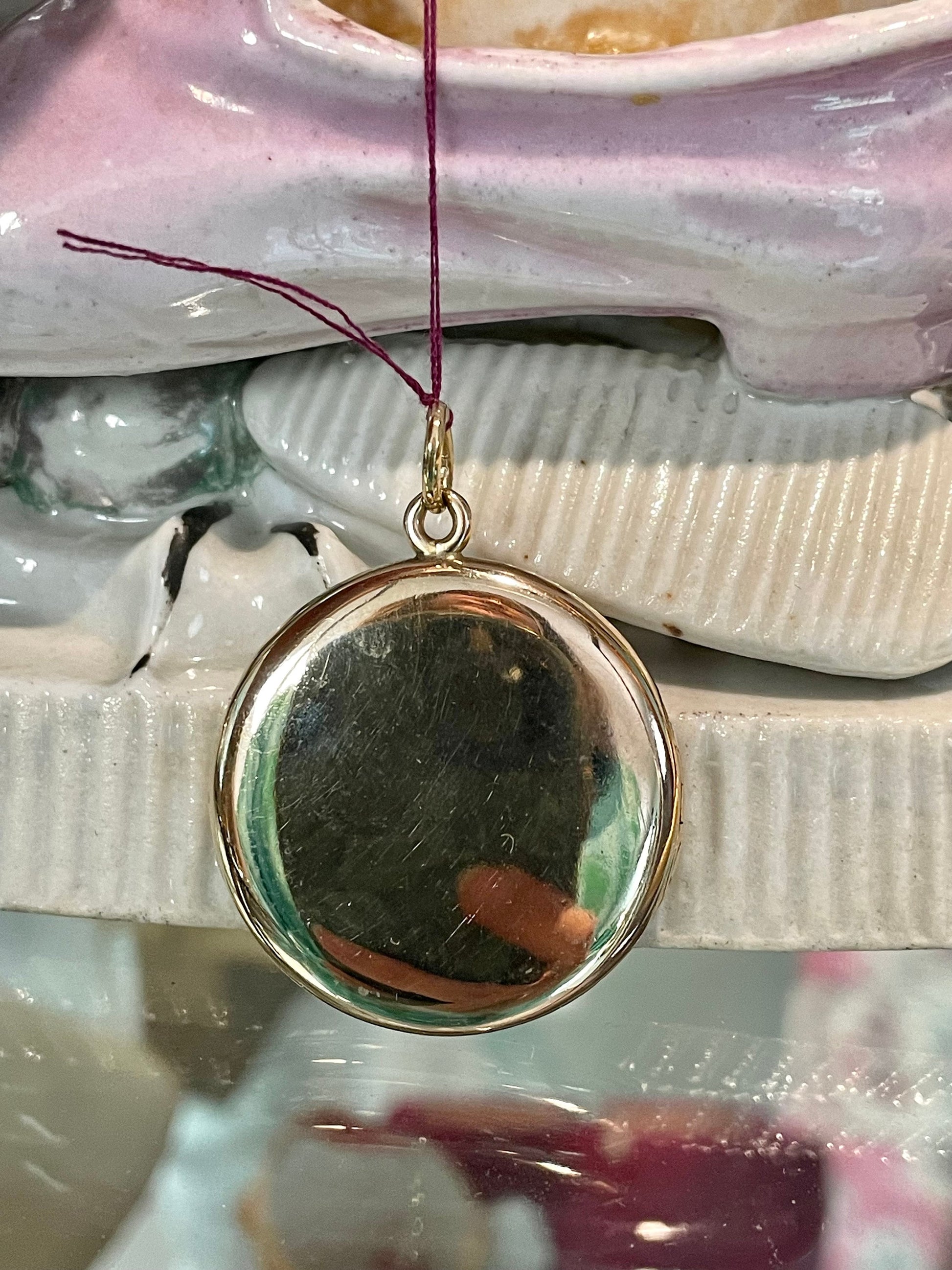10K yellow gold round locket from the Art Nouveau period featuring repousse design of flowers with an old European cut diamond set in the center of a flower. Smooth polish-sorry for all the reflections in the pictures but the piece is in very good condition-I don’t see any dents. Measures 1 1/8” diameter. Nice larger bale to add to all kinds of chains- measures 5 mm tall x 3.5 wide.