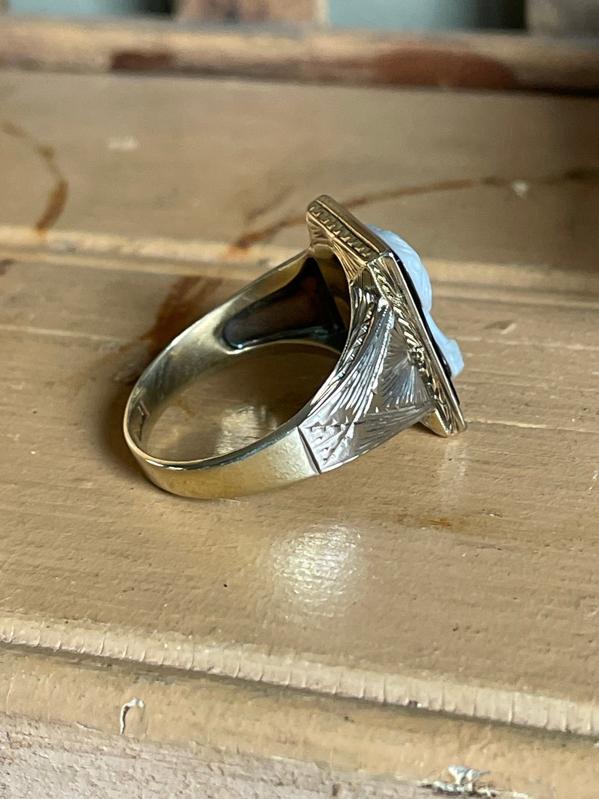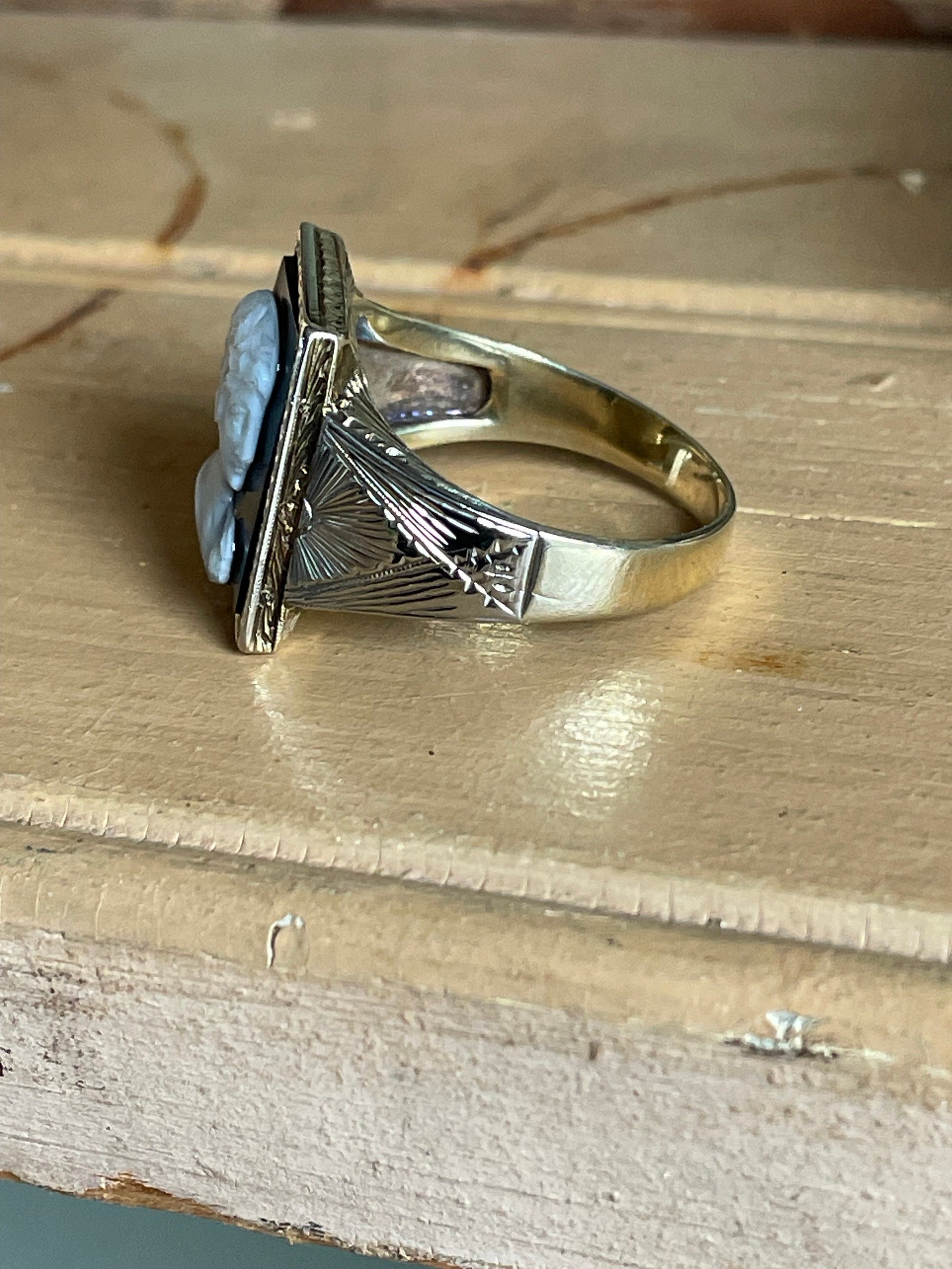 Bold 14k yellow and white gold ring with hand carved agate. The rectangle black and white agate was hand carved into a profile of a flapper lady. Usually you see classical carvings so it pretty rare to see a carved lady in profile with a flapper hairstyle. The agate measures approx. 16 x 12 mm and is bezel set in white gold frame with engraving. The shoulders are also engraved and white gold. The underside and back of shank is 14K yellow gold. Front of ring measures 3/4" in length. Shank is nice and thick. Currently a size 10 3/4 but can be resized. Message me about your size and I can get you an estimate.