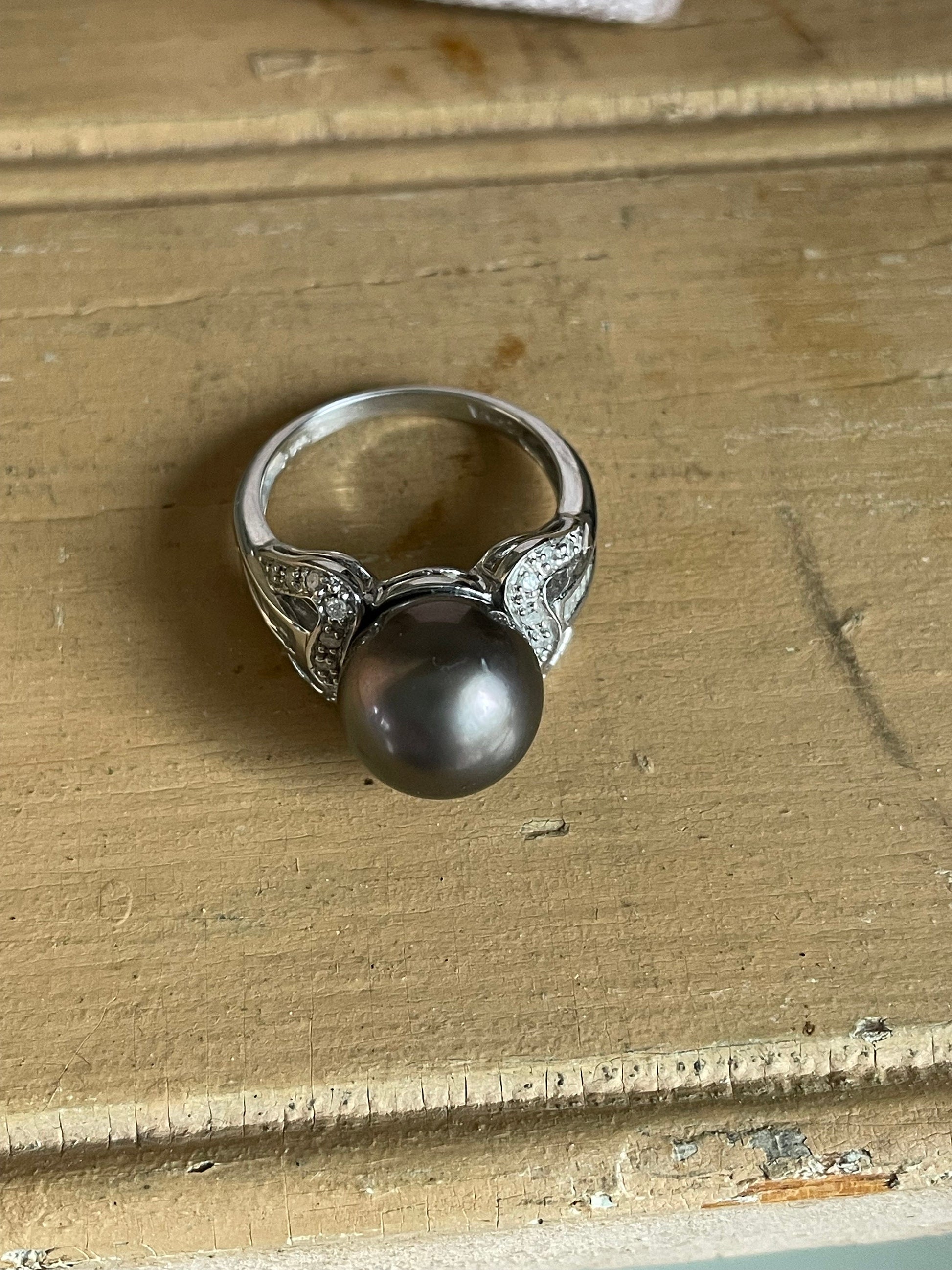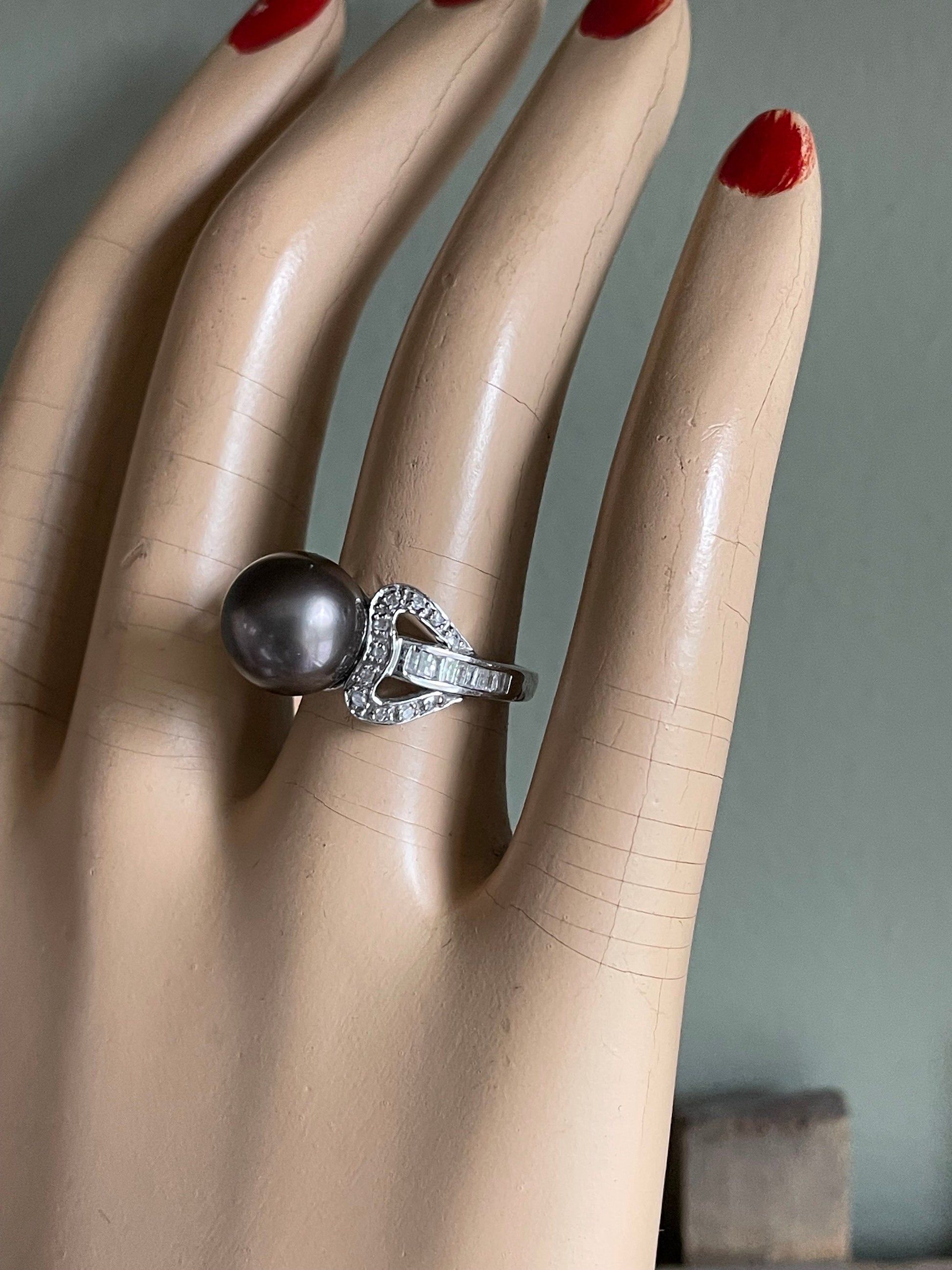 14K white gold ring (stamped and tested) set with a 10.60 mm gray pearl post set. On the shoulders are round bead set diamonds and channel set rectangle cut diamonds. Condition is very good. Currently a size 6 but message me if you need a different size and I can get you a estimate. Sz 6