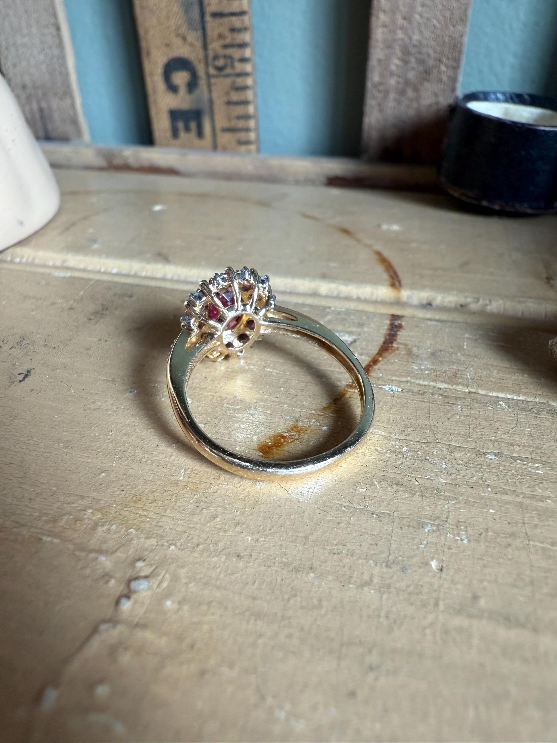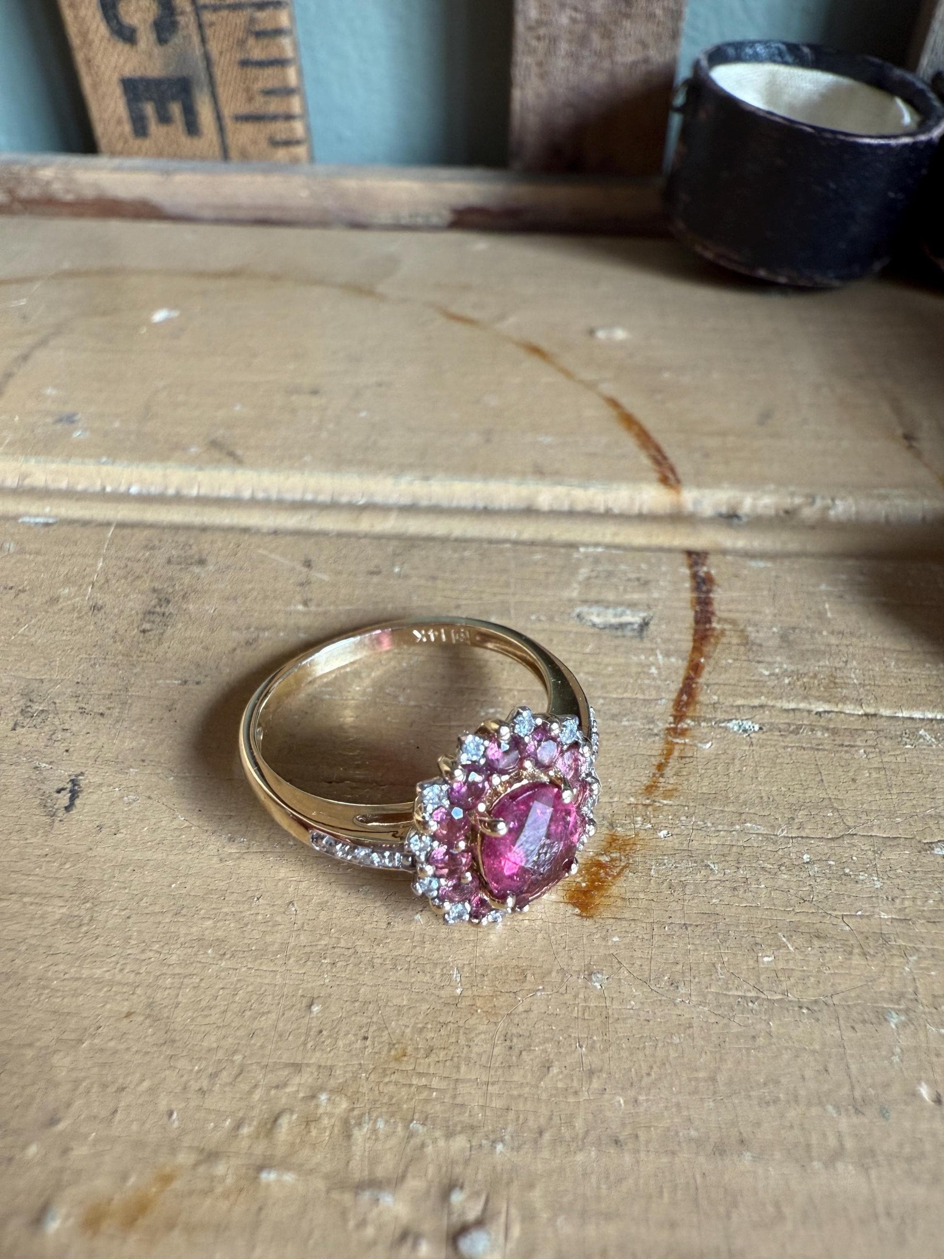 14K yellow gold ring with oval pink checkerboard cut tourmaline measuring approx. 6.85 x 5.08 mm, approx 1-1.20 cts, with a halo of round cut pink tourmaline and round cut diamonds. There are round cut diamonds set in white gold on the shoulders.