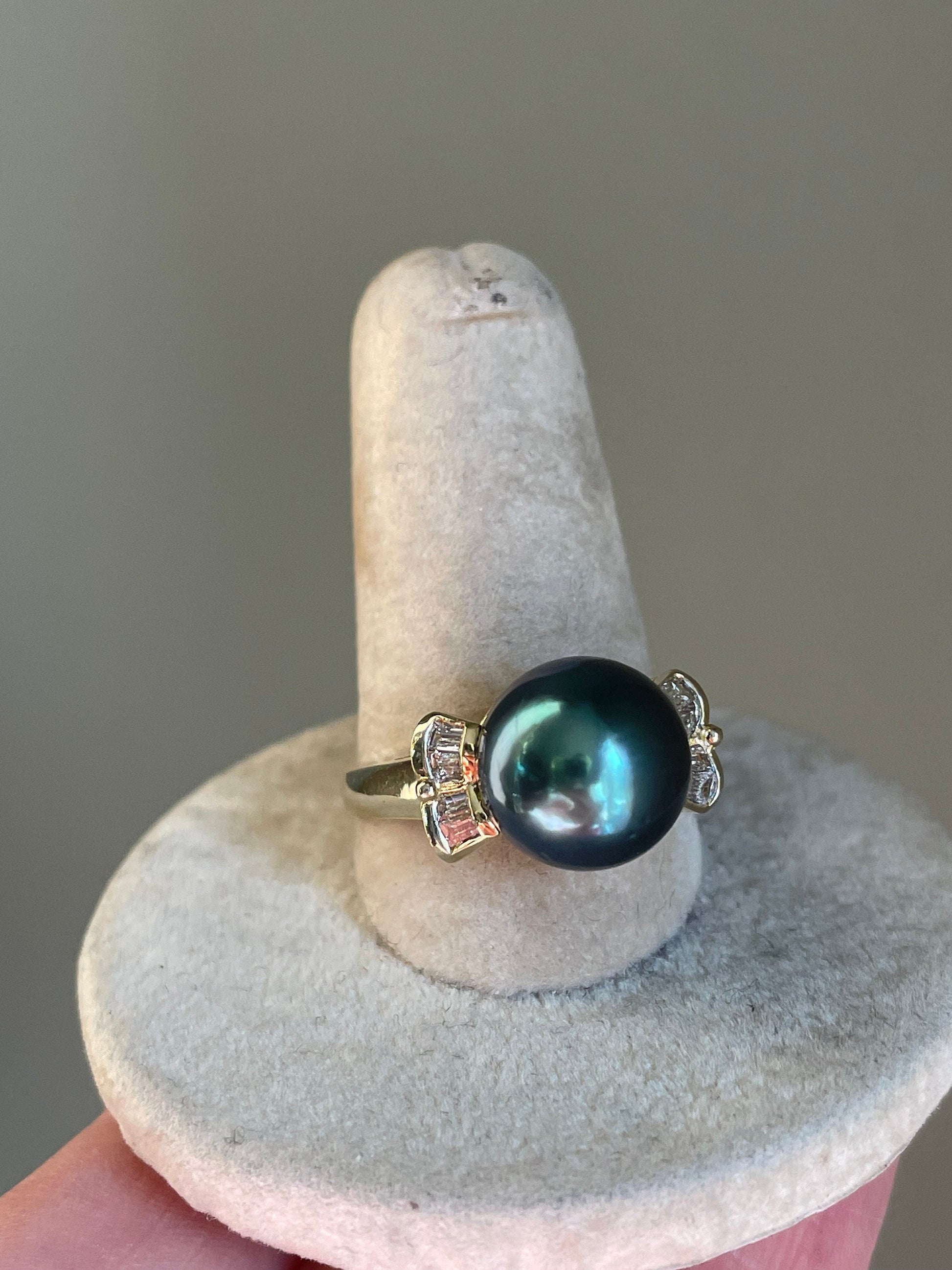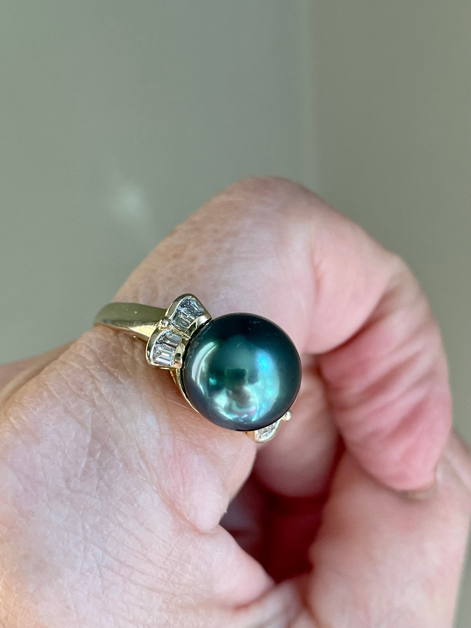 14K yellow gold (tested and marked in shank) ring featuring a green/blue Tahitian pearl measuring approx. 11 mm. My photos don't catch the beauty of the color. There is a little iridescence to the pearl. Very slight blemishes, prong set. On the shoulders are bagguette cut diamonds securely bezel set in what I see as a bow like motif. Nice larger statement piece. Overall in very good condition with great luster.
