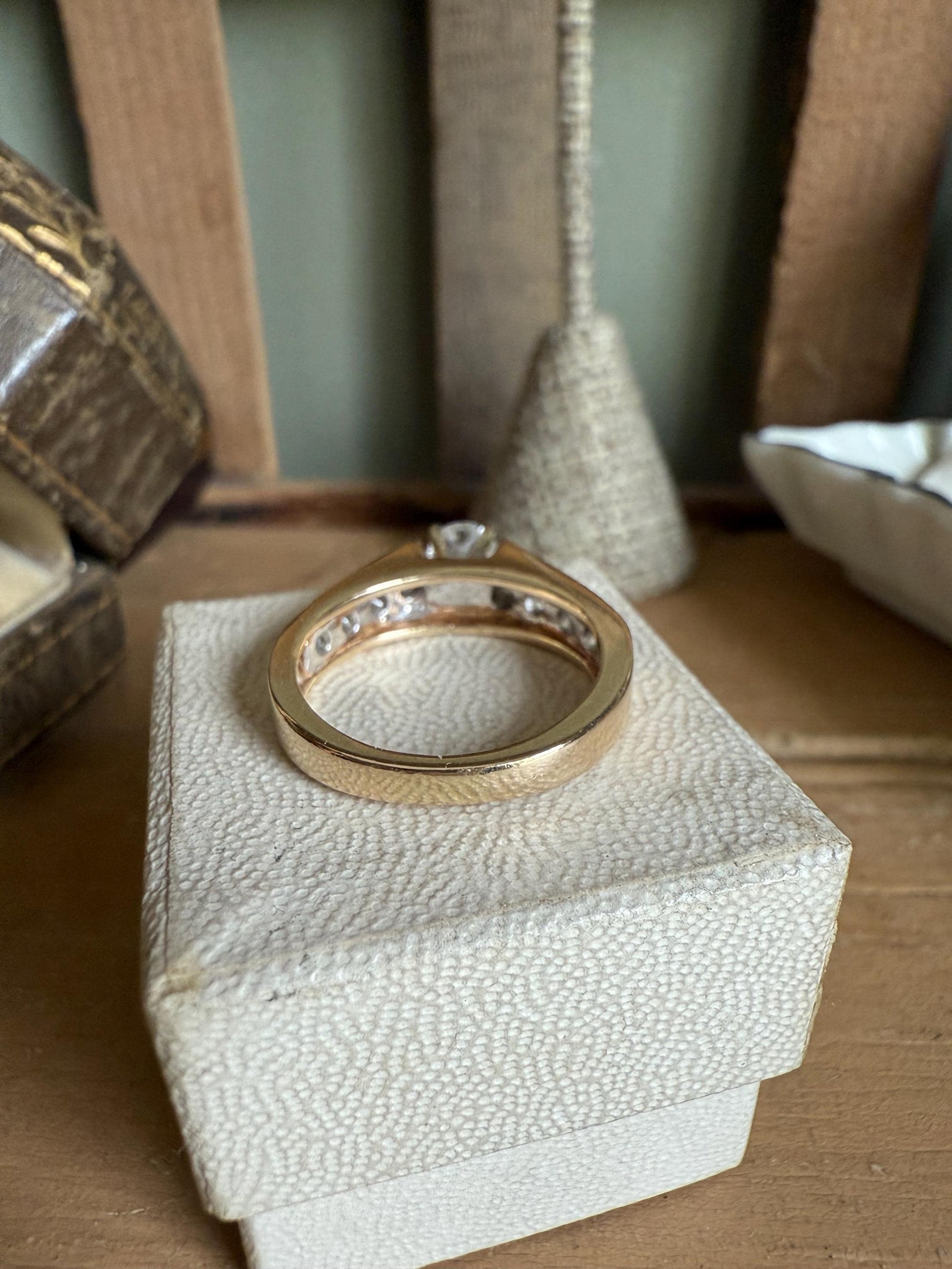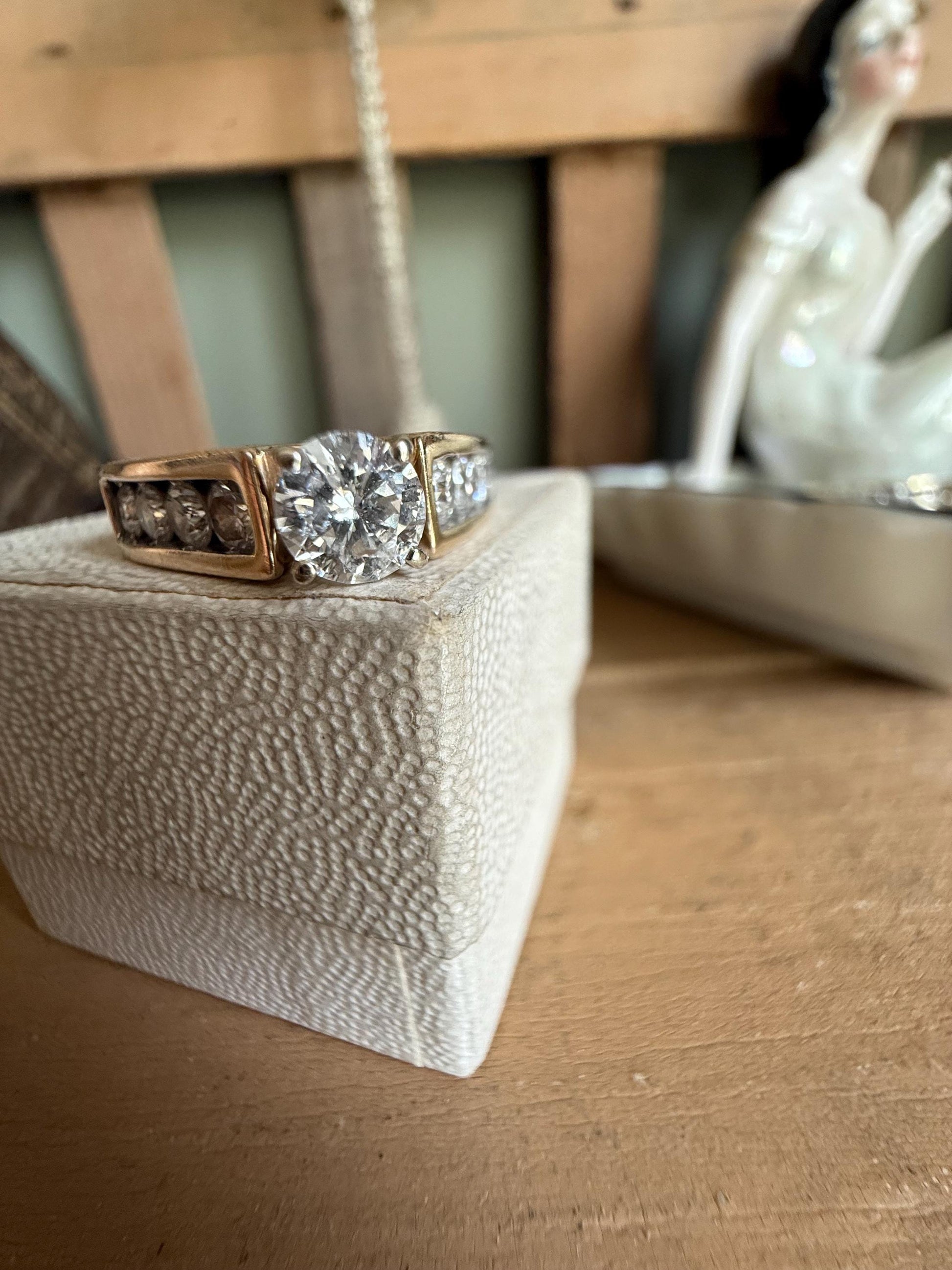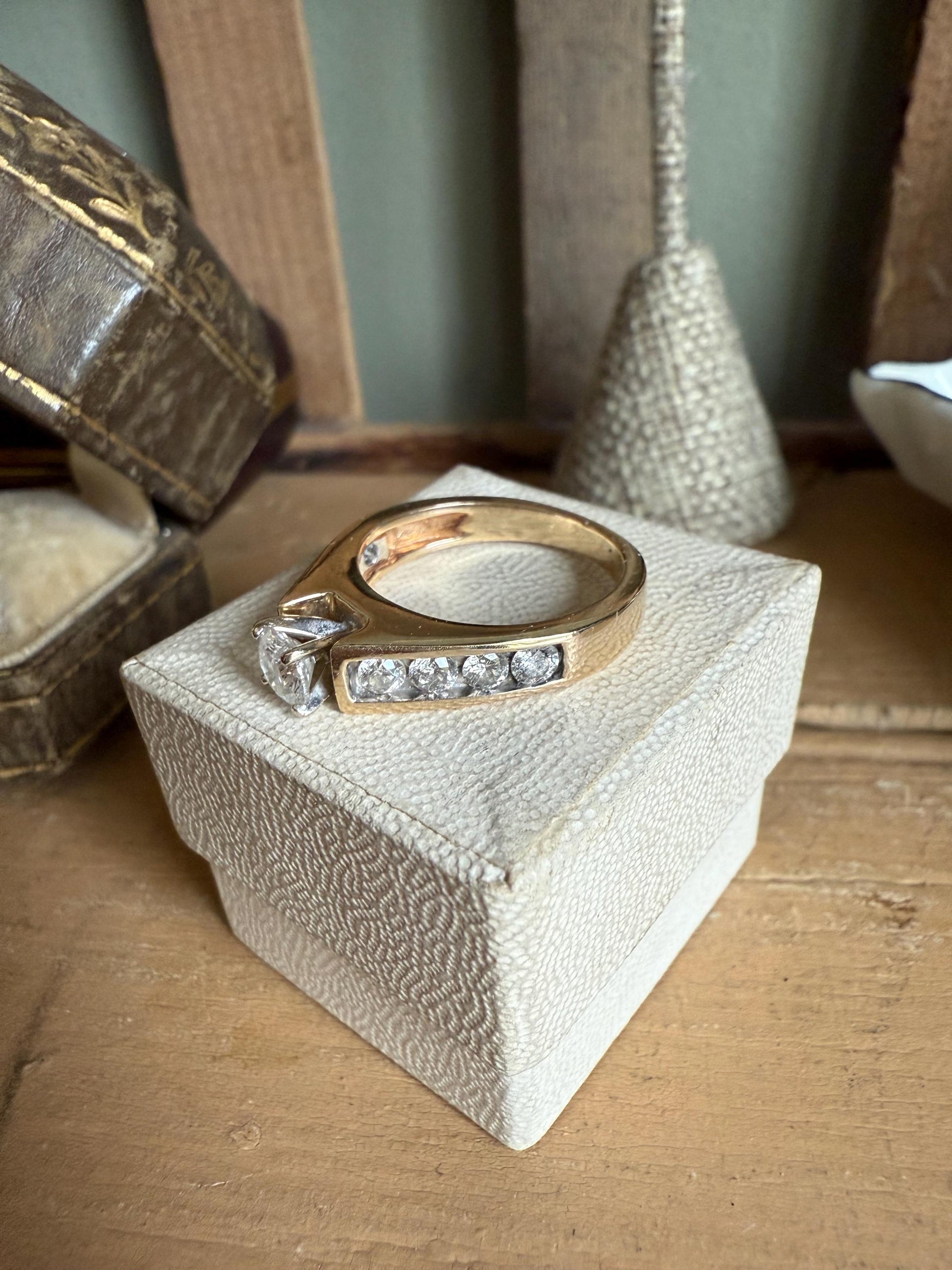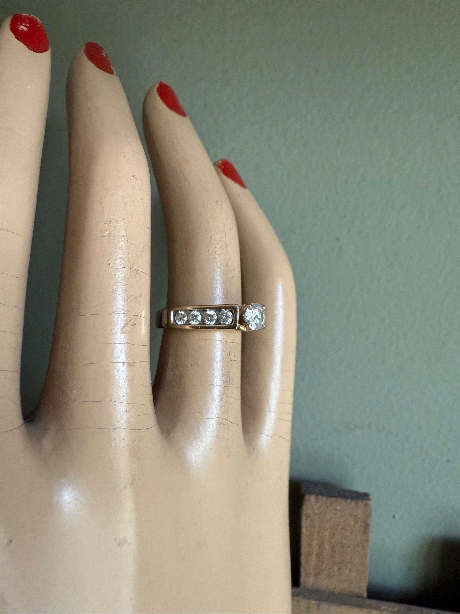 14K yellow gold ring featuring a centered approx. .38 ct round brilliant cut diamond, I color, I clarity set by four prongs, one each side are four round brilliant cut diamonds channel set weighing approx. .06 ct each, total weight of all diamonds approx. .88 ctw. I am a GIA diamond graduate.