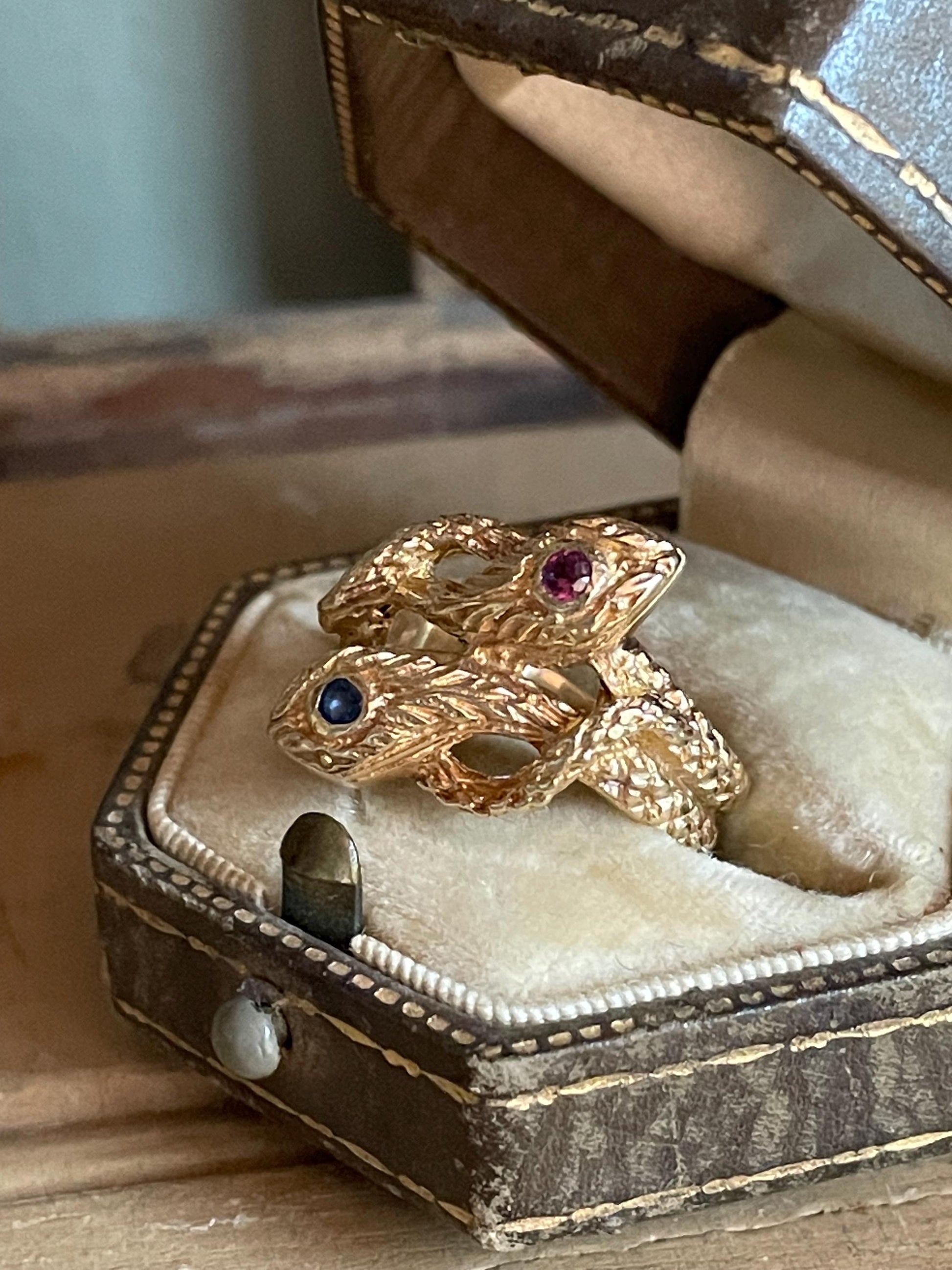 14k Yellow Gold Double Snake Ring with Sapphire and Ruby Set Heads