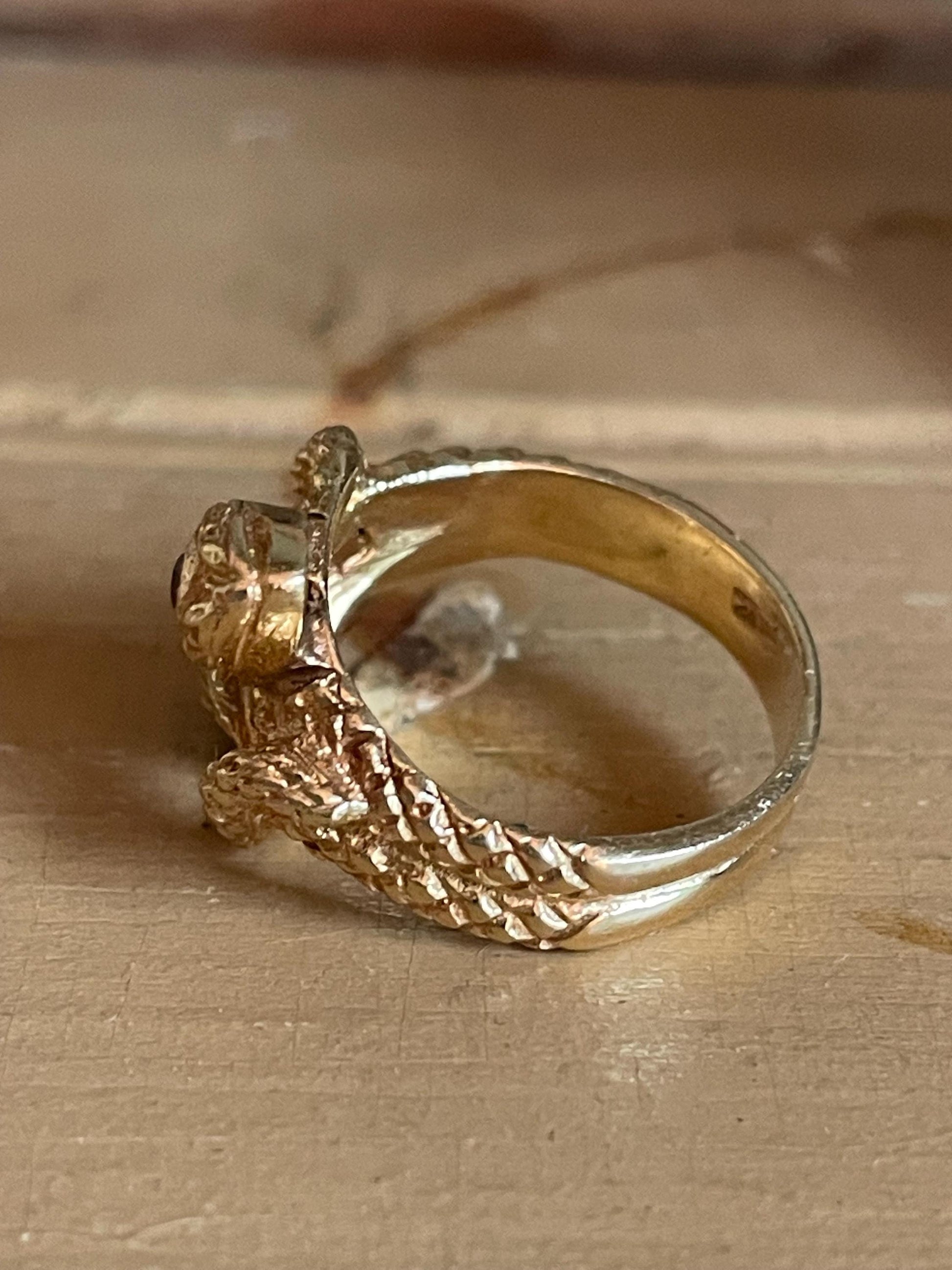 This piece is a stunning heavy 14K yellow gold ring featuring two well rendered snakes with corrundum set in their heads. The round cut sapphire and ruby are bezel set and measure approx. 2.10 mm diameter. The snakes are textured to represent scales.