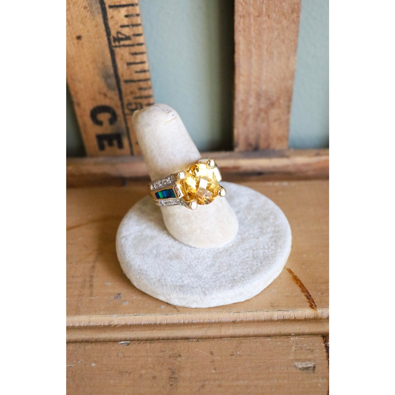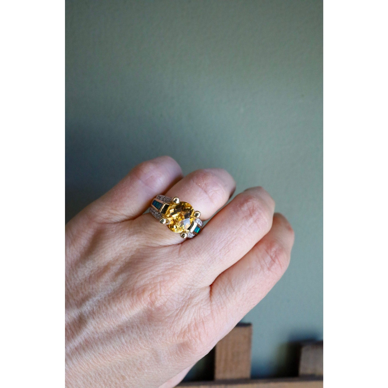 Substantial 14K Yellow Gold Citrine, Diamond & Opal Ring