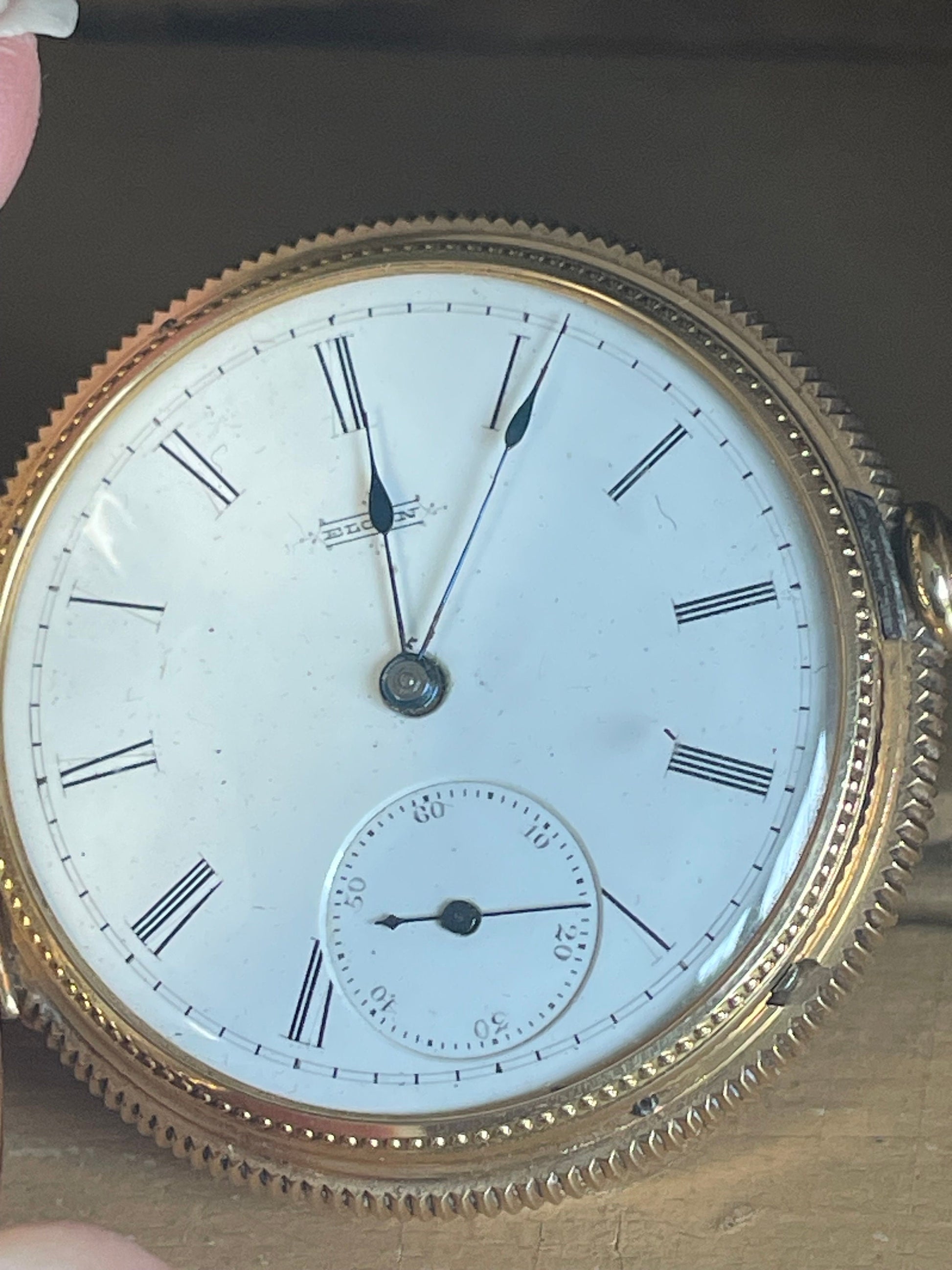 14K yellow gold Elgin pocket watch. Engraved Floral/house Motif front and back engraved Bella with coin edge.