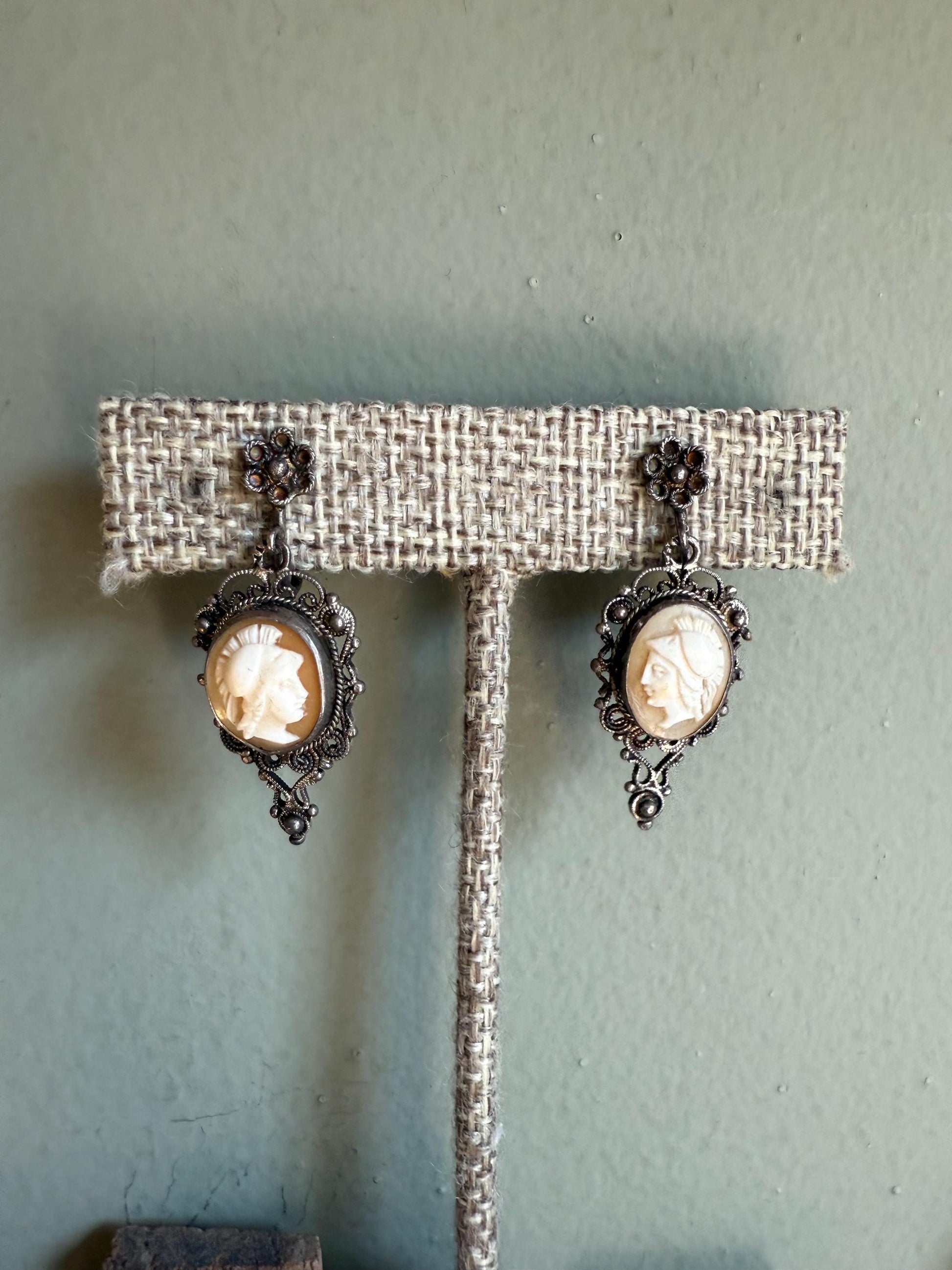 900 silver handmade dangle earrings featuring carved conch shell cameos depicting Athena the god of war. Beautiful setting with milgrain and scroll work. Dangles from a flower with screw backs. These can be converted to wires. I have not polished tham at all-so you are seeing them with patina. They can be hand polished with a cloth to brighten the silver. 1 1/2" top to bottom and 9/16" wide.