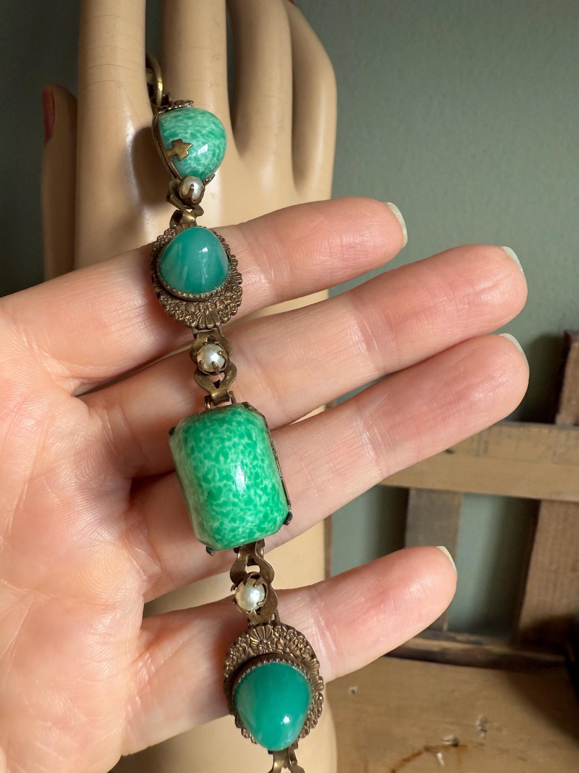 A great example of peking glass (art glass that resembled jade) made during the art deco period. This bracelet features links set with cabochon shaped glass. There are also costume pearls set inbetween. Fold over clasp in good working order. 7.75" length x 1/2" width.