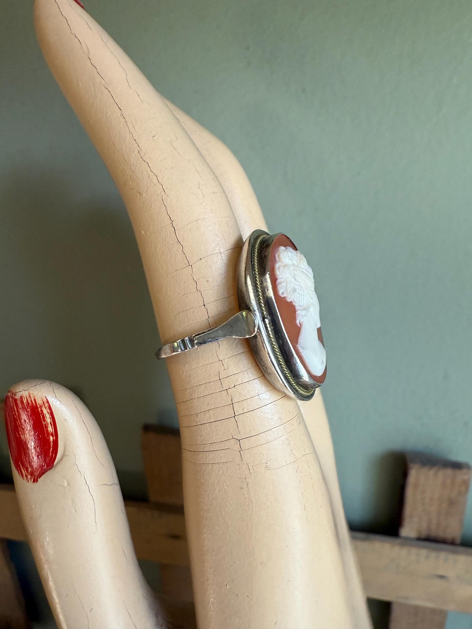 Sterling silver ring (tested) set with an oval hand carved shell cameo of a lady in profile) measuring approx. 3/4" x 5/8" bezel set with a brass color twisted rope frame.