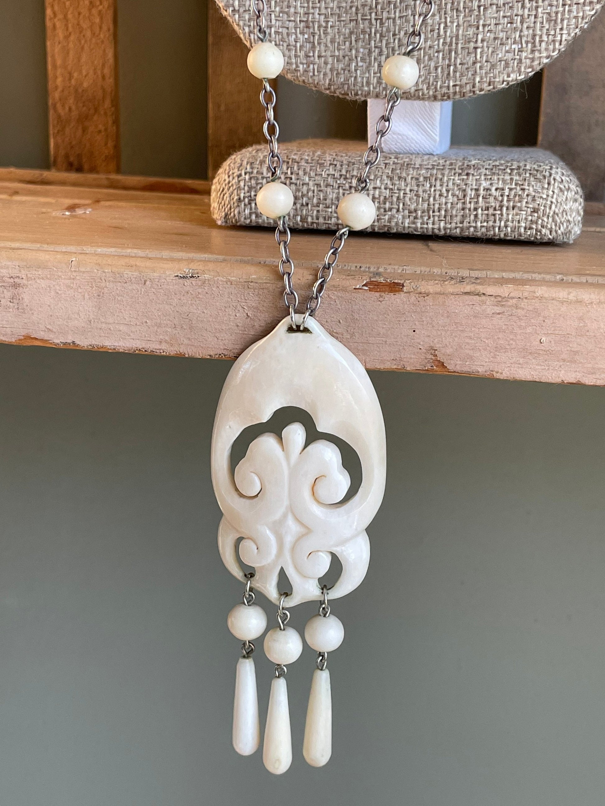 Interesting large carved pendant hangs from a silver tone chain with beads. Slips over the head. Chain is 28" and the pendant is 4" long.