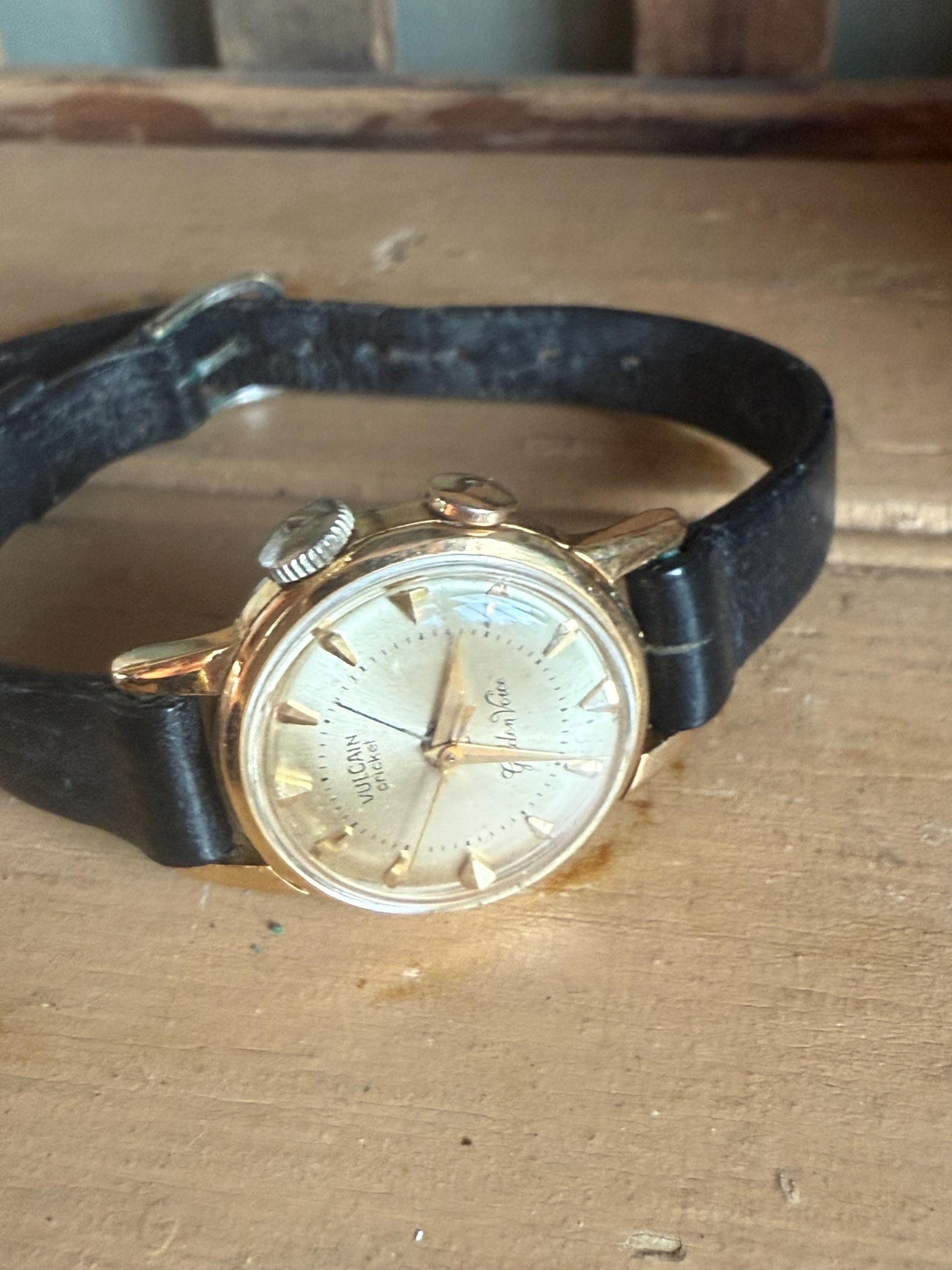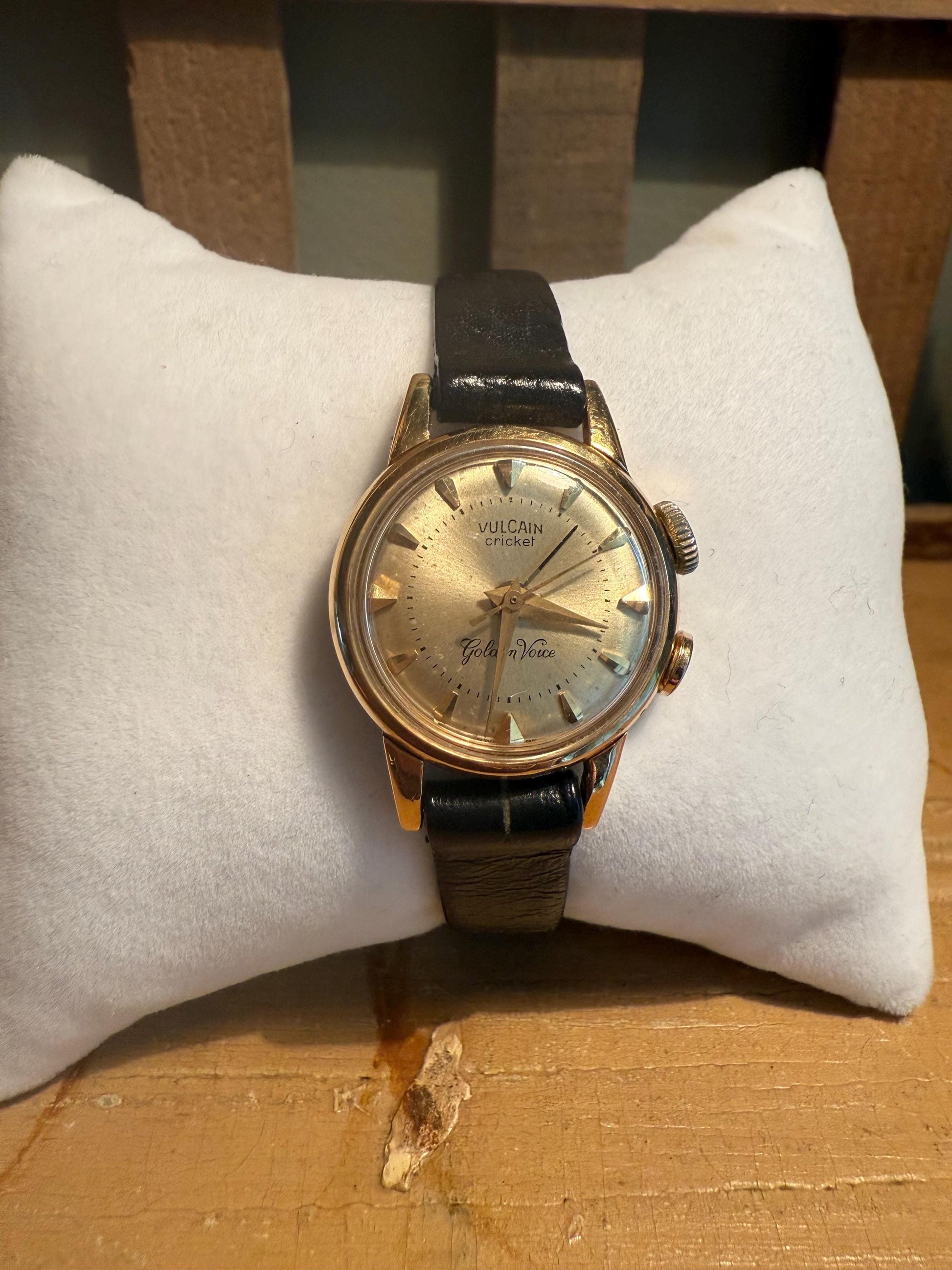 c1960-Ladies manual wind for alarm wrist watch. The Vulcain Cricket Golden Voice Watch is a vintage timepiece with an alarm. The watch was looked over by a watchmaker. It has been running for days keeping good time. The alarm does work. Made in Switzerland. The case is 22.74 mm. There is a vintage black leather strap with silver tone findings.