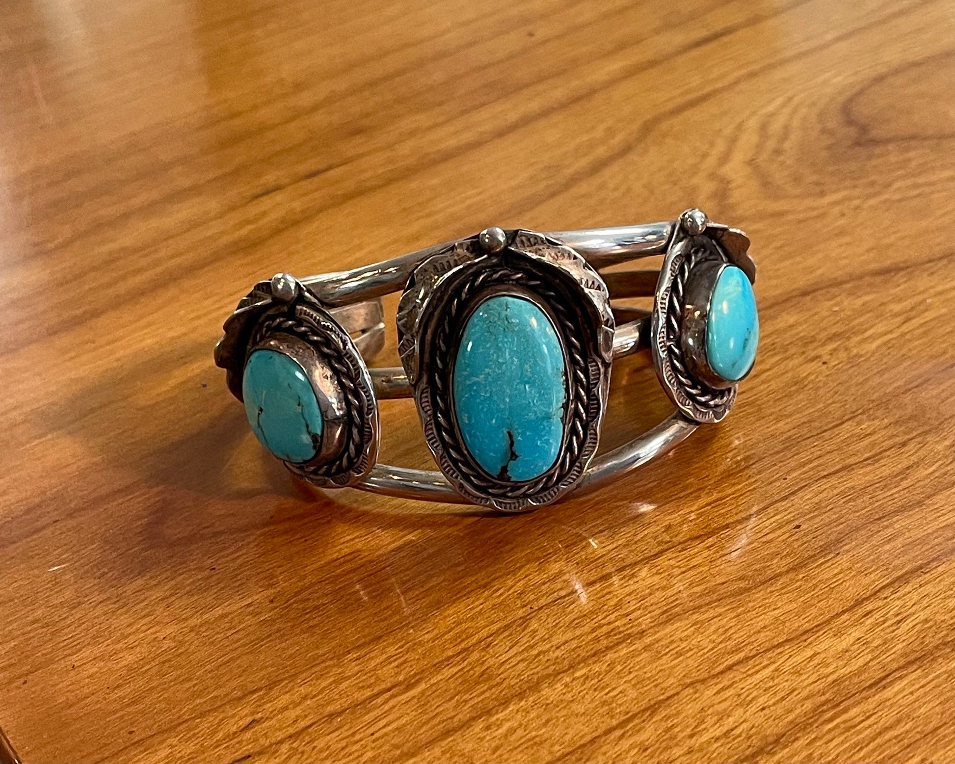 Solid sterling silver Navajo cuff. Three gorgeous intense colored turquoise bezel set in decorative frames with twisted rope motif and leaves. Center stone measures approx. 24 x 14 mm. 52.49 grams