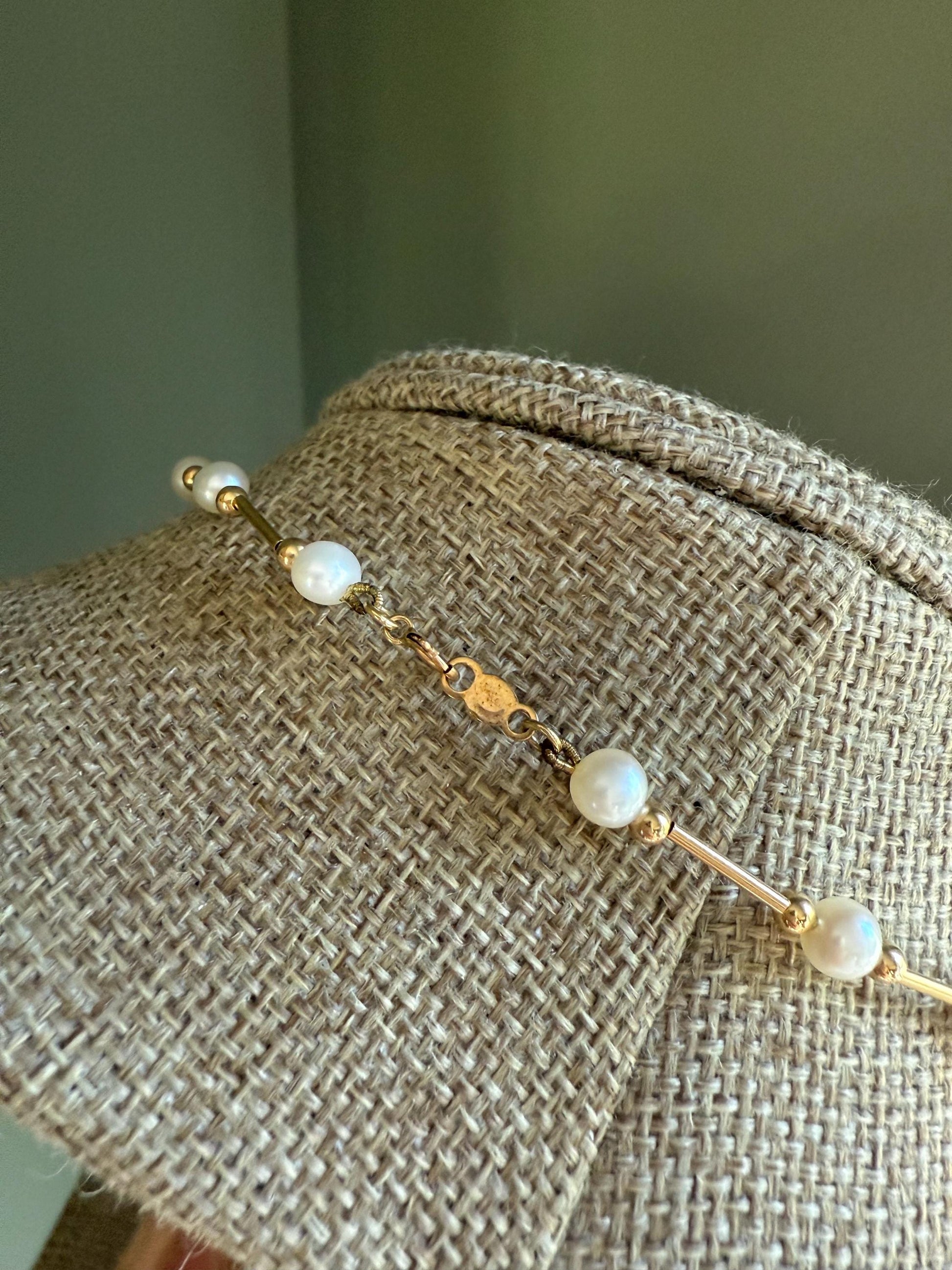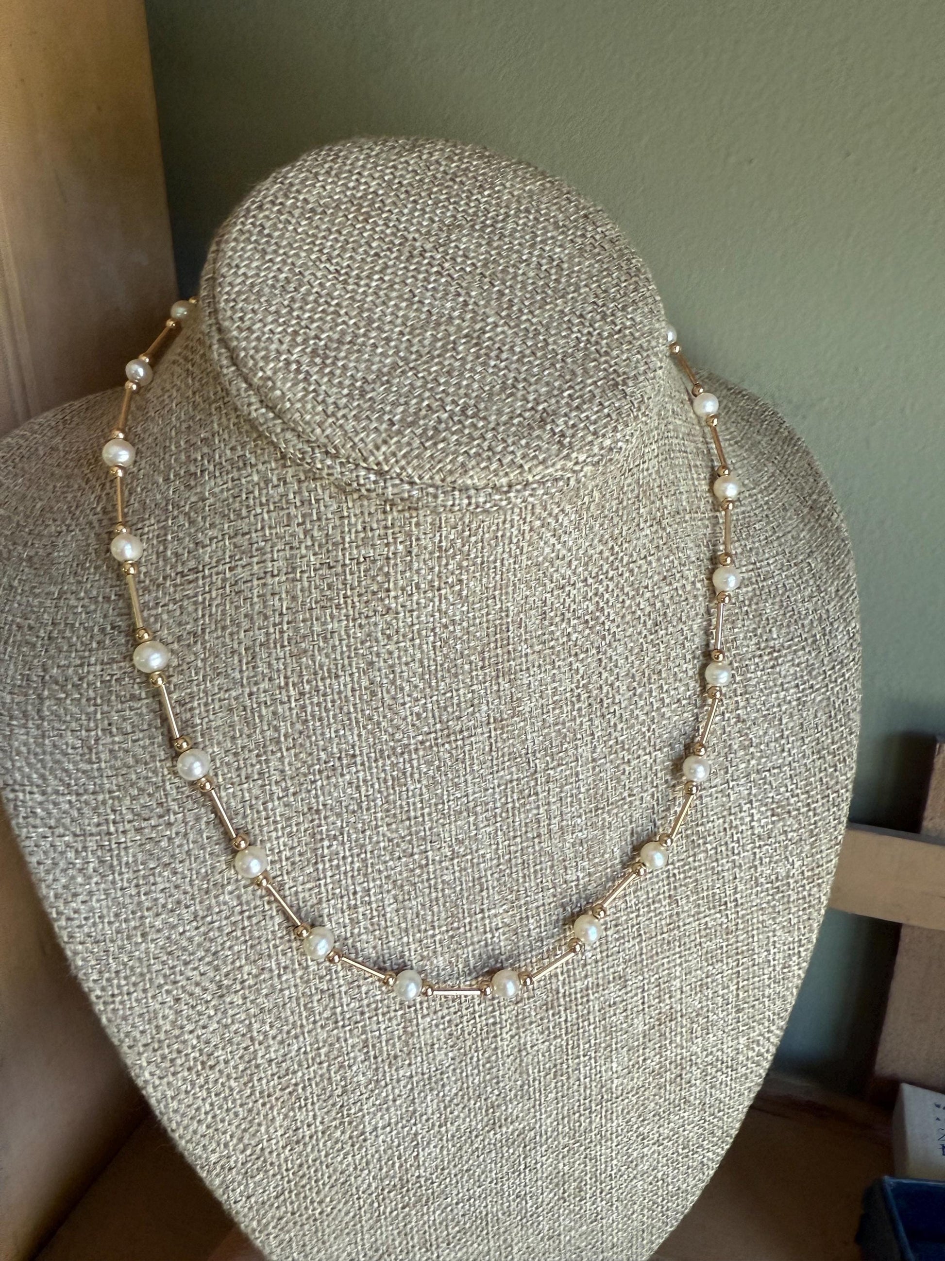 14K yellow gold necklace (stamped and tested) featuring gold elongated tubular links, gold beads and cultured pearls. The pearls measure approx. 5.14 mm each, the tubular links measure 3/8" length. The pearls are whitish with a hint of cream, well matched. Spring ring closure. 18" length.