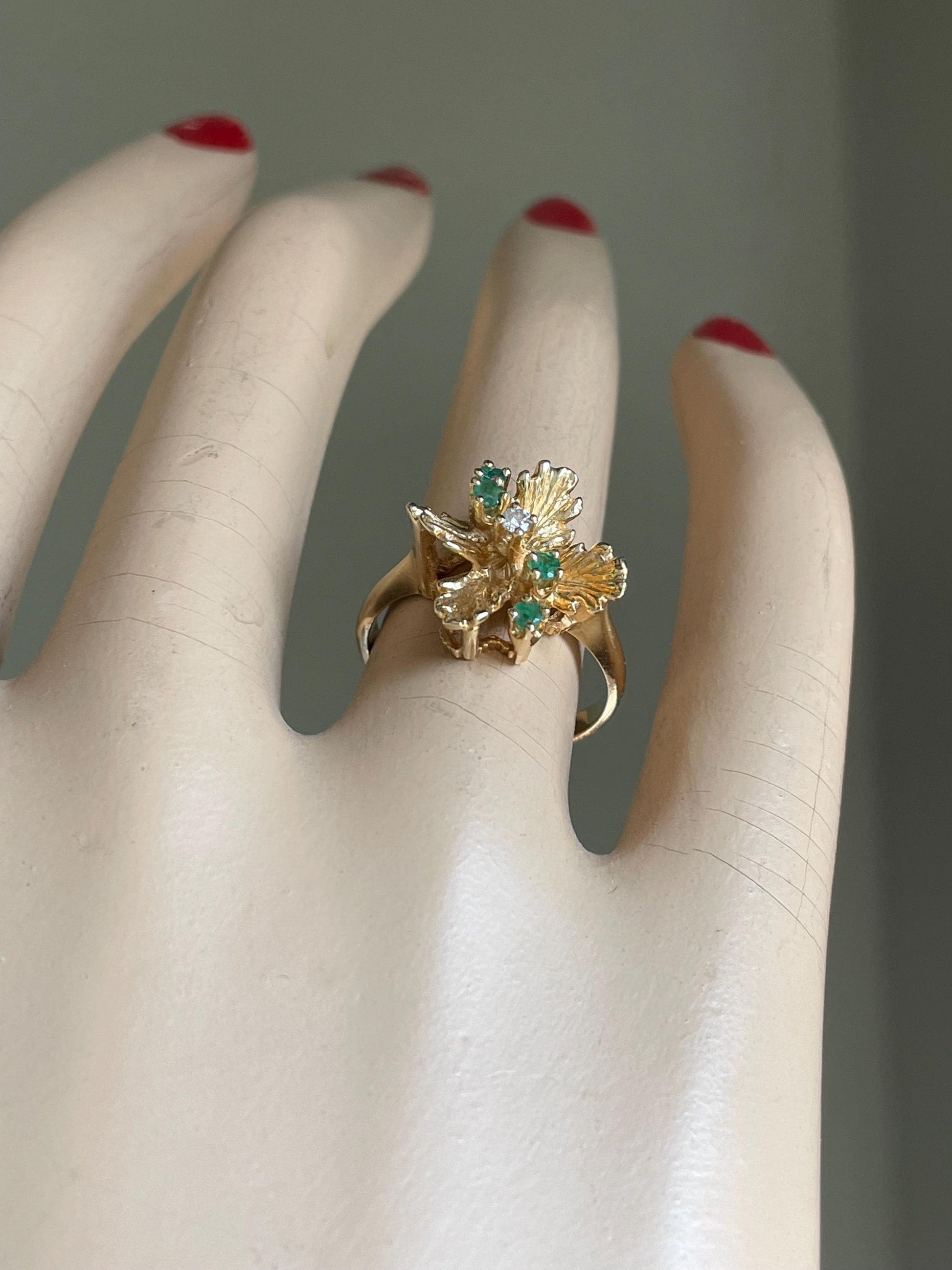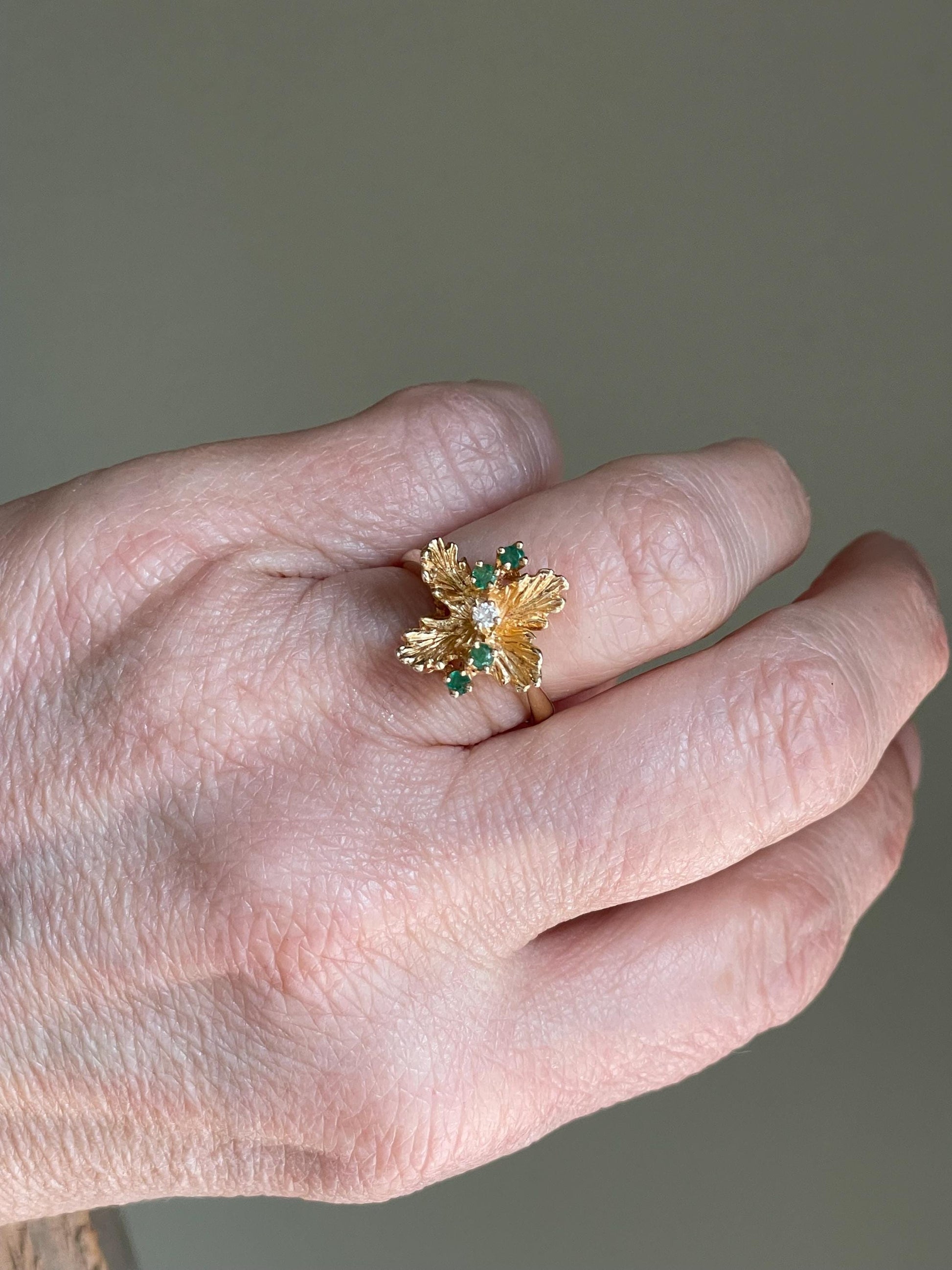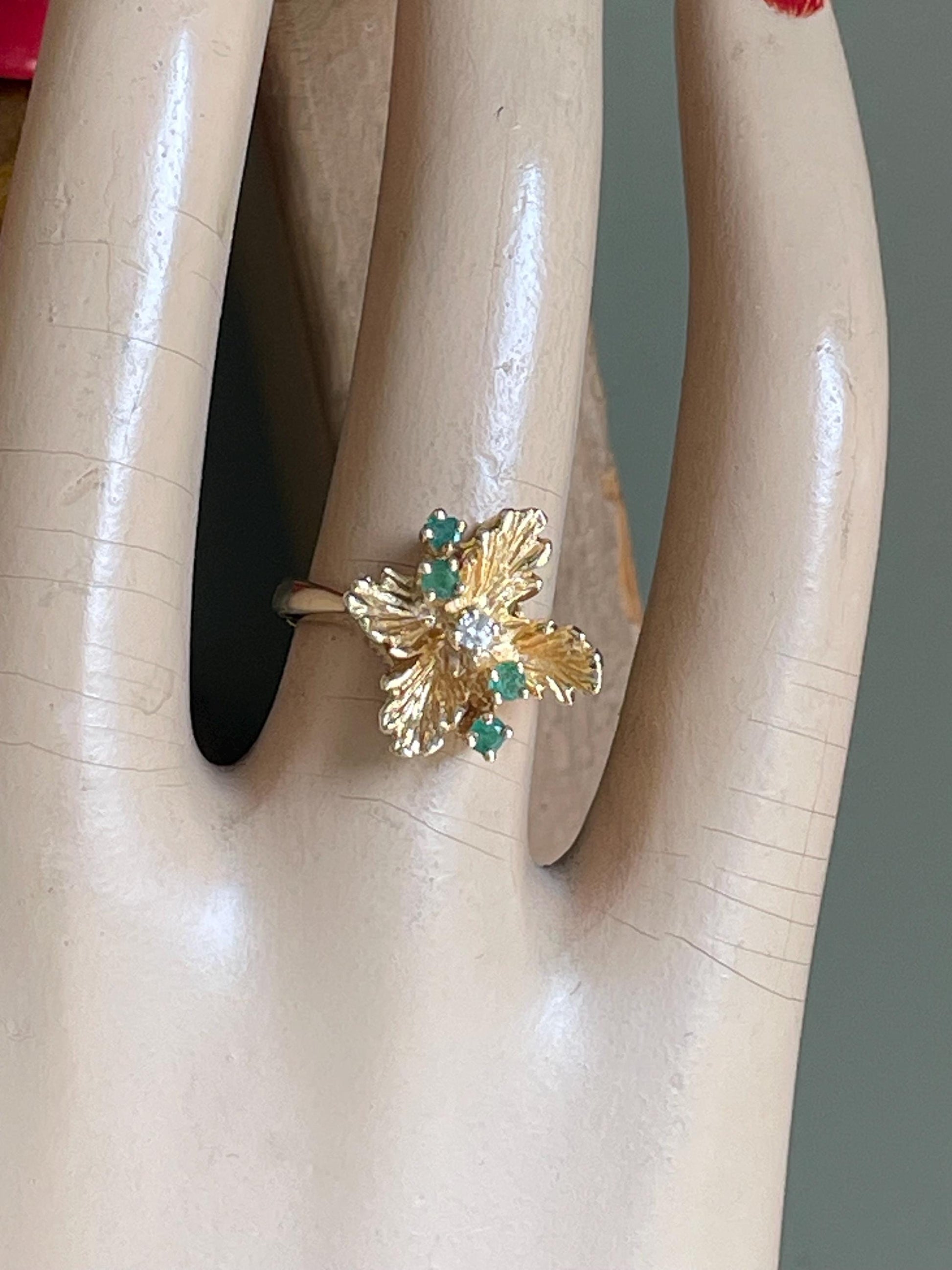 1980's 14K Vintage Textured Flower Emerald and Diamond Ring