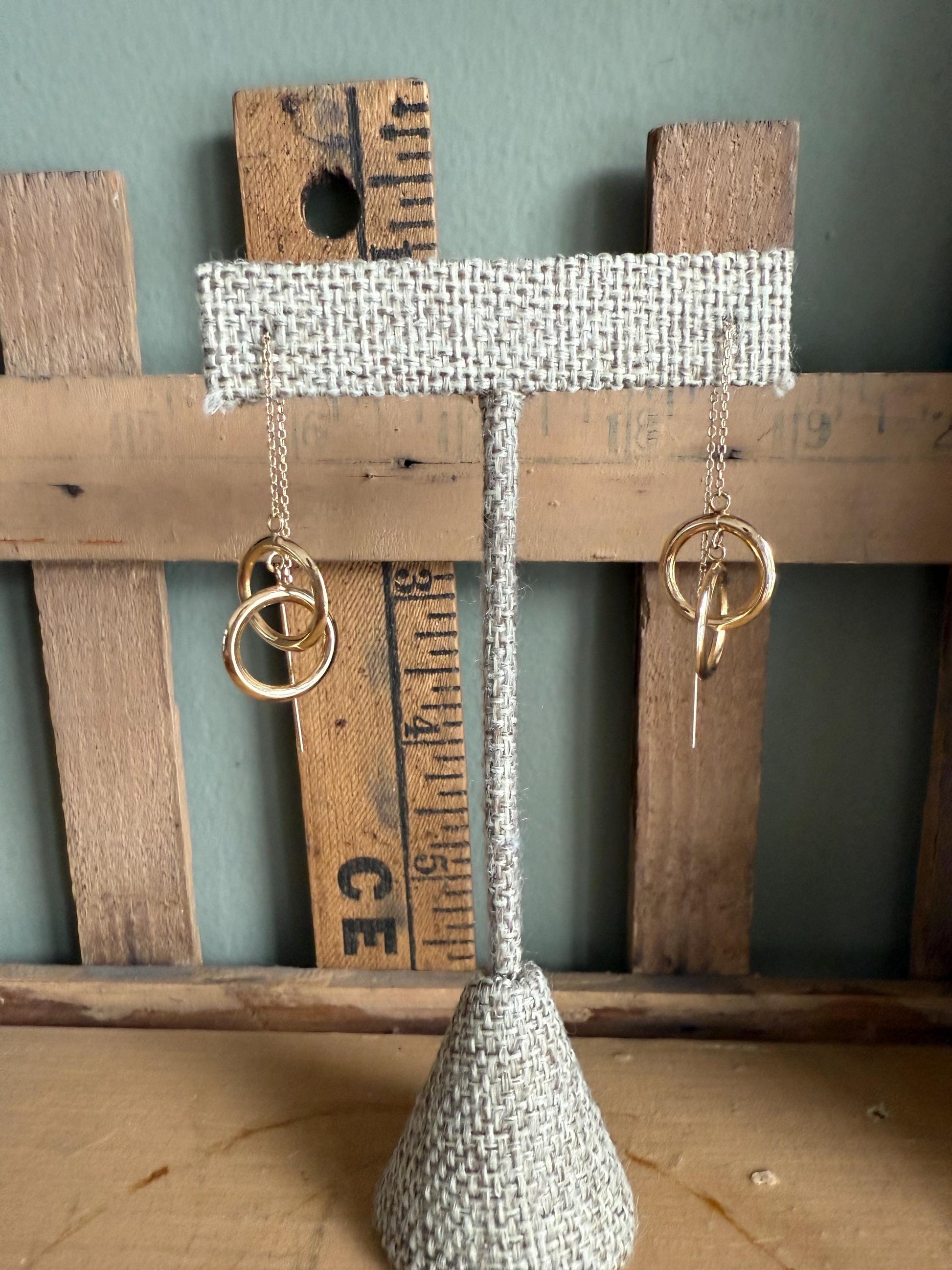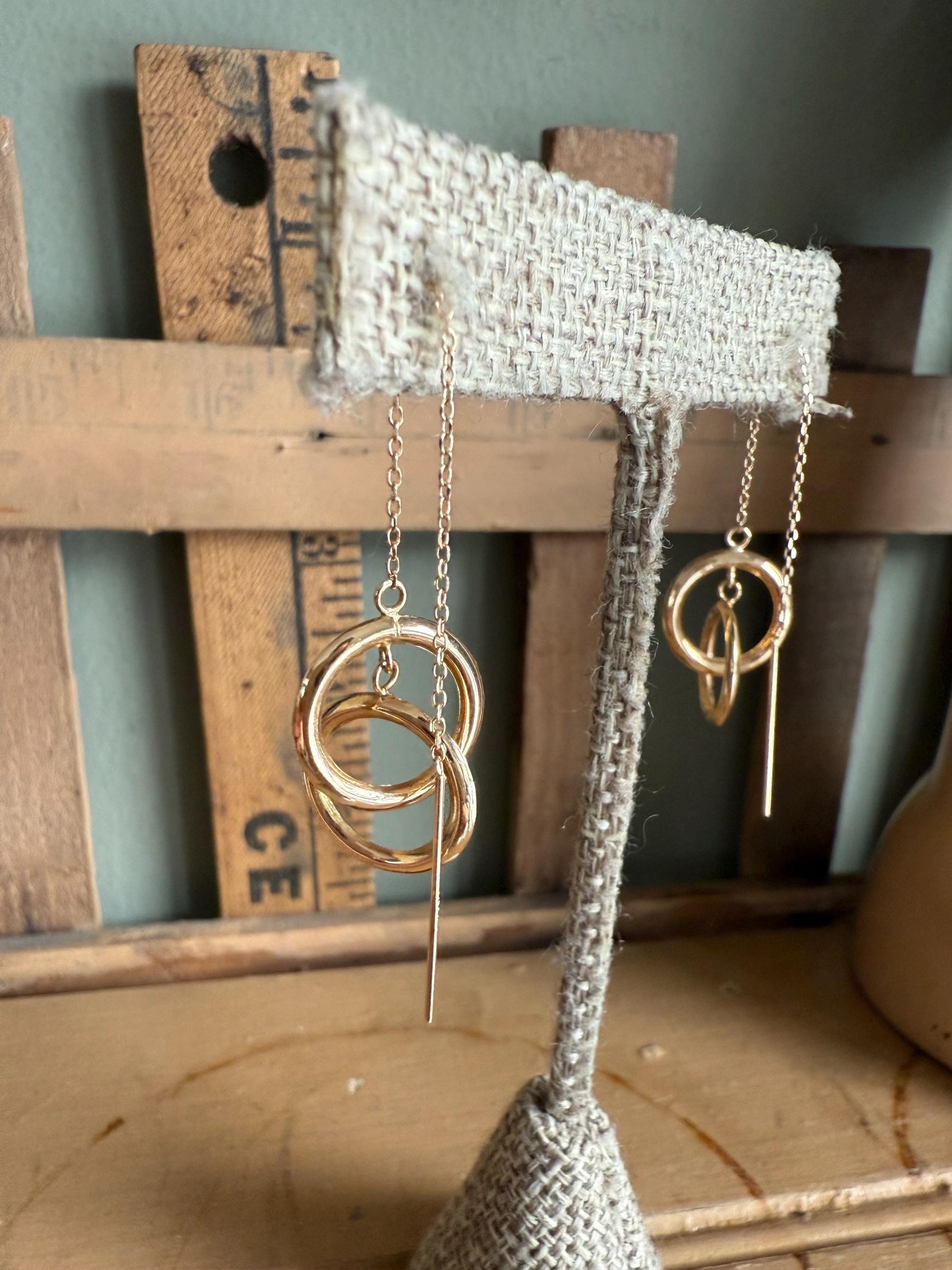 Vintage -stamped 14k on posts and tested. Threading style earrings with circles. 1/2" wide x 3 1/2" length. Excellent preowned condition. 1.3 grams tw