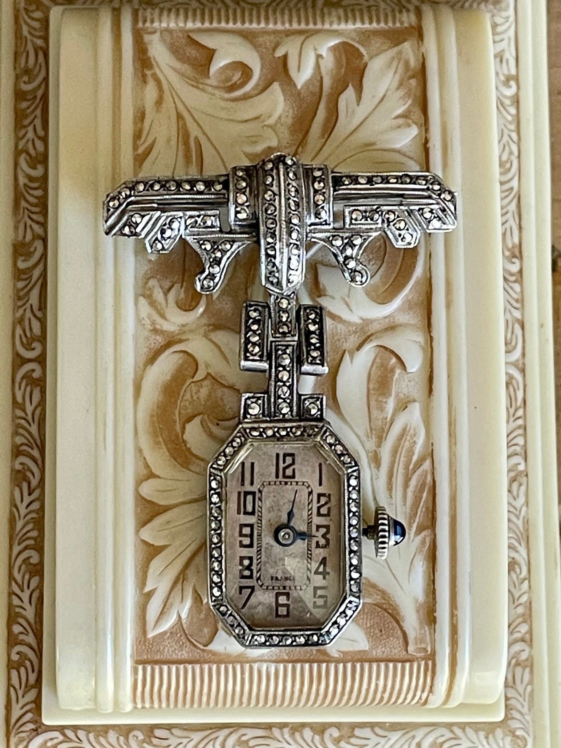 800 Silver Marcasite French Art Deco 1920 Watch Brooch