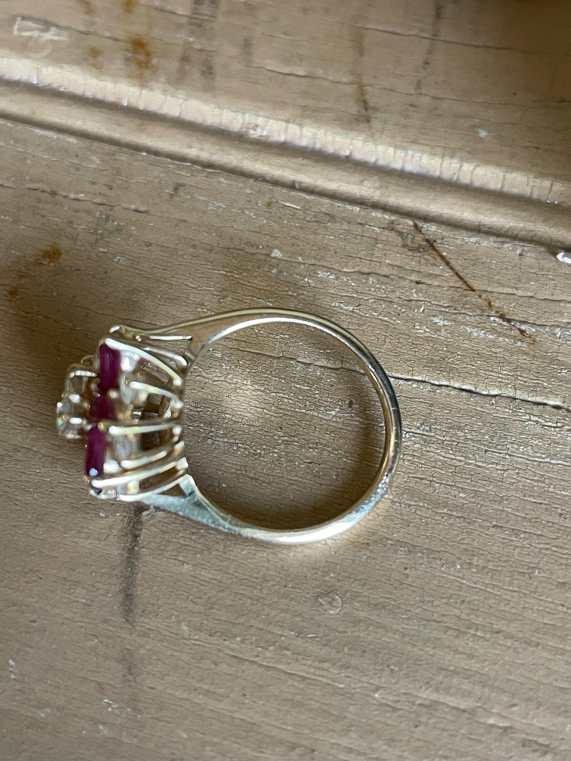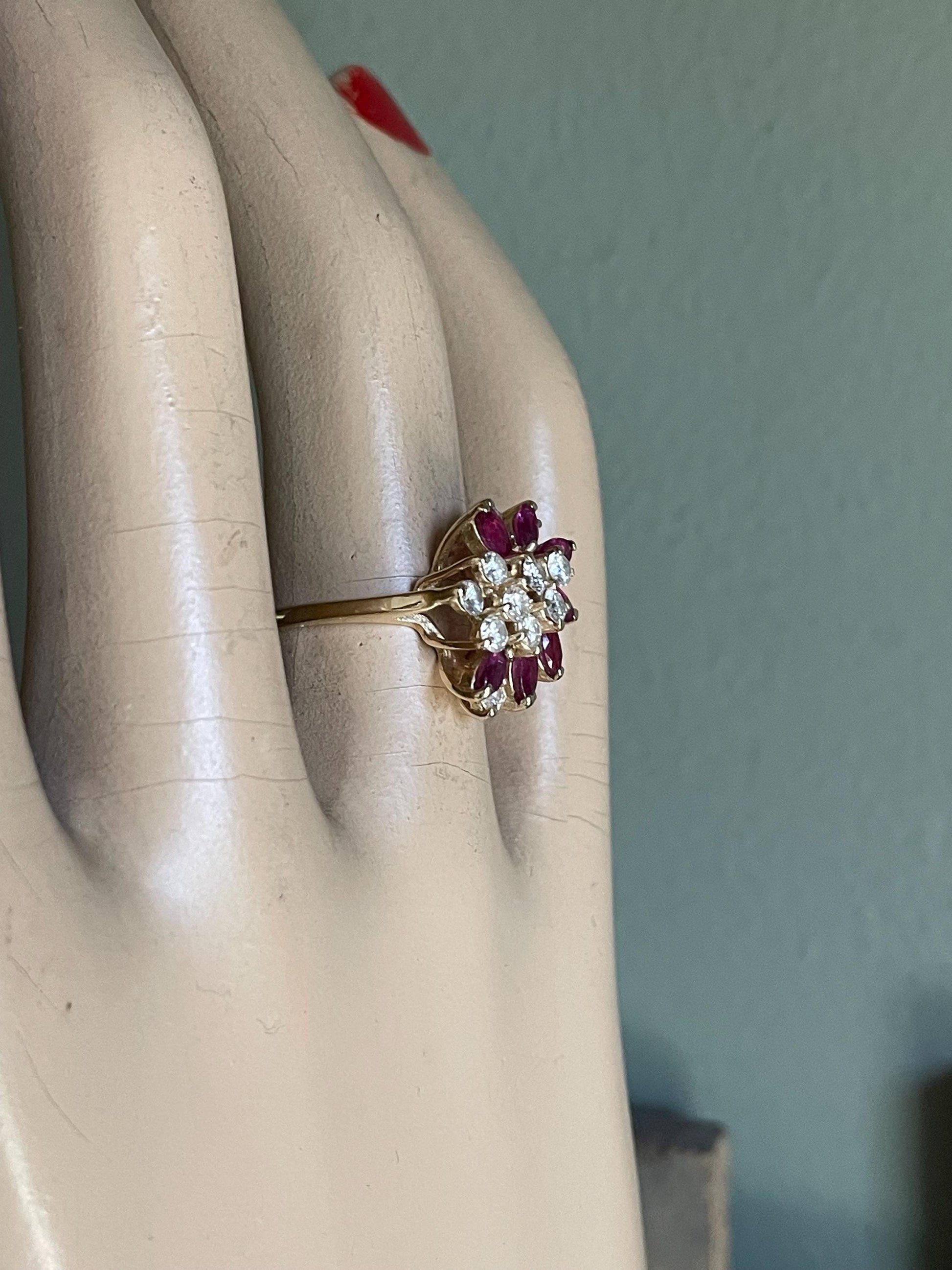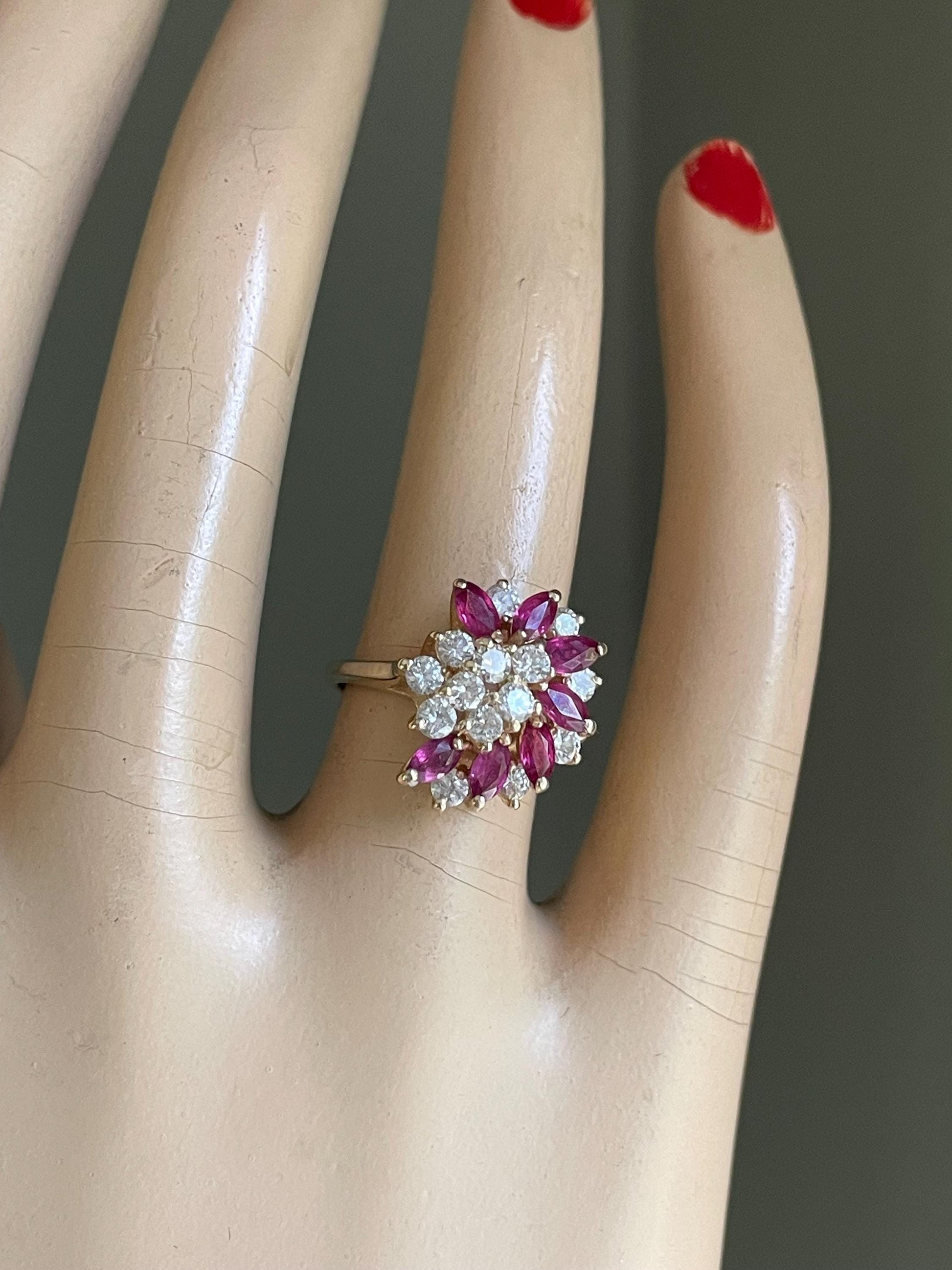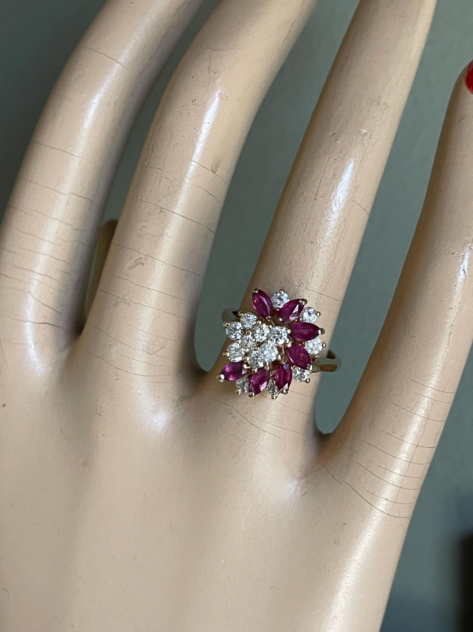 The 14k yellow gold (stamped in shank and verified) features a dramatic spray of marquis cut rubies and bright white round brilliant cut diamonds. Under magnification I do see natural inclusions in the rubies. They are a med- dark reddish pinkish hue. The marquis cuts measuring about 4 x 2.3 mm each, .12 cts each, approx. .84 ctw. The round brilliant cut diamonds are near colorless-around h color, vs-si clarity. Approx. 2.3 mm diameter, approx. .70 ctw.