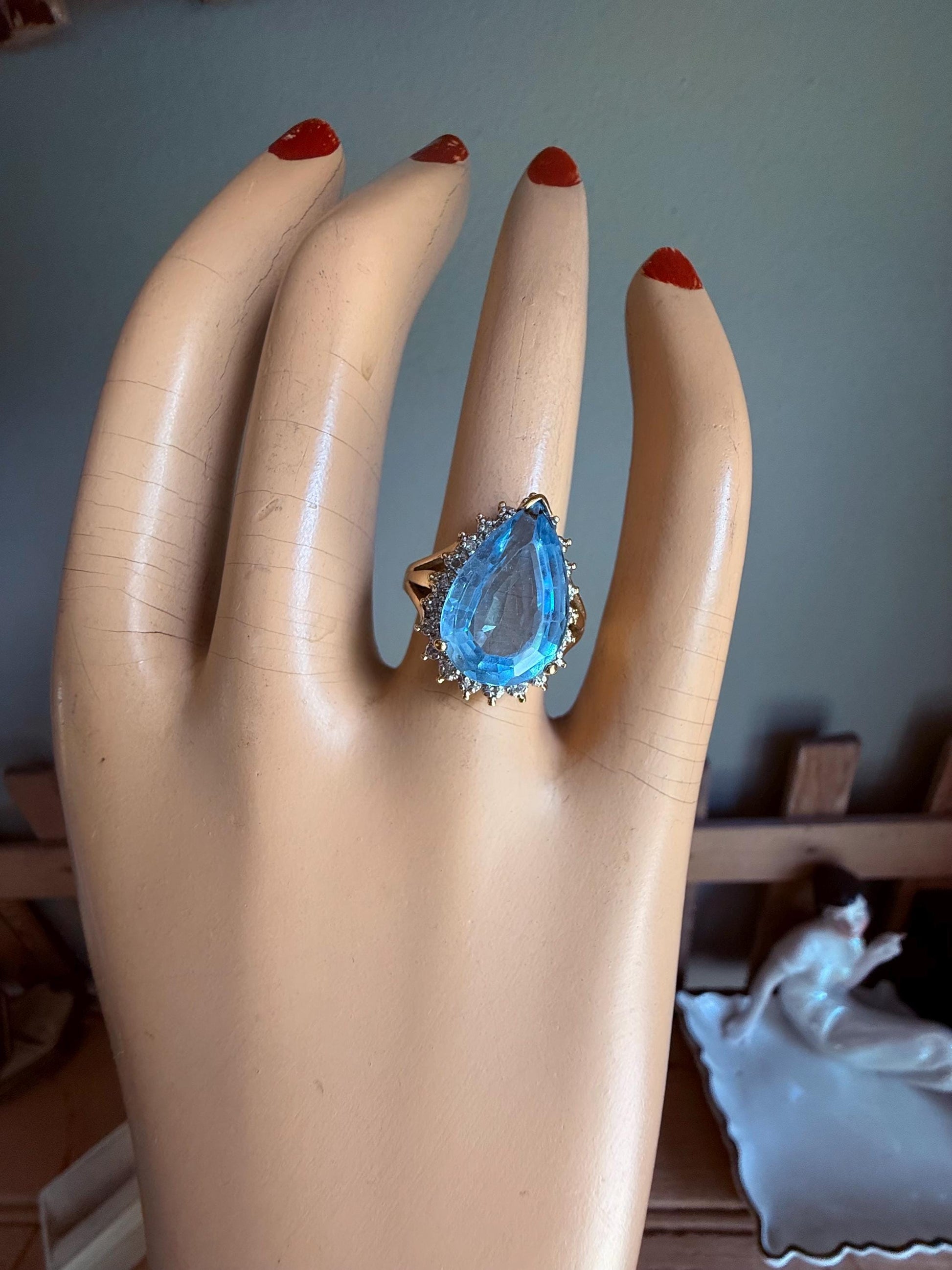 A Large Pear Shaped Blue Topaz Diamond Halo Ring in 10K Yellow and White Gold
