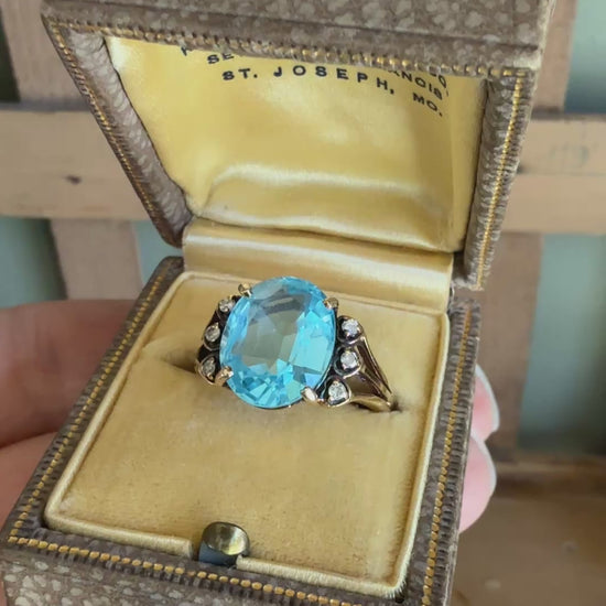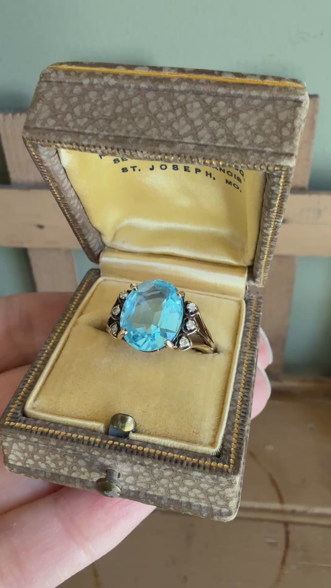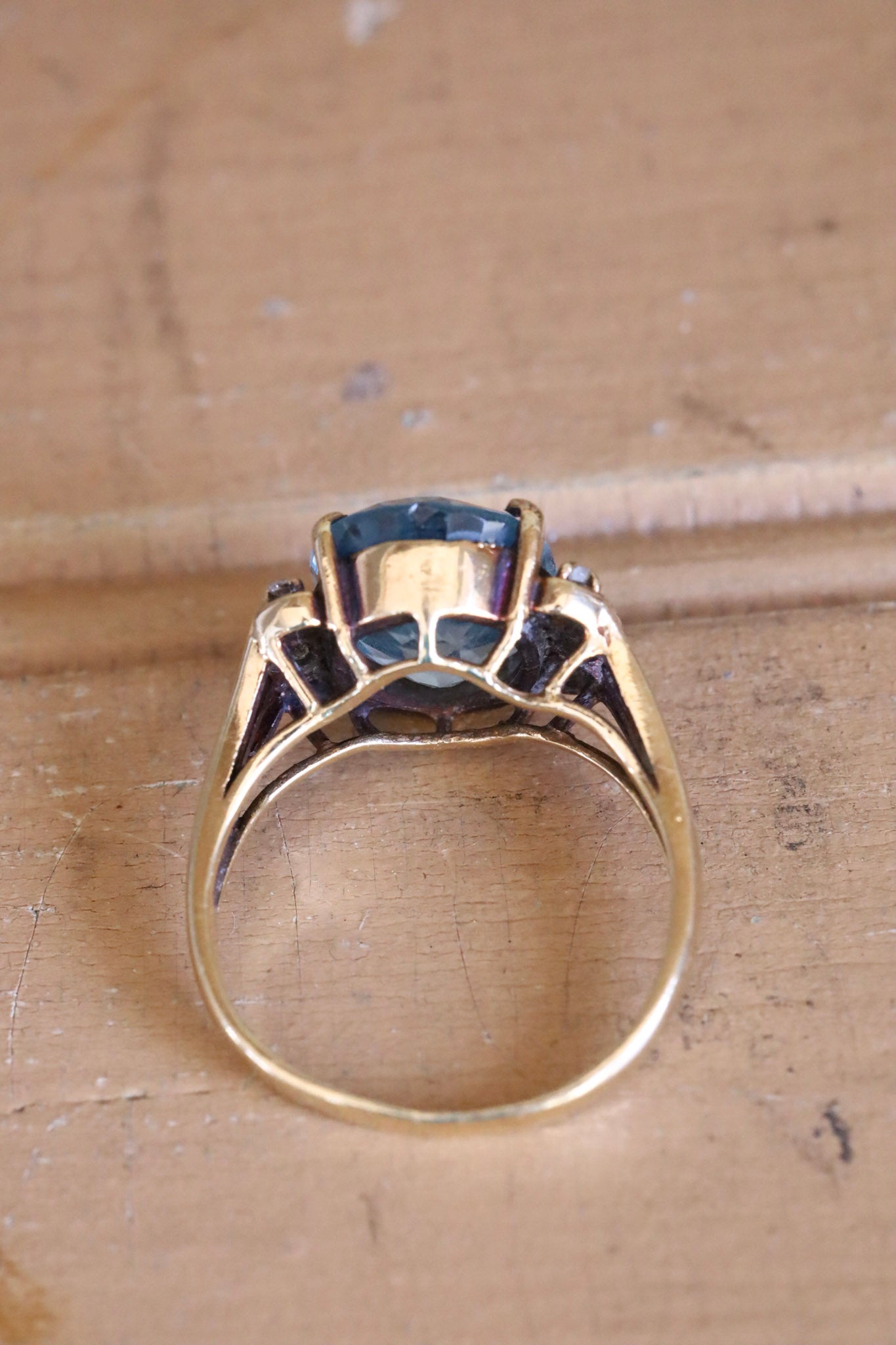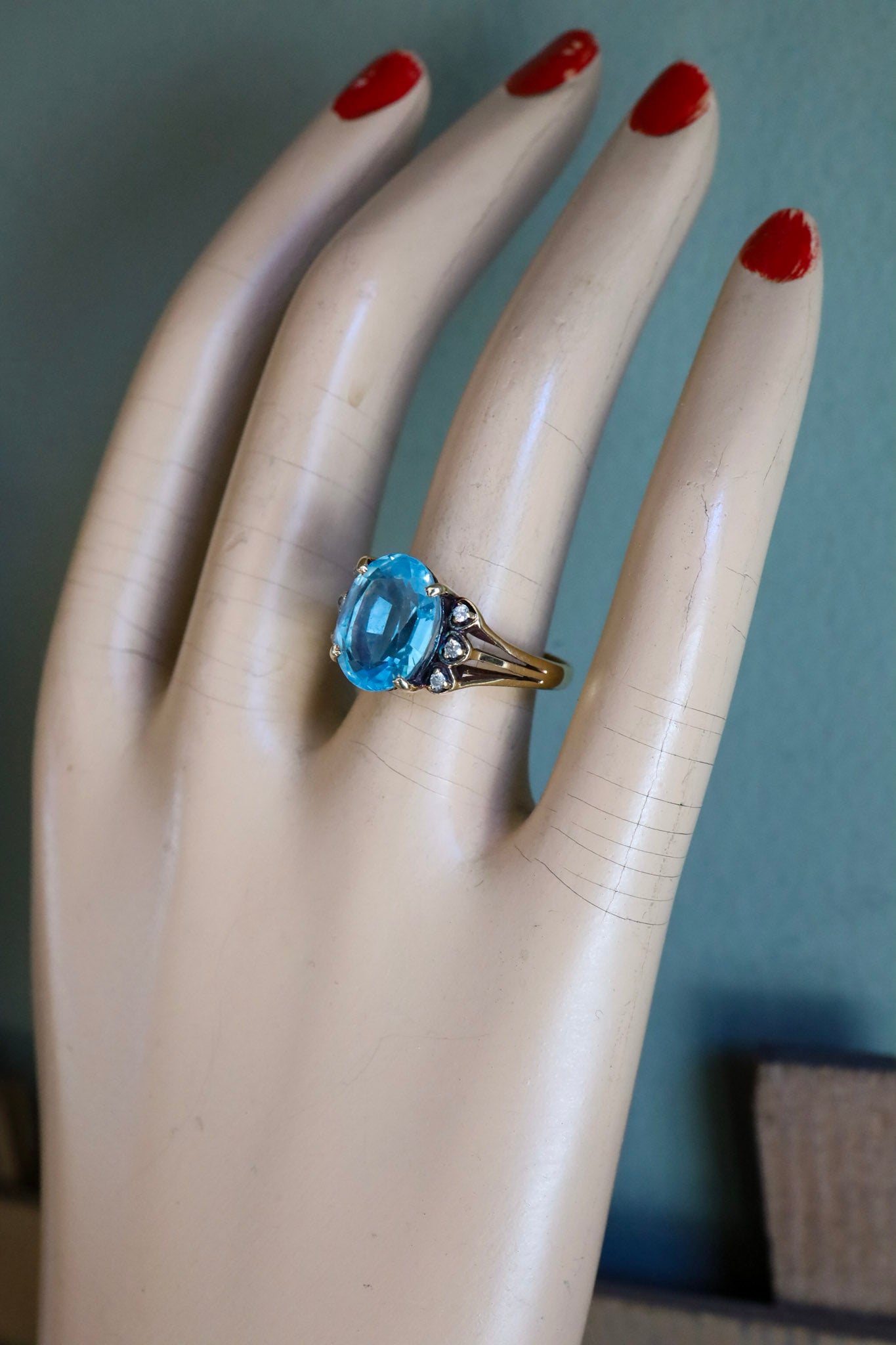 This ring has a beautiful color-photographs are not quite catching it -its what today we call a London blue topaz hue.
