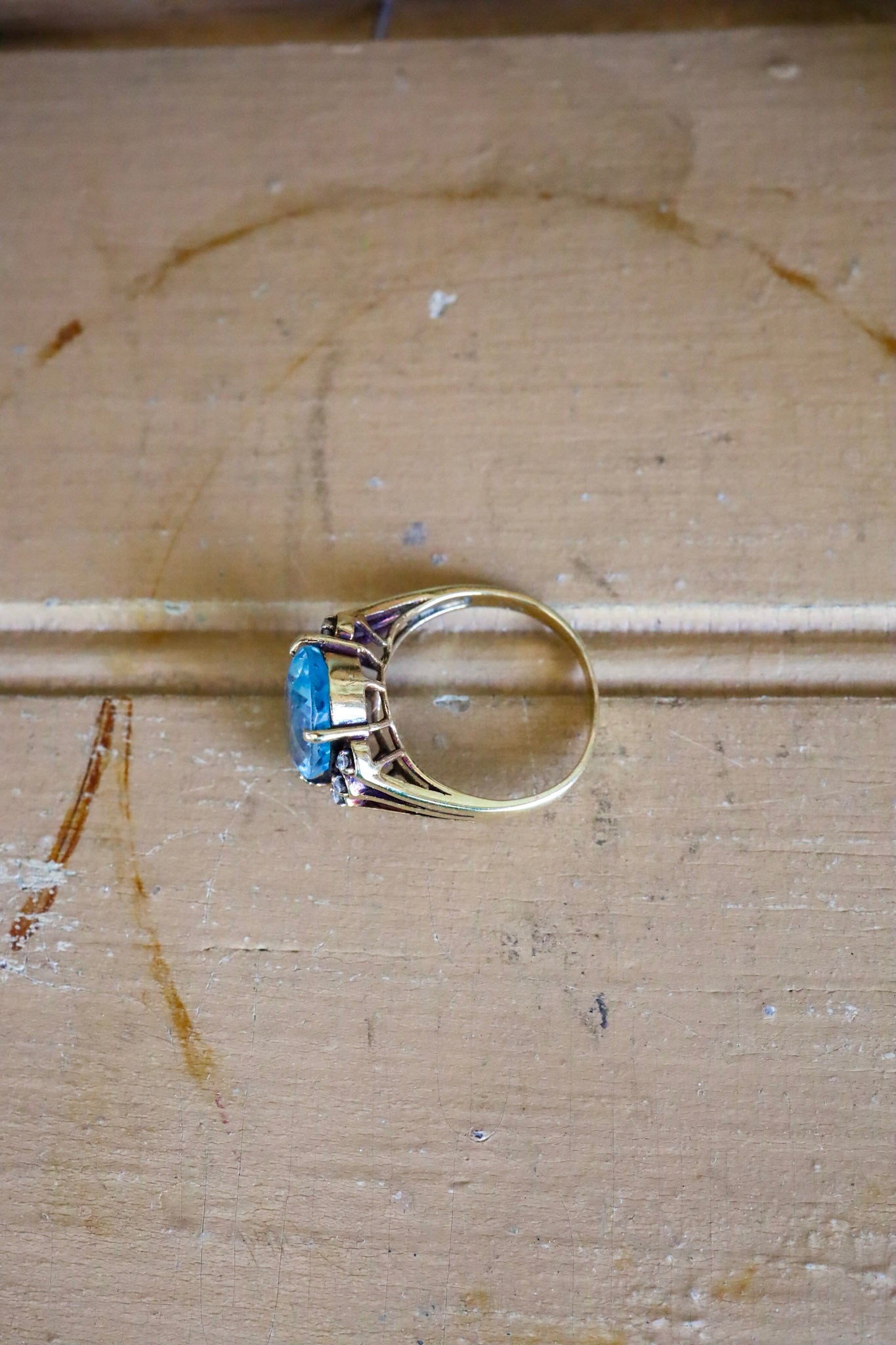 A Mid-Century 14K Yellow Gold Oval Blue Topaz and Diamond Ring