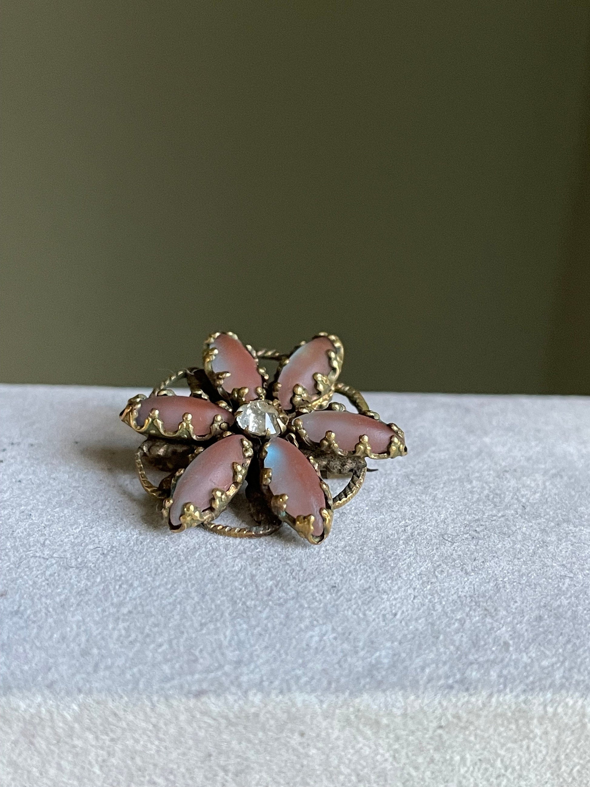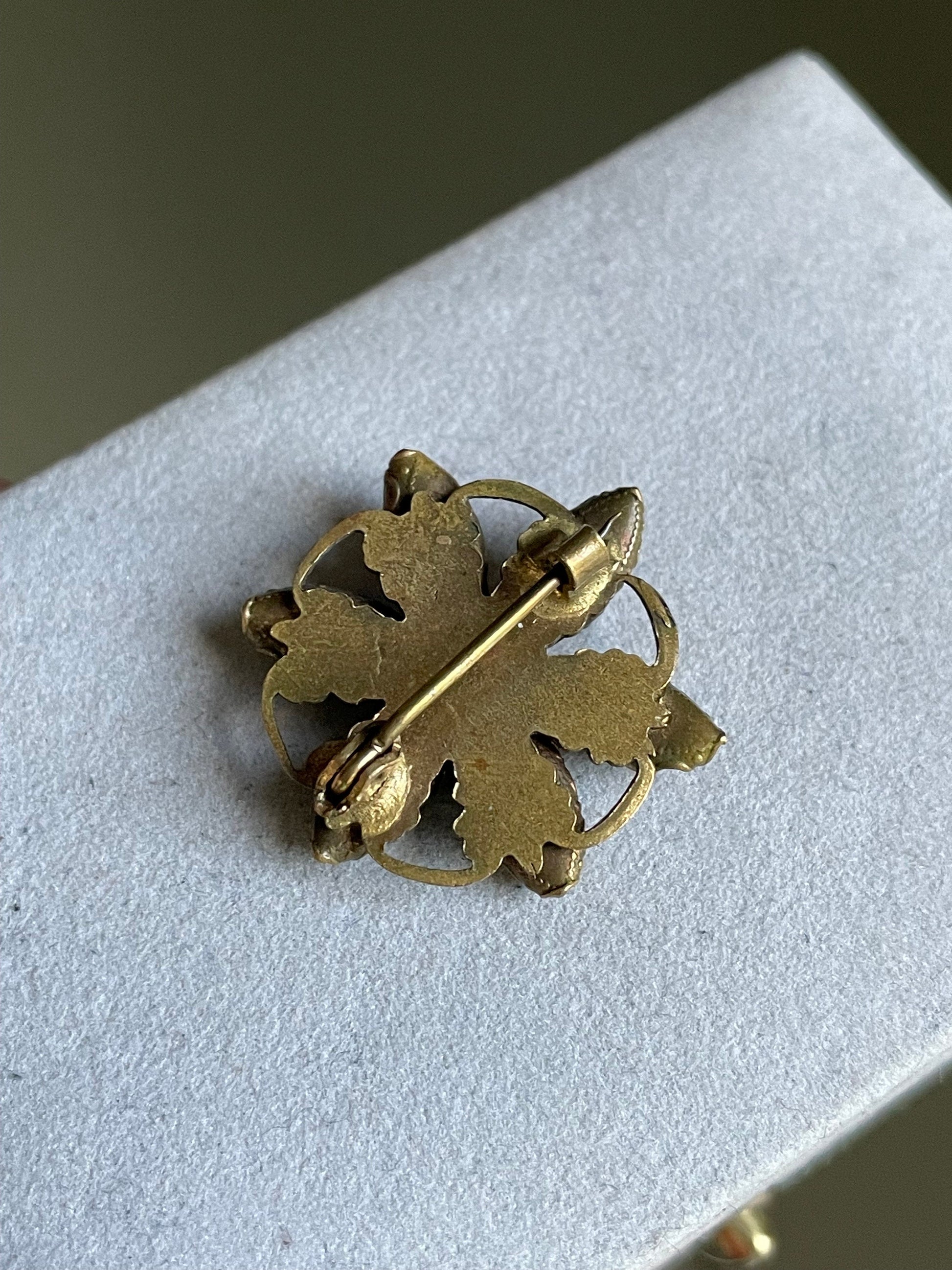 Rare brooch featuring saphiret which was made from pure gold and glass in Czechoslovakia around the turn of the century. Excellent antique condition. Measures approx. 1” diameter.