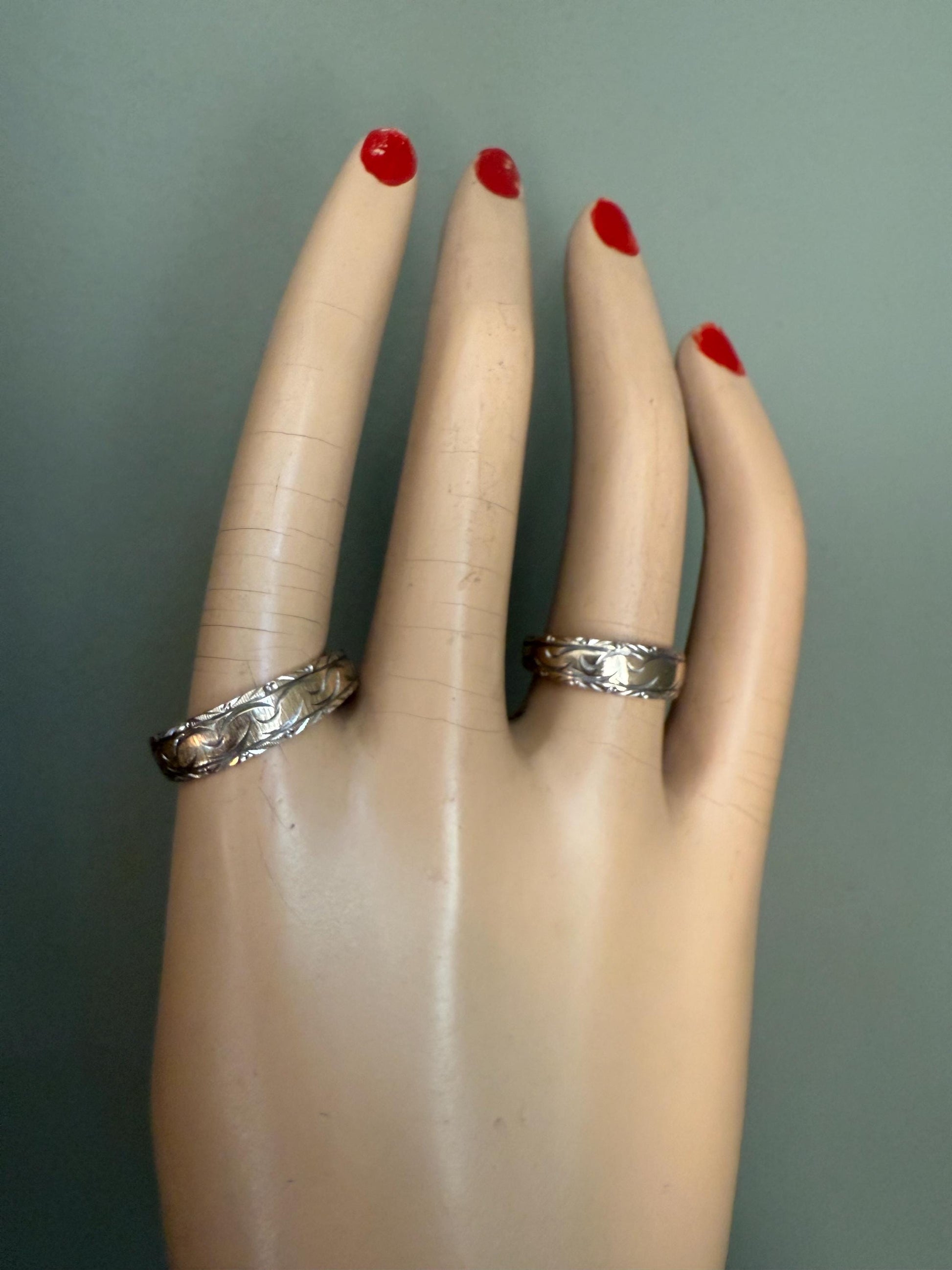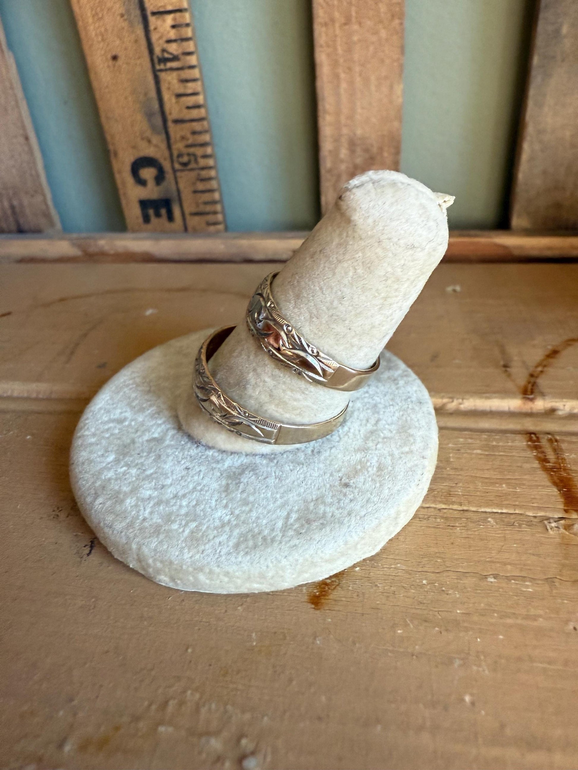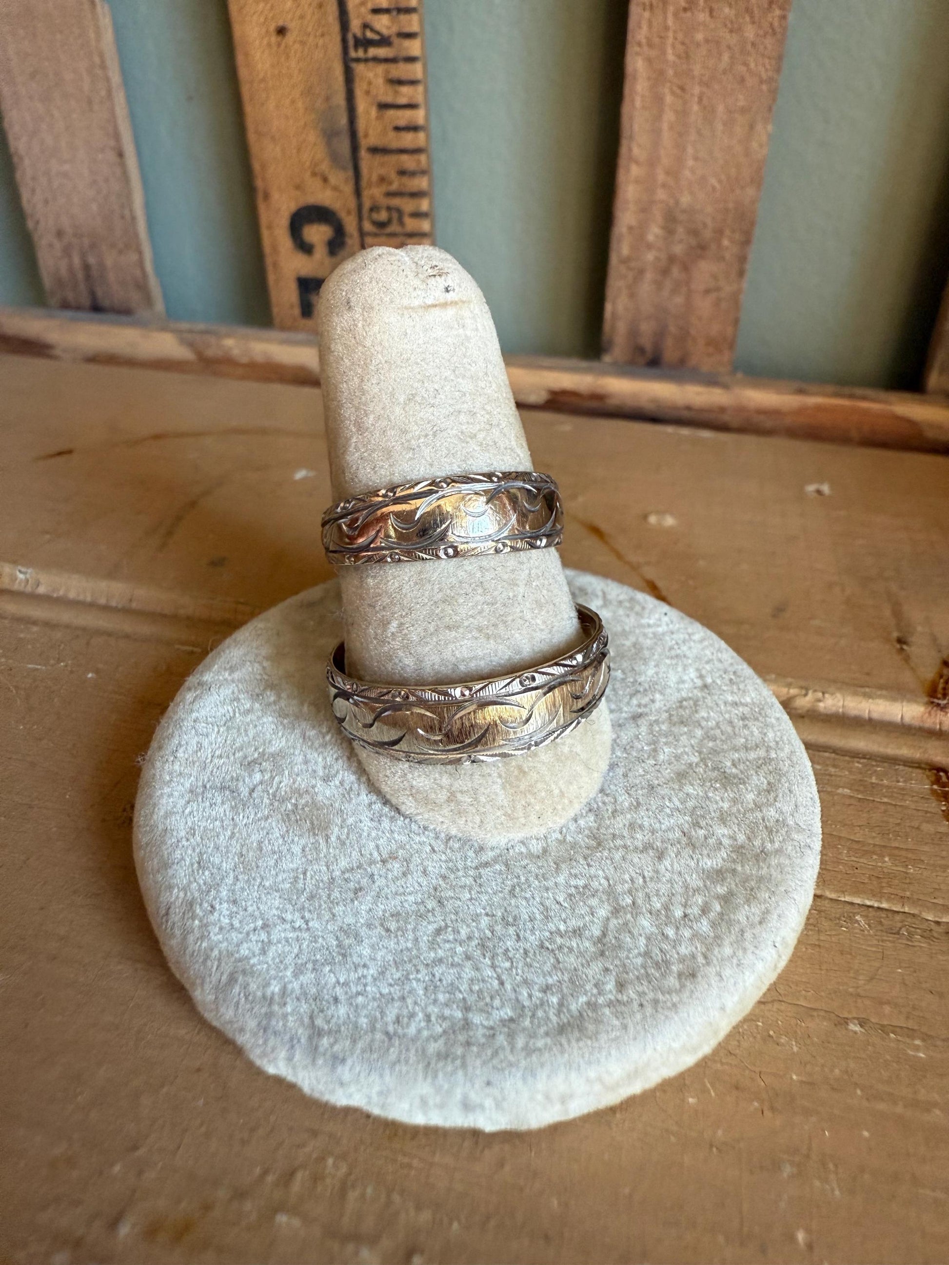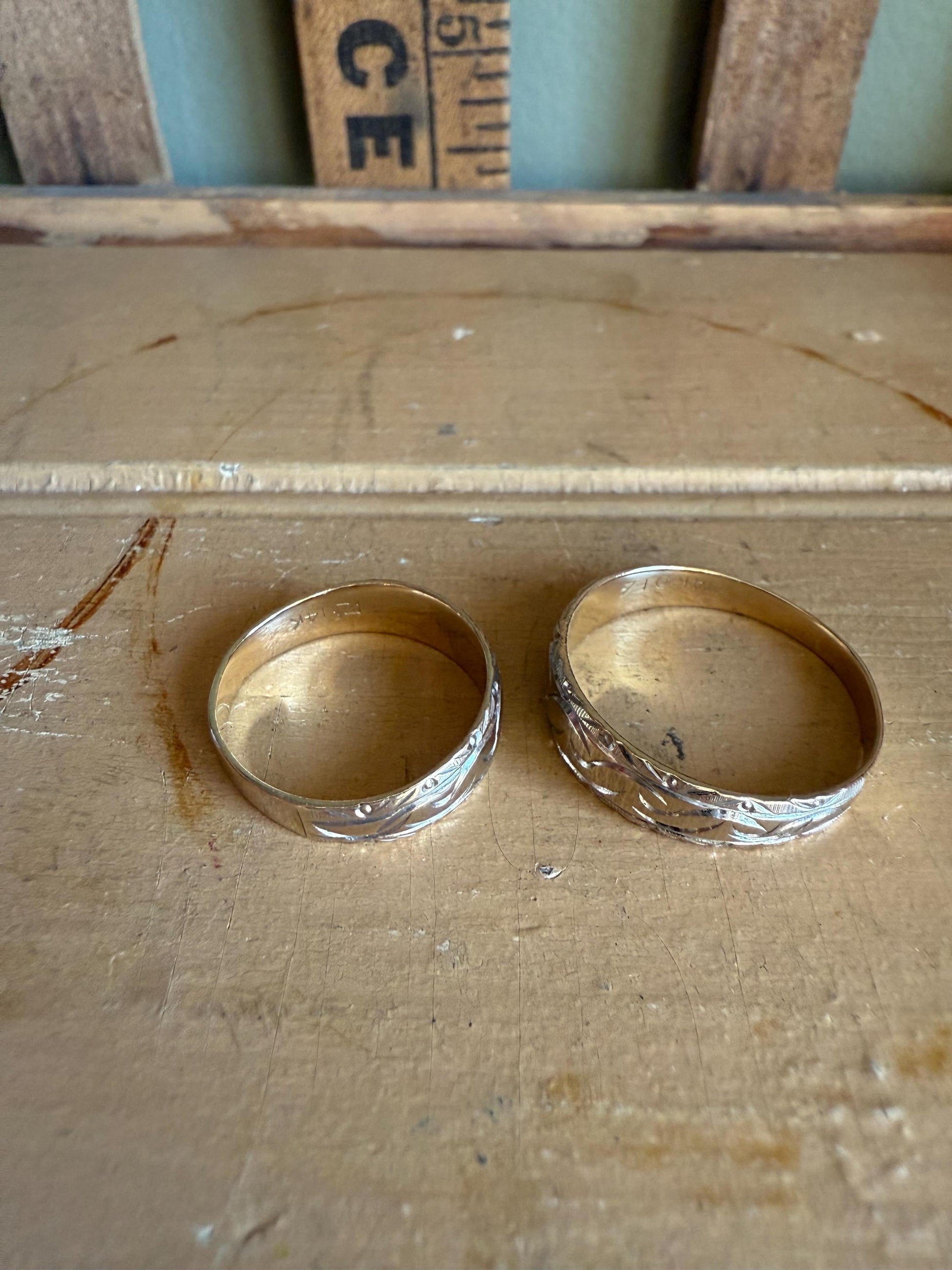 A Rare Matching Mid Century Bi Color 14K Engraved Wedding Bands