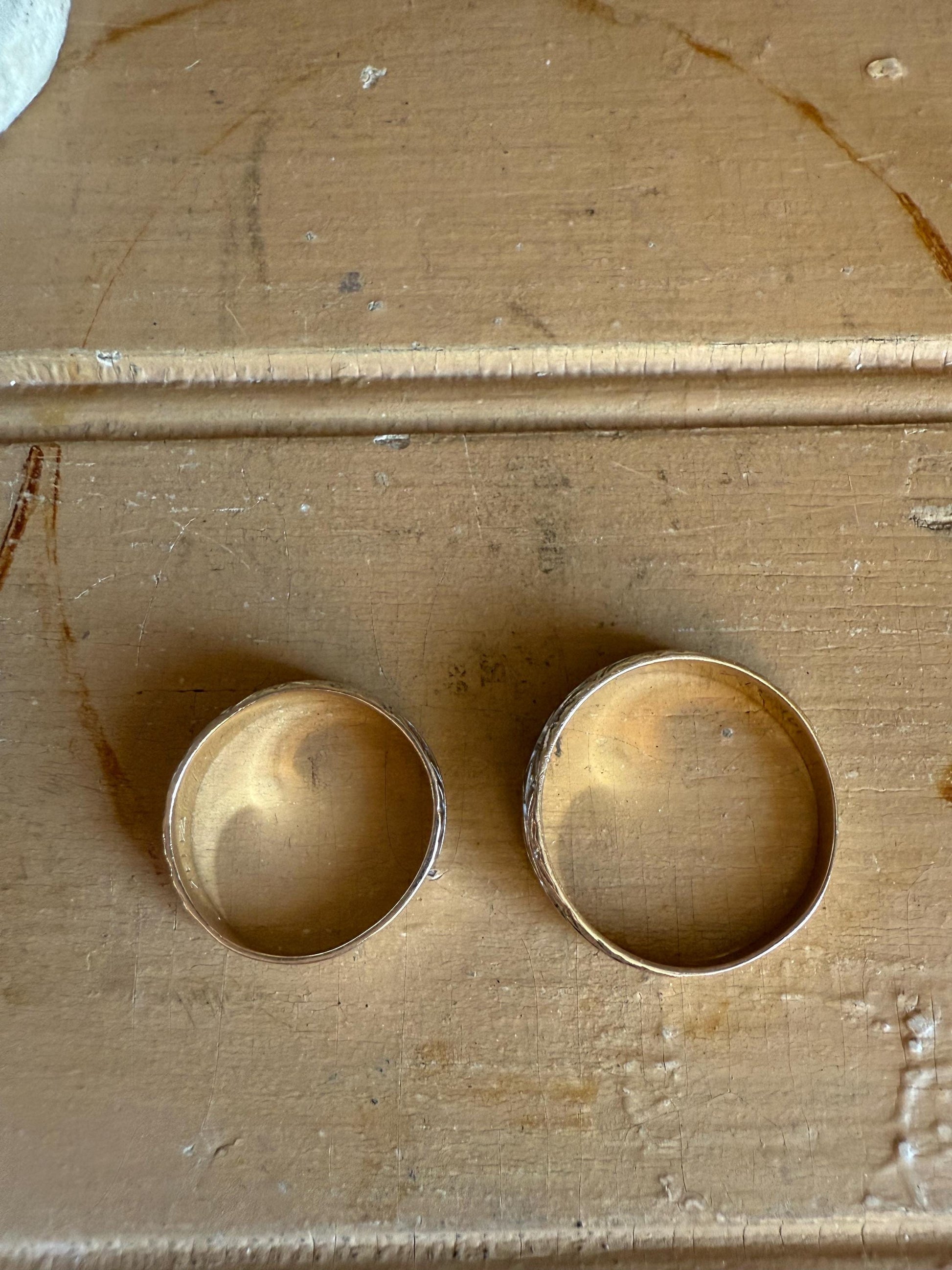c1950 -So rare to find a matching vintage set. Both stamped 14K and tested. Yellow gold centers with engraving with white gold edges with scroll engraving. The lady's front measures 5.91 mm and it is a size 7 and the men's 5.89 mm size 11. Both are sizable-reach out for a quote. 5.6 grams tw