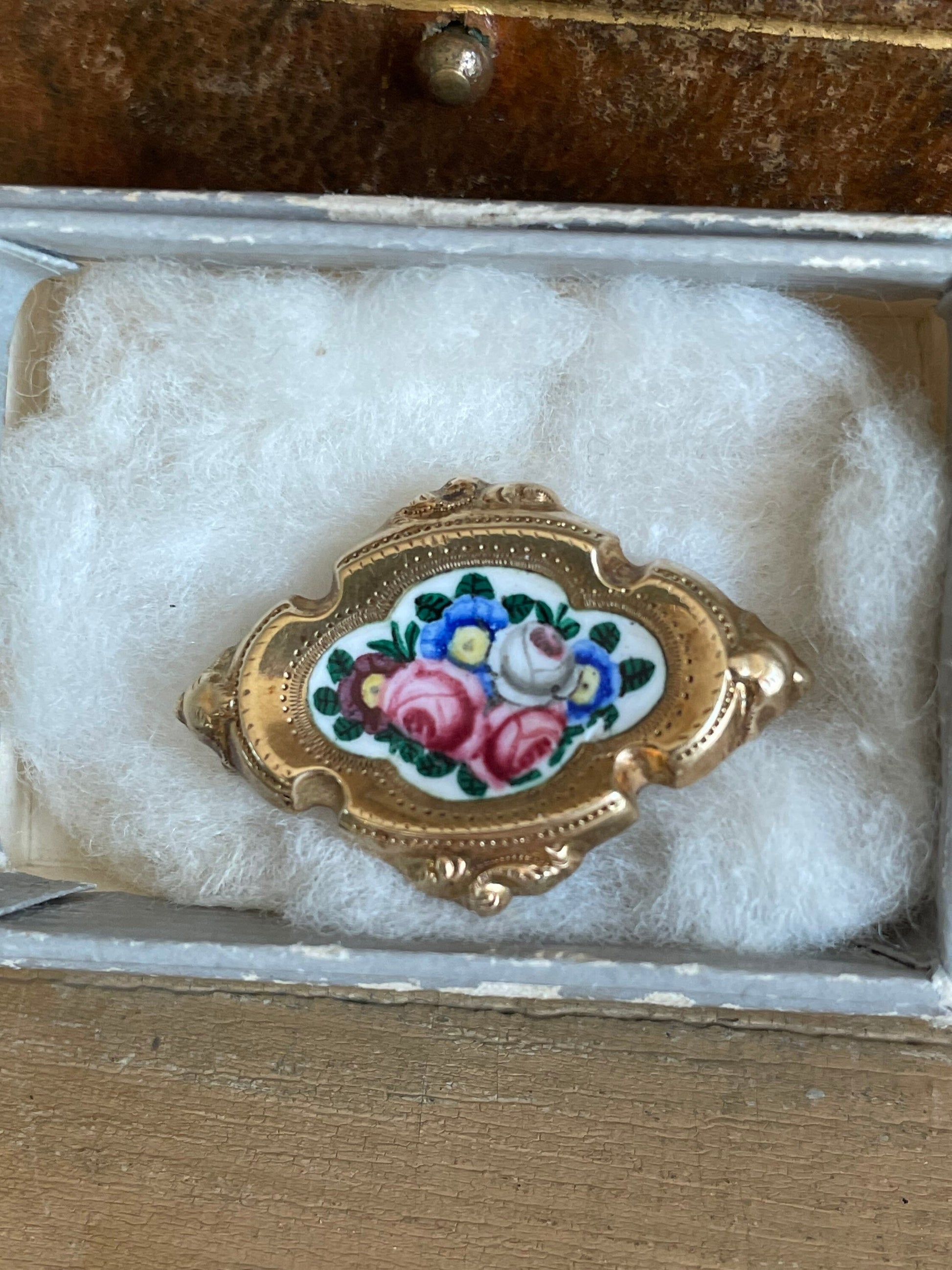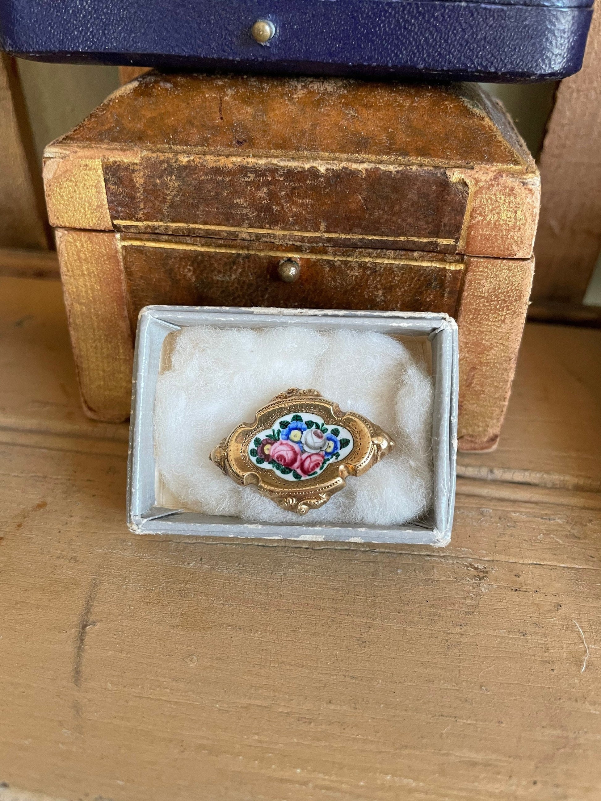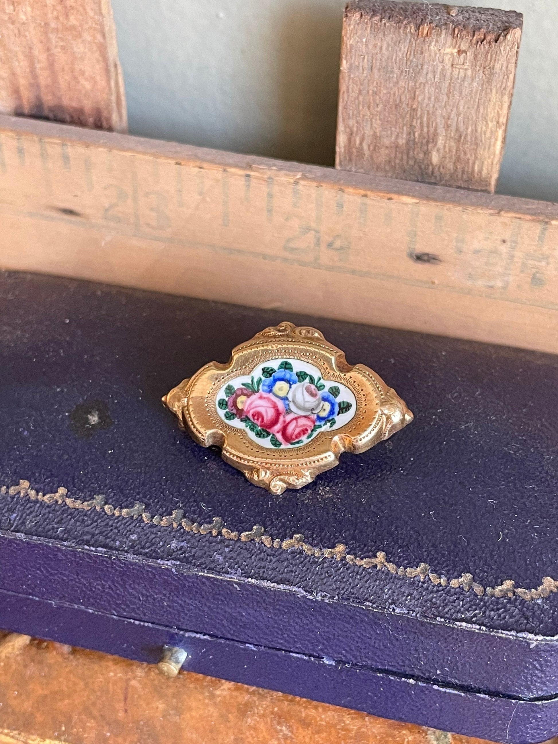 Beautiful Victorian brooch with hand enameling. The center has enamel flowers in bright colors. The back has a c-clasp and engraved initials. The pin stem was not tested and is most likely a different metal-possible replacement. Condition is very good-under magnification there is a tiny loss of enamel in the corner (I mean tiny). 1 1/4 inch wide 13/16" tall.