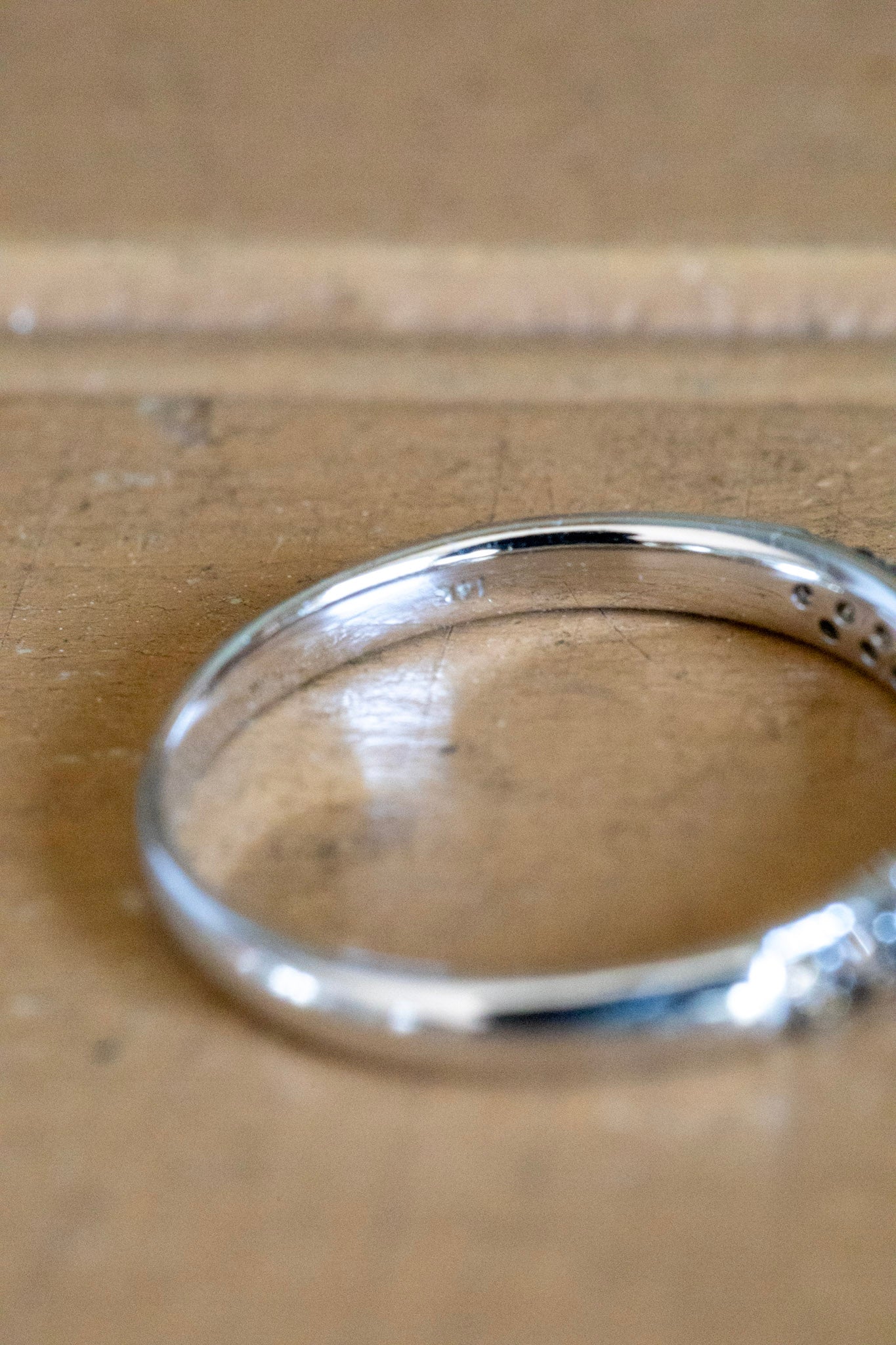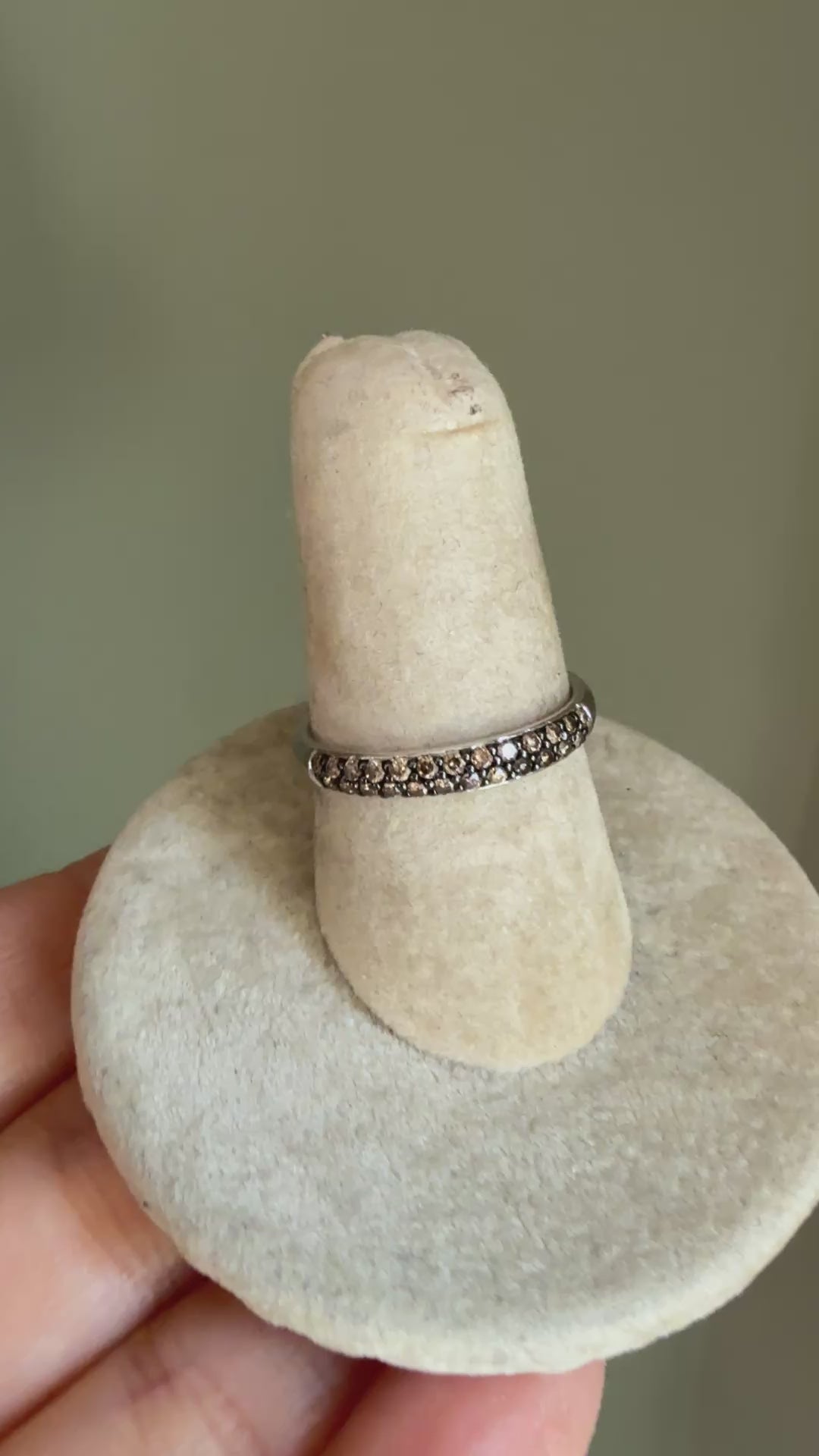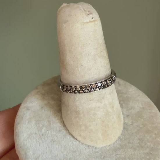 Vintage 14K white gold thin band set with round cut medium brown /chocolate color natural diamonds measuring approx. .80 mm each, bead set with black rhodium background. The band is domed and 2.93 wide and 2.15 mm deep. Stamped 14k and verfied. Sz 6.5 but message if you need sizing service. 2.1 grams