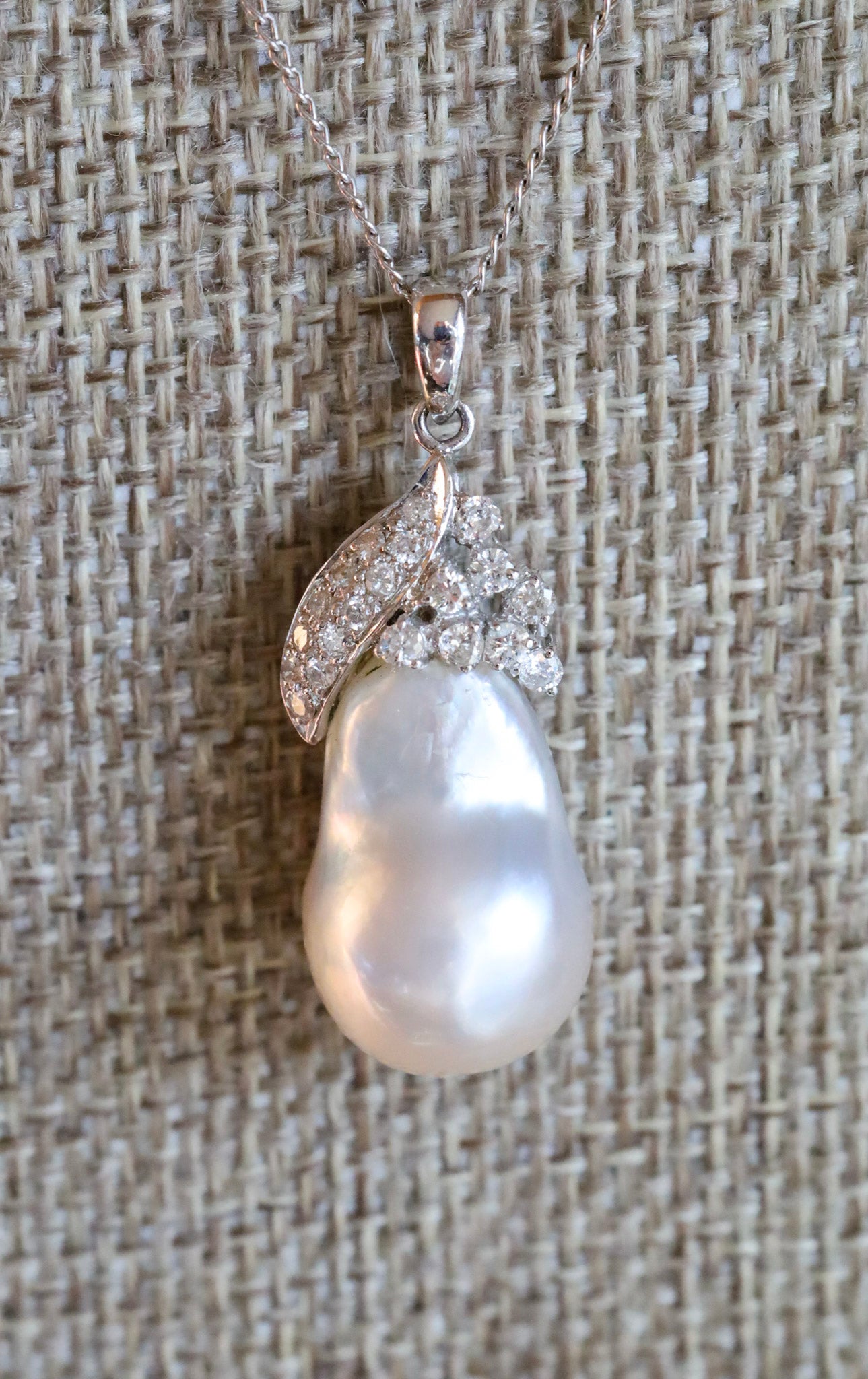 It is crowned with a delicate diamond-accent cluster set in a graceful leaf motif, adding refined sparkle without overpowering the pearl’s natural glow. Diamonds are round cuts and around G-H color, under microscope there are light relief inclusions I would grade them in the I clarity range. One diamond greatly magnified appears to have a nick under the girdle ( I am being overly picky but I do check stones under great magnification). All diamonds are securely set by prongs and beads. Pendant is 1 1/4" length x 1/2" wide. Suspended from a sleek, 14K white gold precious-metal chain, this piece embodies timeless sophistication and understated luxury.