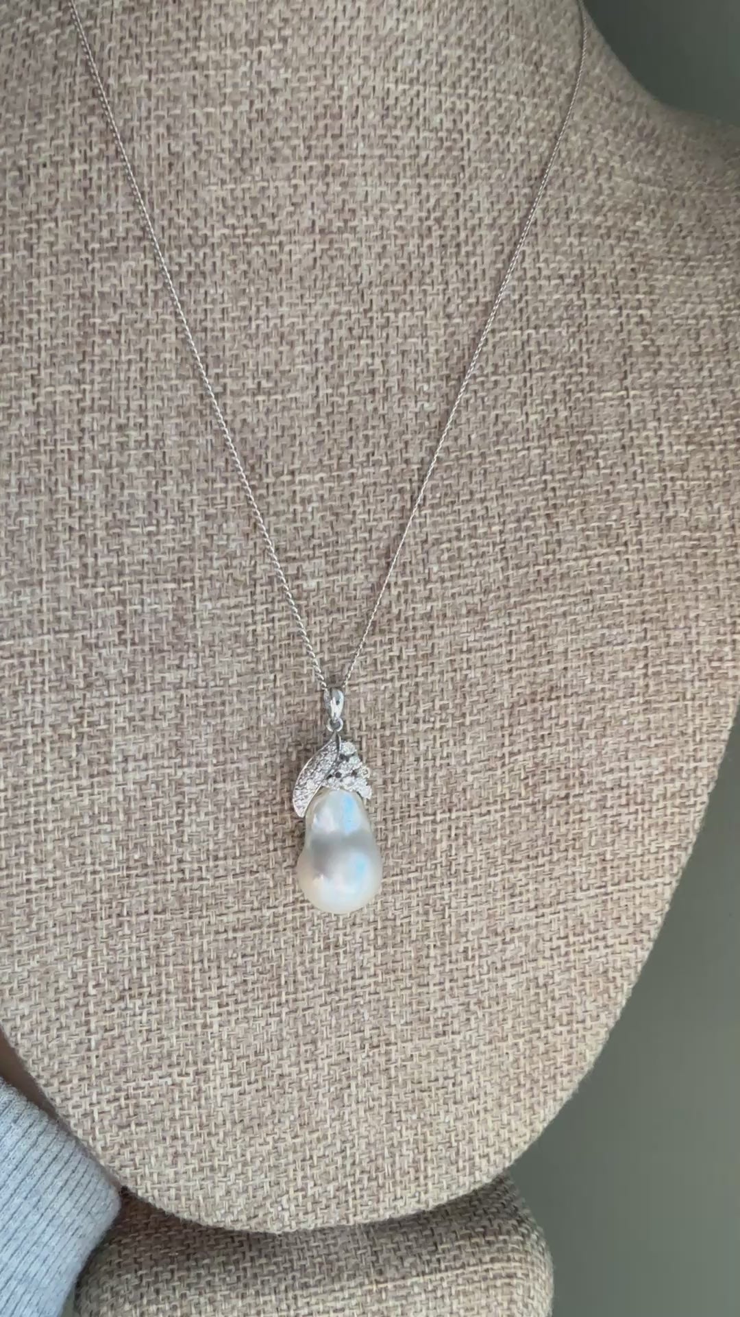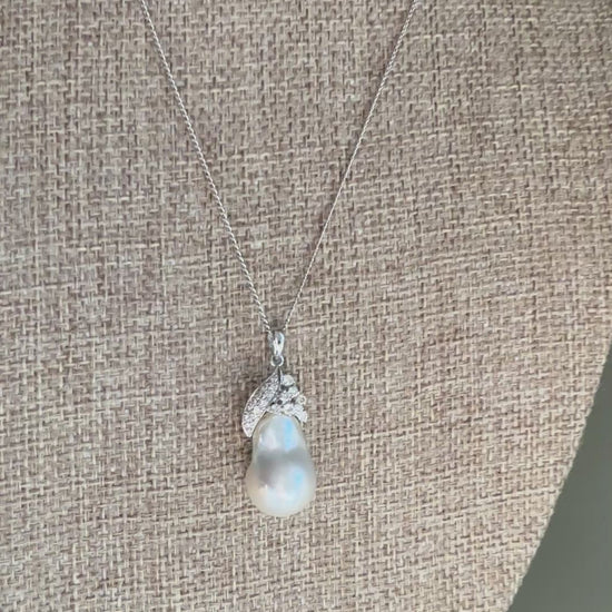 An exquisite 18k white gold pendant showcasing a genuine baroque South Sea pearl, prized for its exceptional size, satin-like luster, and natural elegance. The pearl features a softly organic drop shape and measures approx. 17.85 x 11.90 mm. Very good thick luster and whitish hue.