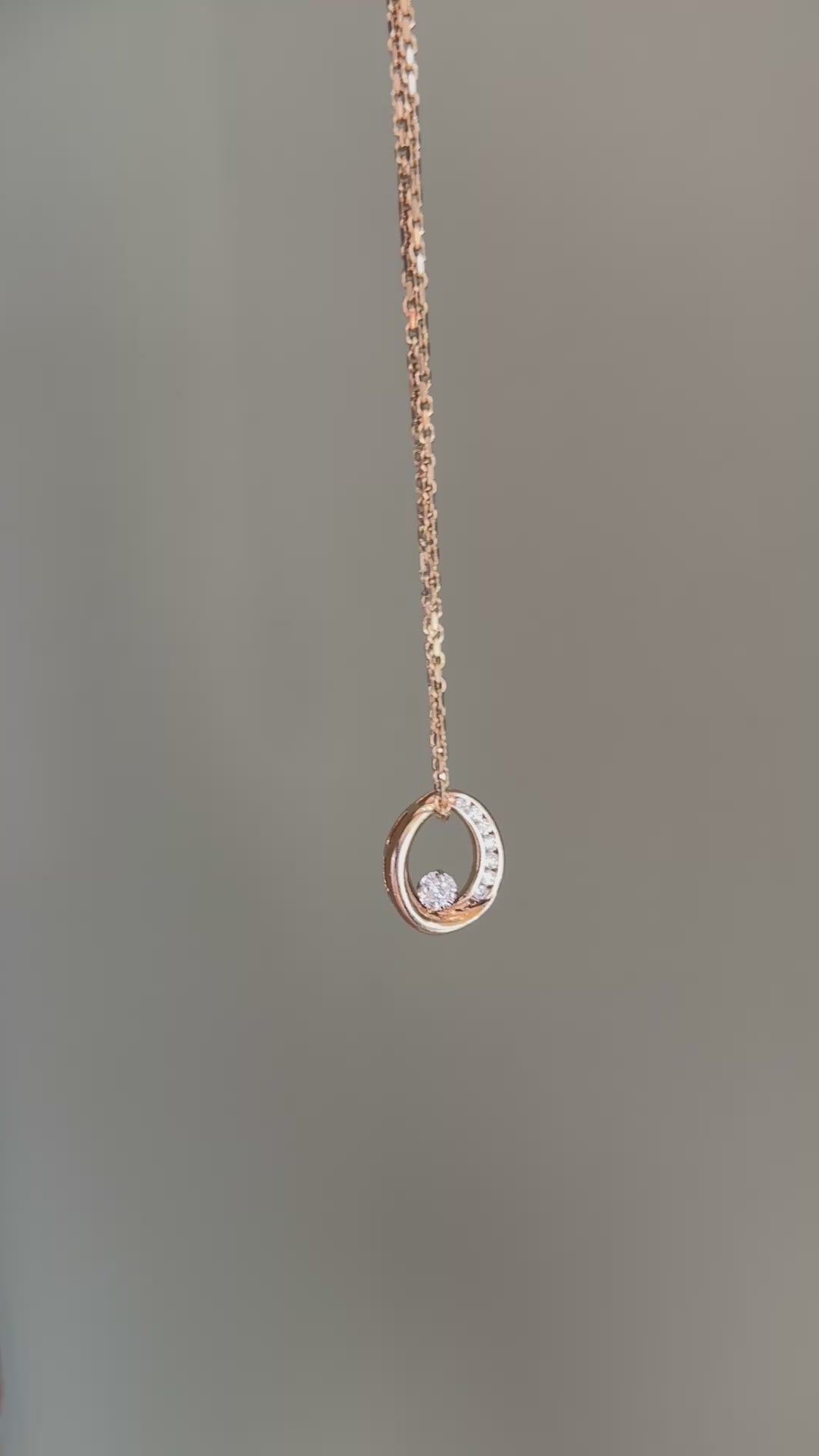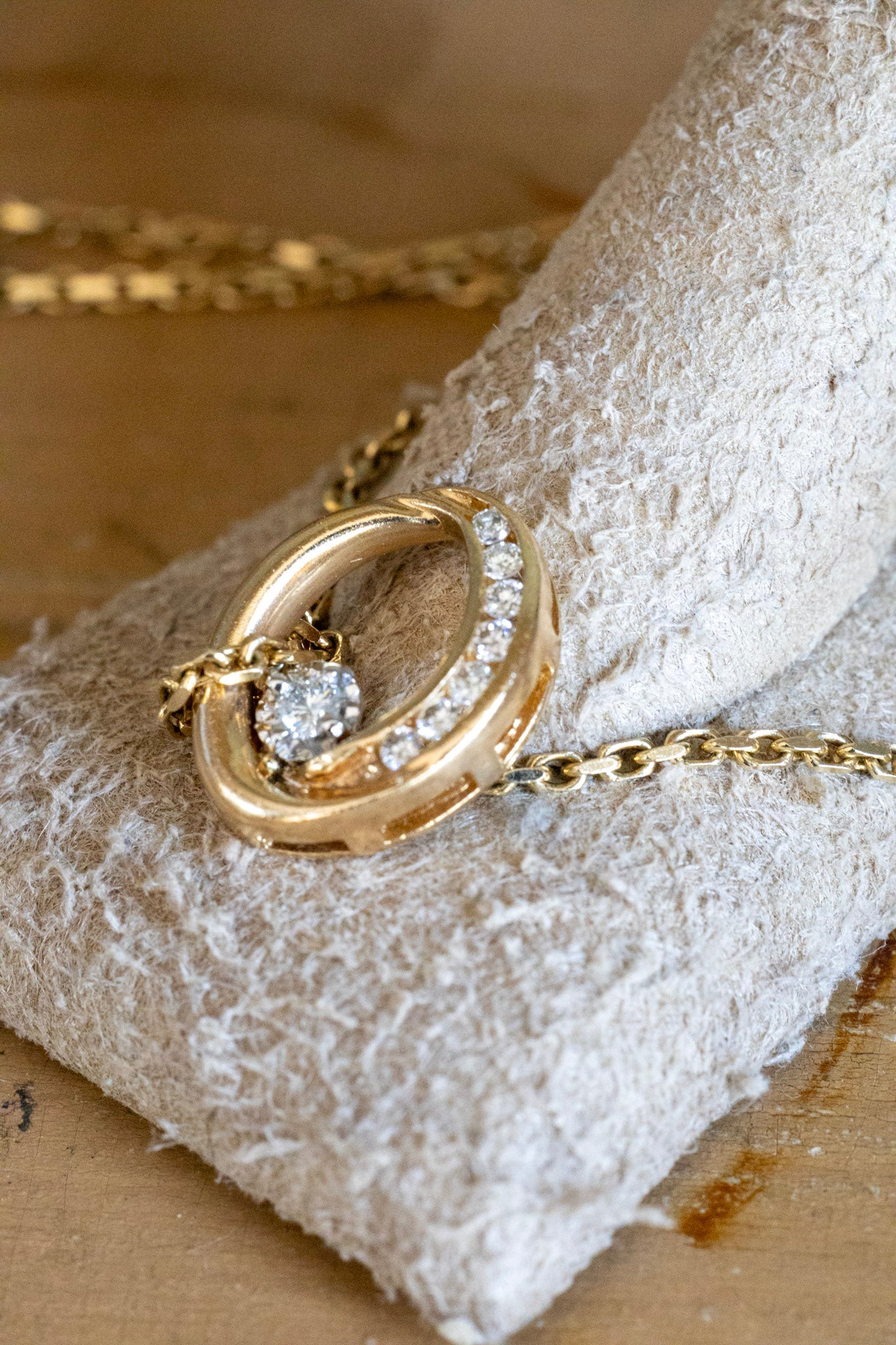 1980's 14K yellow gold pendant is oval shaped featuring a round brilliant cut natural diamond weighing approx. .10 ct set in white gold by four prongs. On the side are 7 brilliant cut natural diamonds channel set. Near colorless, VS2-SI clarity. 11/16" length x 9/16" width x 1/8" depth. Stamped 14K on the back and verified. 2.7 grams