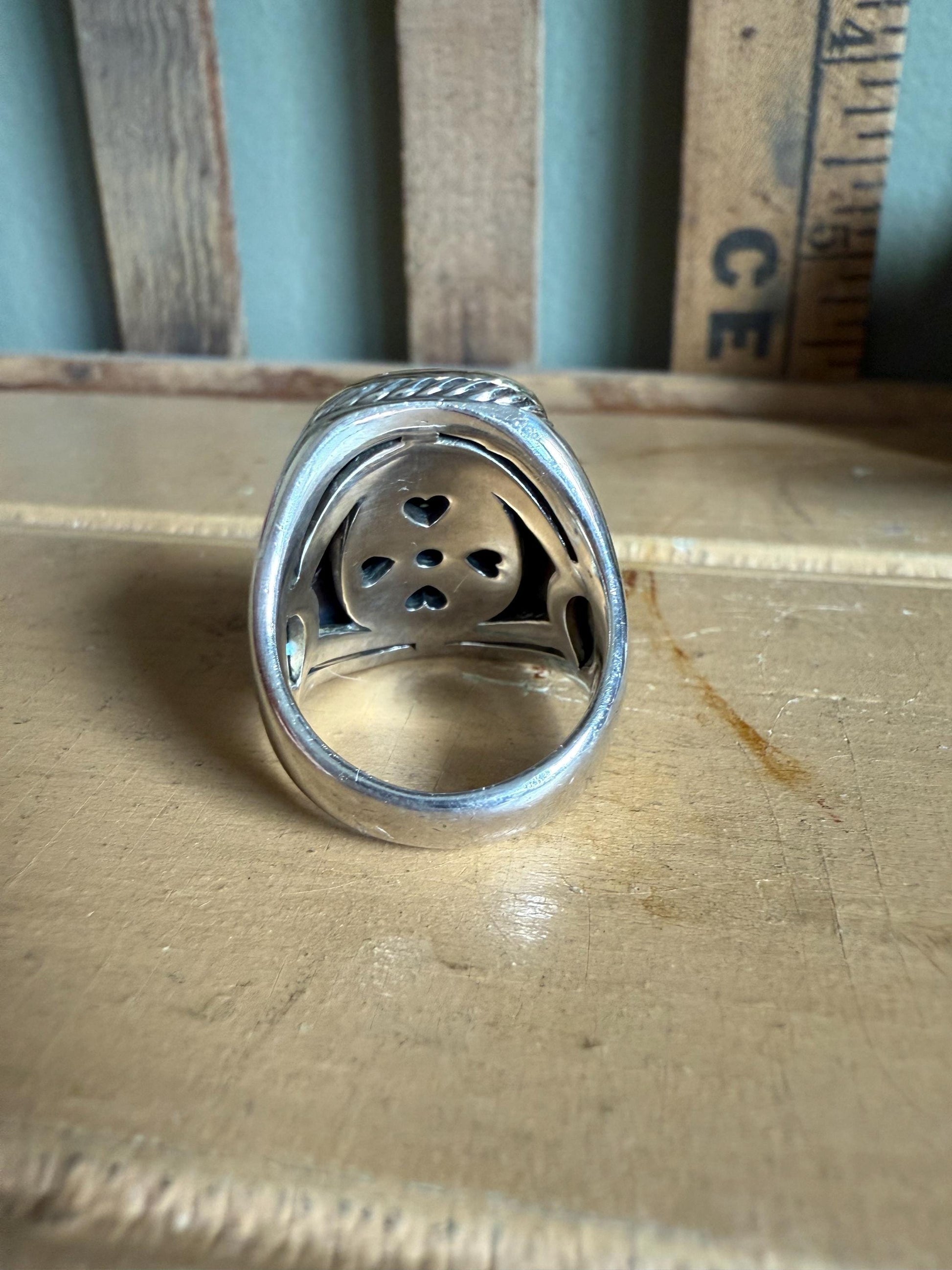 Approx. 1" top to bottom on finger. The current size is 6.5 but is fits a little more snug ue its overall size. Sizing service is available-reach out for an estimate.