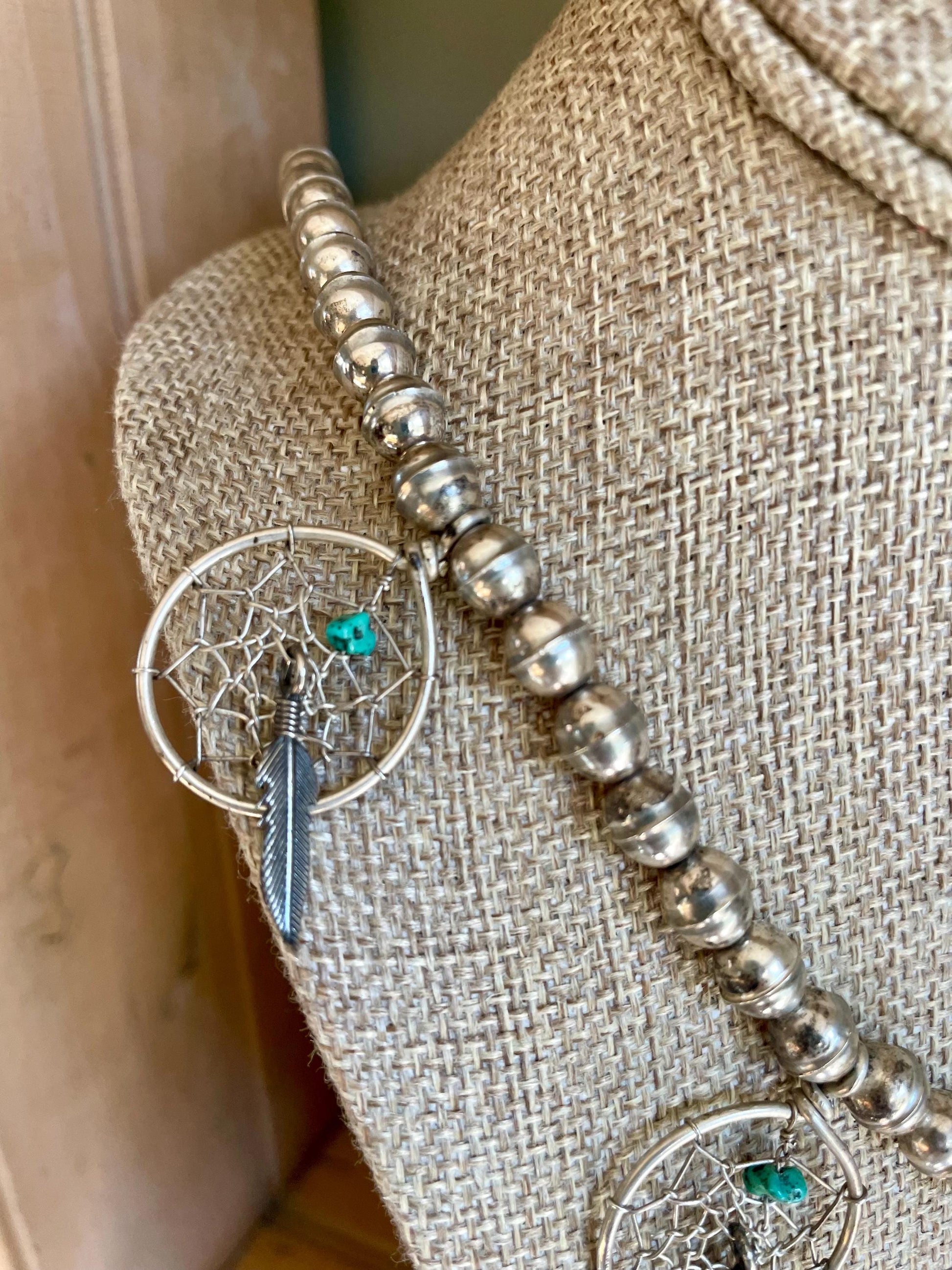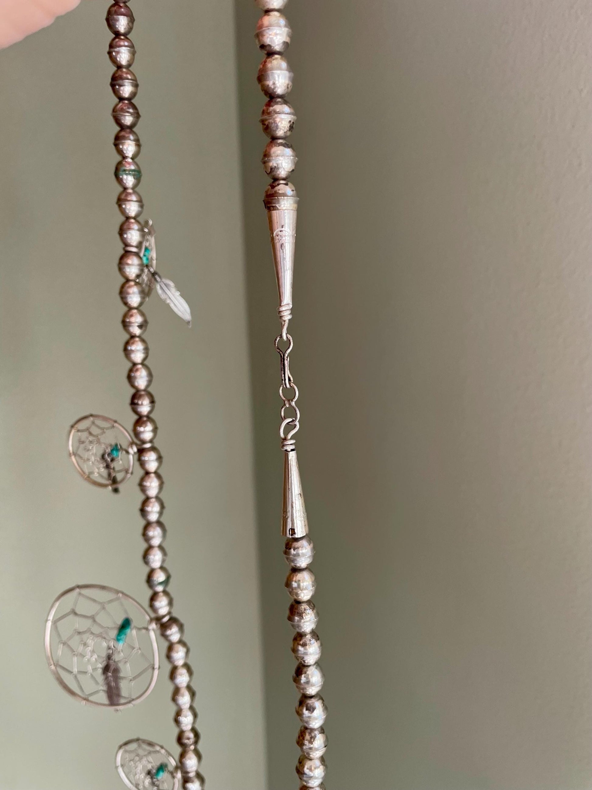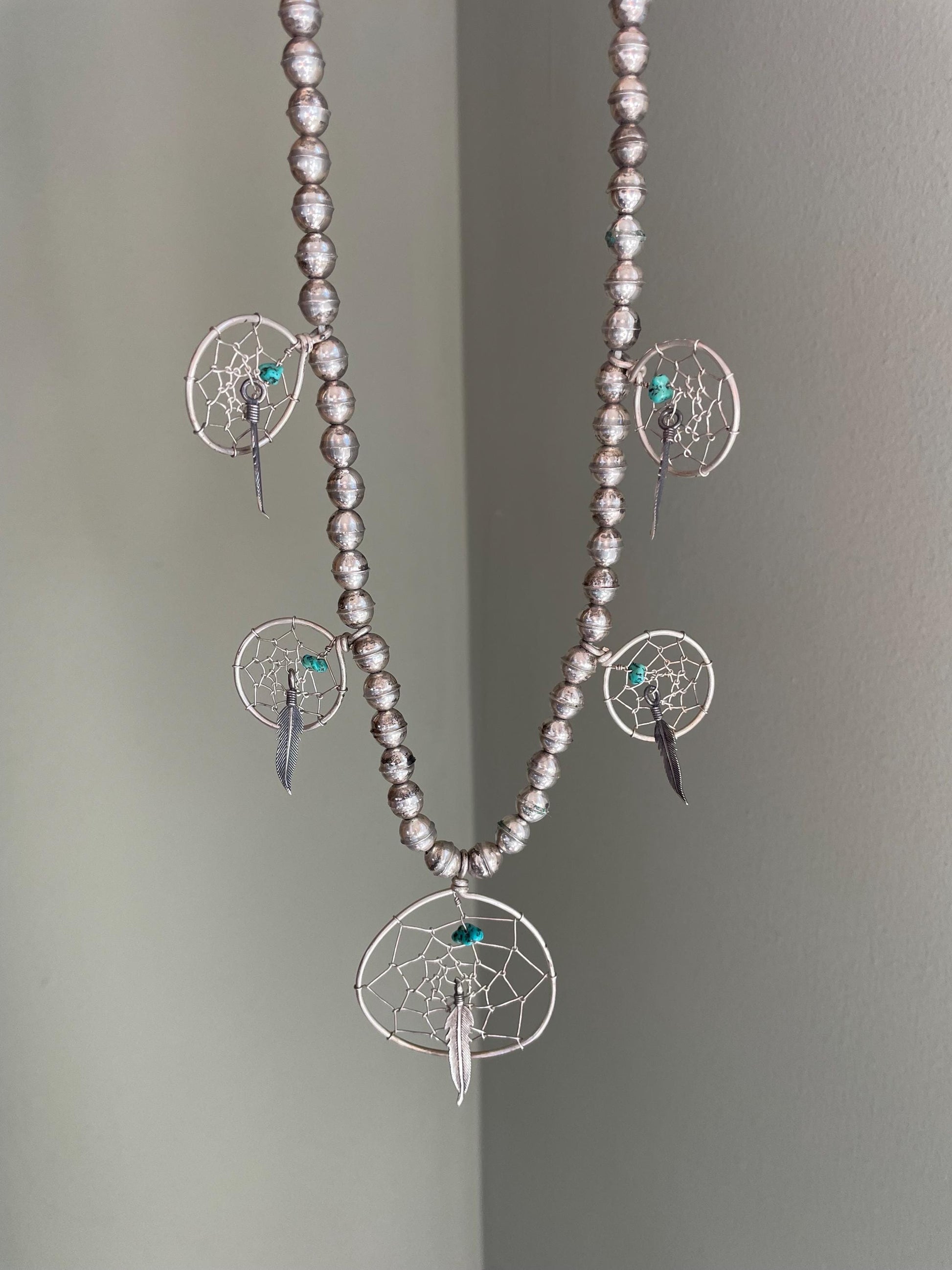 Sterling silver Navajo bead dream catcher necklace. An unusual piece as you see a lot of these created on plain link chains but this has the old two piece joined beads. The chain is 27" length and the beads are approx. 7.35 mm diameter each. Five hand woven dream catchers range in size from 1" - 1.65" diameter. each has a real turquoise nugget and sterling silver feather. The chain is finished with stamped Navajo caps and hook and eye. Strung on string.