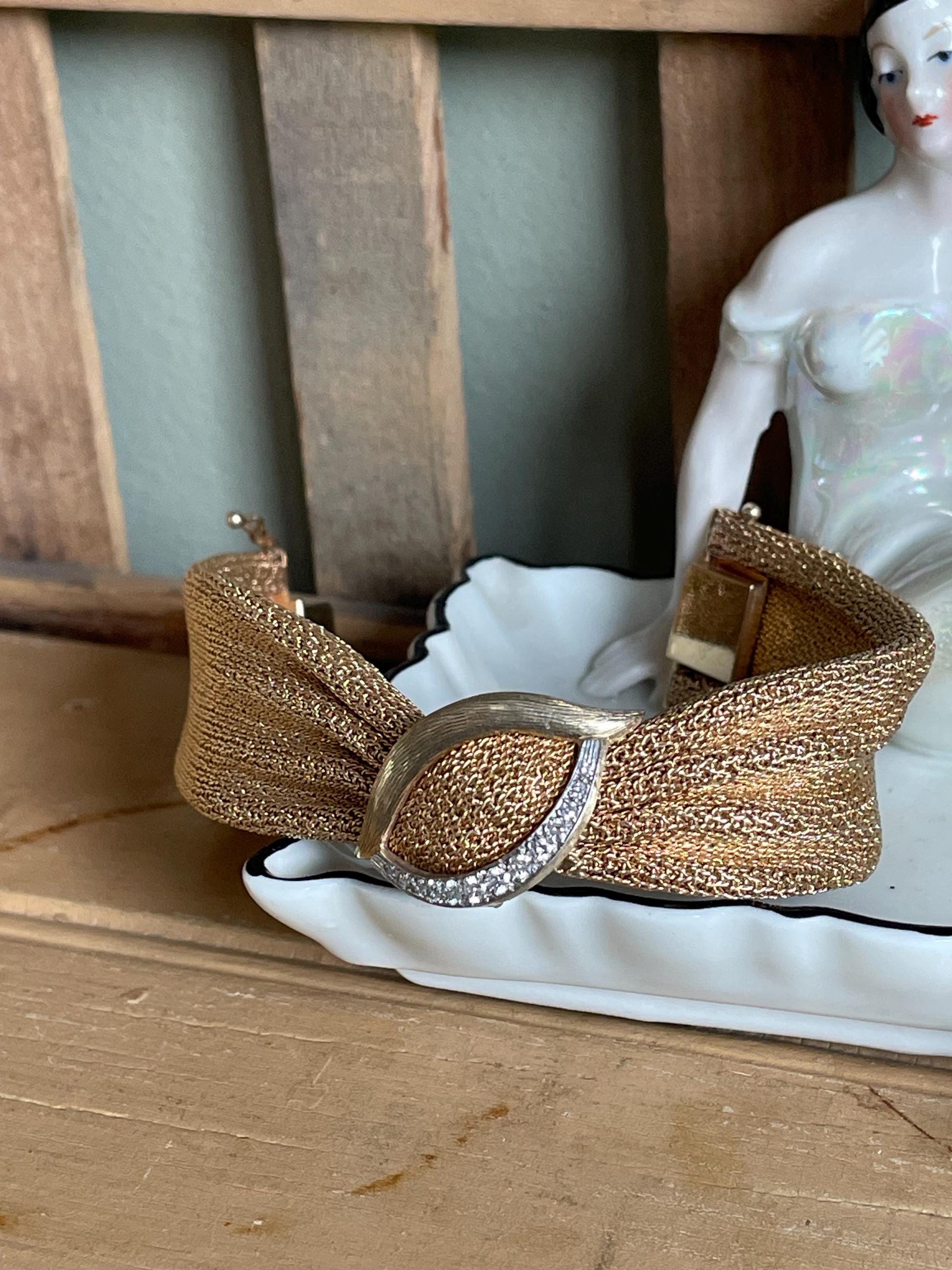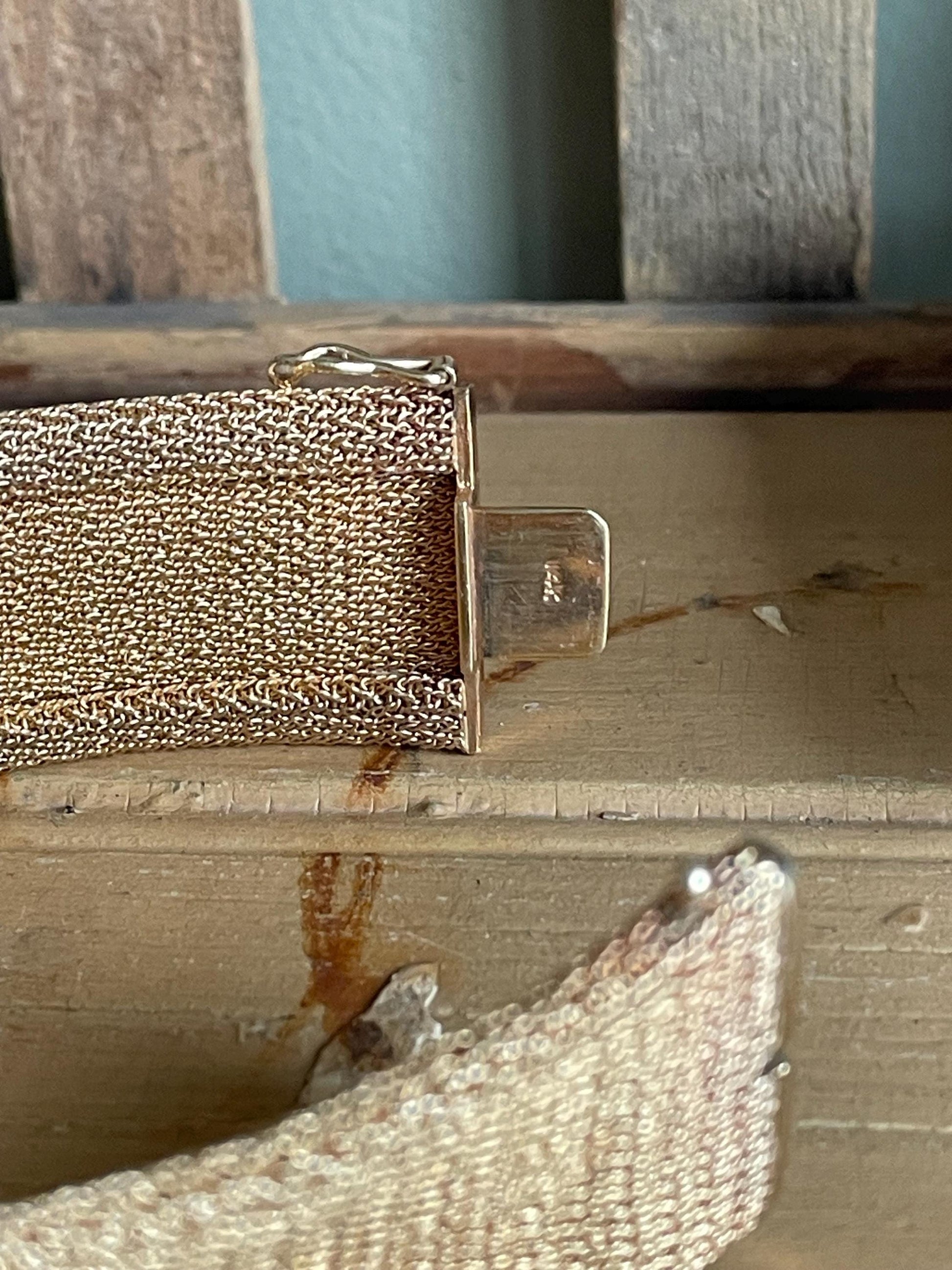 This is a work of art dating to the mid century. The watch is mesh 14K yellow gold that looks like a ribbon around the wrist. The center featured a surprise watch with a leaf like door that has a brushed finish and round cut diamonds set in white gold. Approx. .28 ctw, near colorless, vs2. The clasp snaps tight and stays, there is a sweet heart push button to release and a safety latch.
