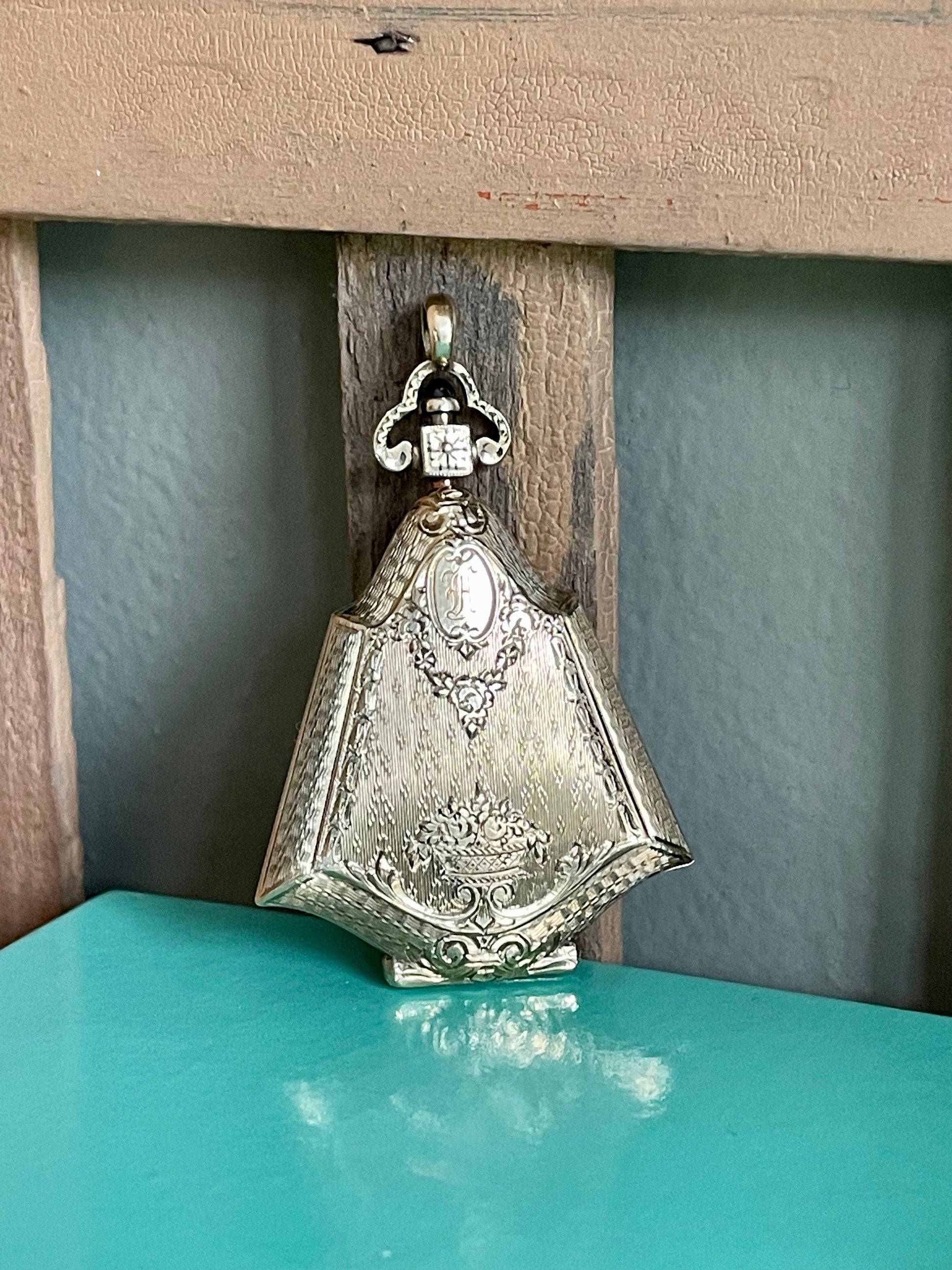 A fine example of Edwardian jewelry. 14K yellow gold (not marked but tested in multi areas by touchstone) locket with machine engine turning front and back with basket and flower, laurel wreath, scroll decoration. In the monogram panel is a hand engraved ??H? Inside the locket has one frame with glass. The locket opens by pressing the cabochon sapphire at the top.