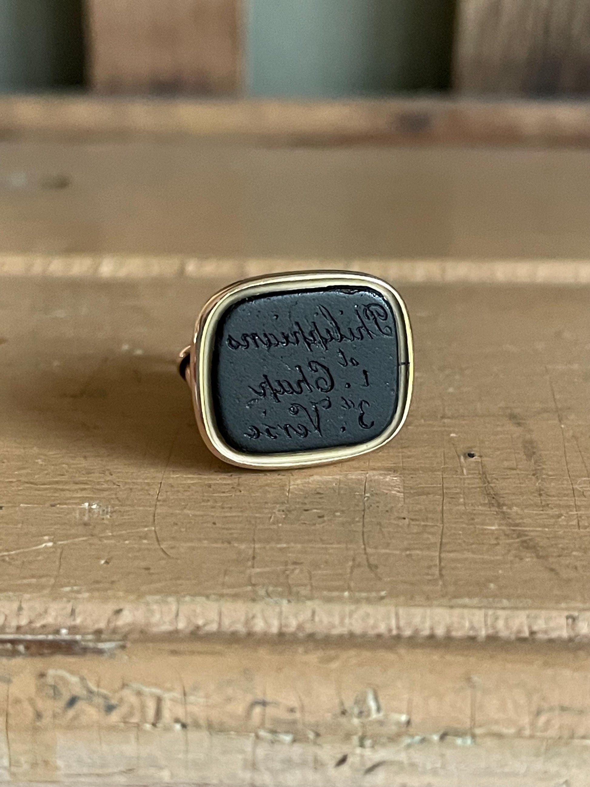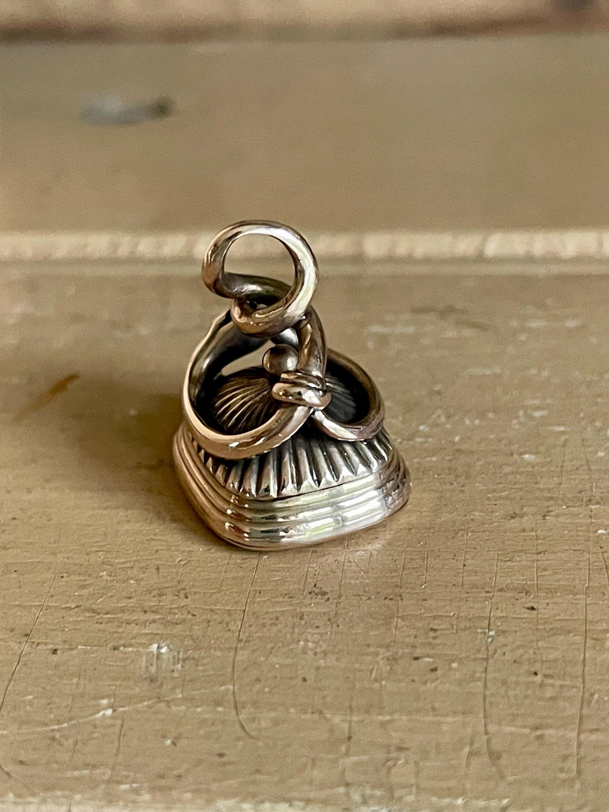 Early Victorian watch fob featuring a wrapped snake at the top creating a loop to slip a chain or dog clip through. The base is fluted with a ball motif top. Bottom is set with an agate hand engraved Philippians, 1st Chapter, 3rd Verse, " I thank my Gold in all my remembrance of you". A sentimental or mourning piece. 5/8" length x 1/2" width x 3/4" height. Condition if very good.