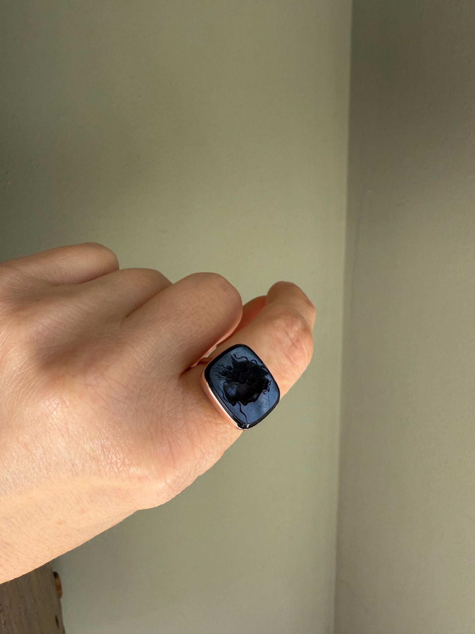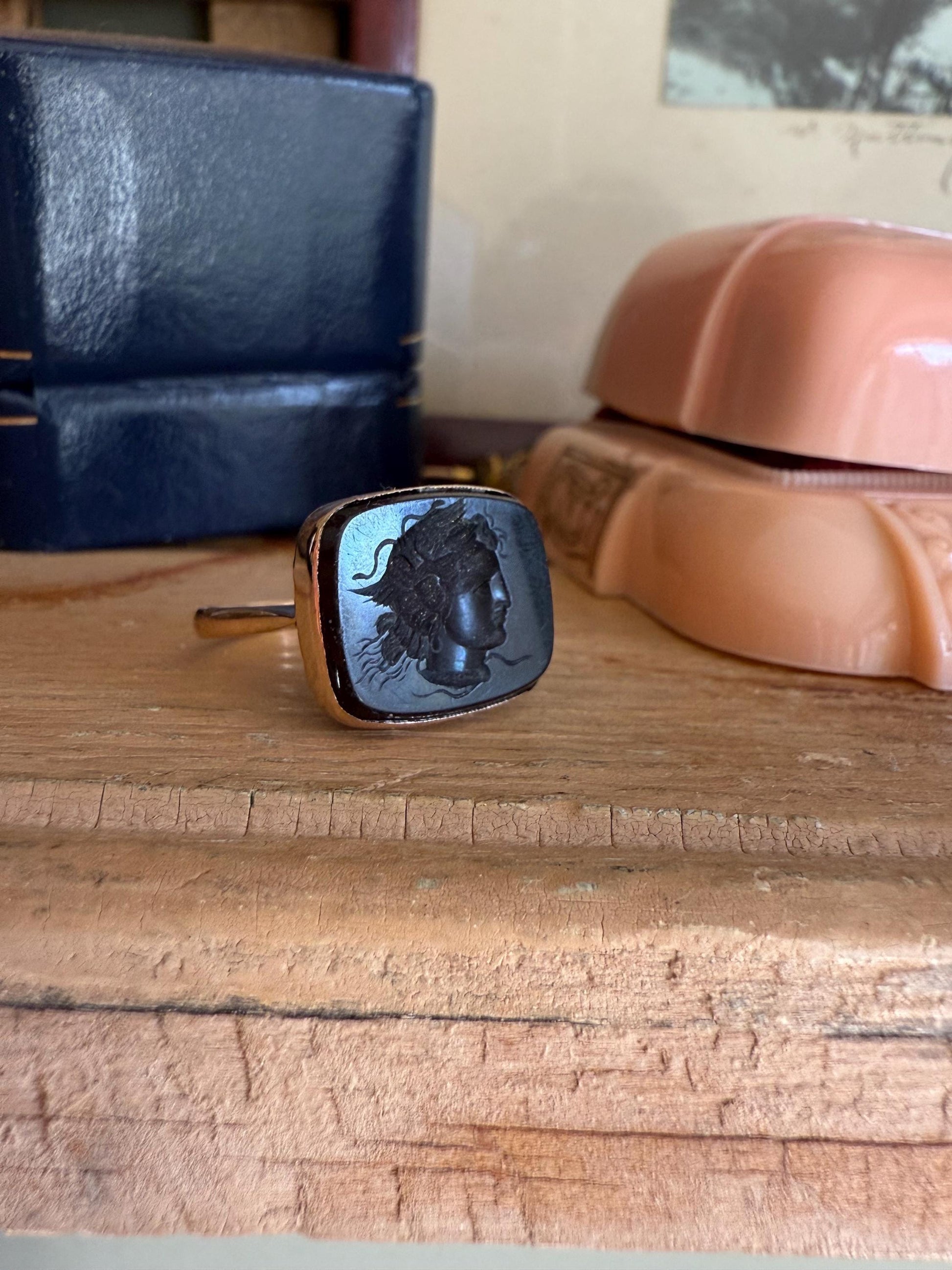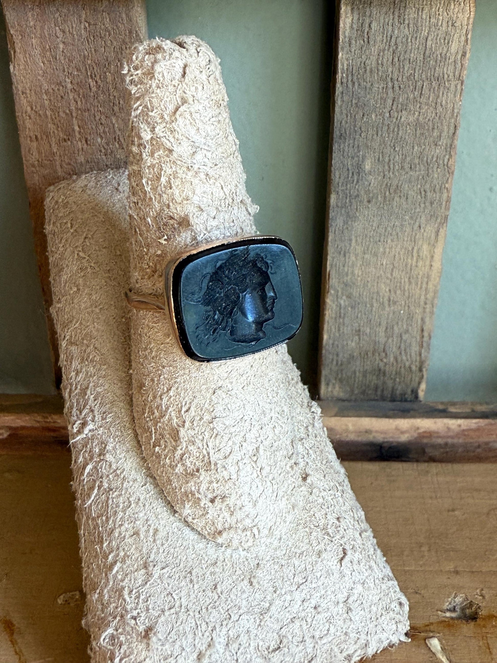 The sardonyx measures approx. 15.80 x 12.60 mm and is securely bezel set. There is some slight wear to the some of the edges of the bezel not unusual for a piece this age. The color is a deep rich chocolate brown. The intalgio was cared by a master and features a greek or roman god in profile. The gallery has wirework.