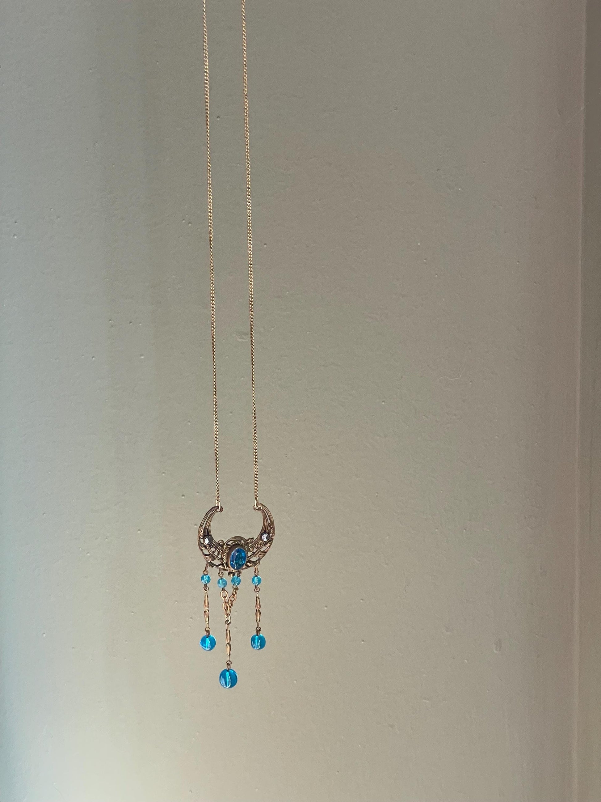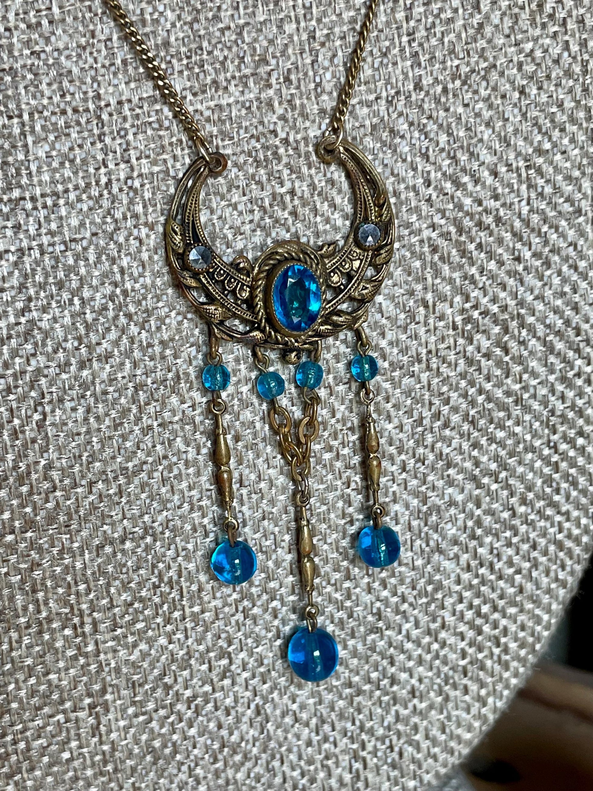 An Edwardian pendant in the shape of a crescent moon with leaf accents set in the center with a bezel set oval teal glass stone in a twisted rope frame. The stone measures 7.5 x 6.6 mm. On each side there are two bezel set pyrite. Three long dangles fall from the bottom, longest is 1.5". The width of the pendant is 1 1/8". The pendant hangs on a gold filled chain measuring 22" length.