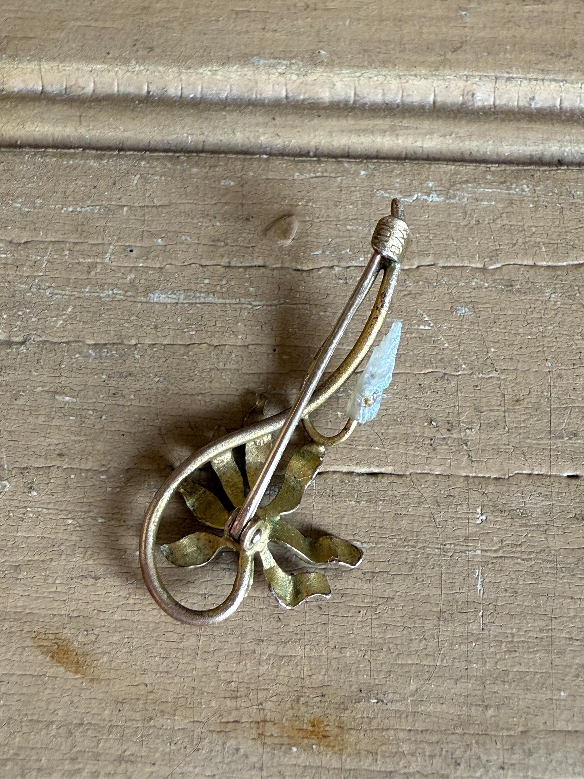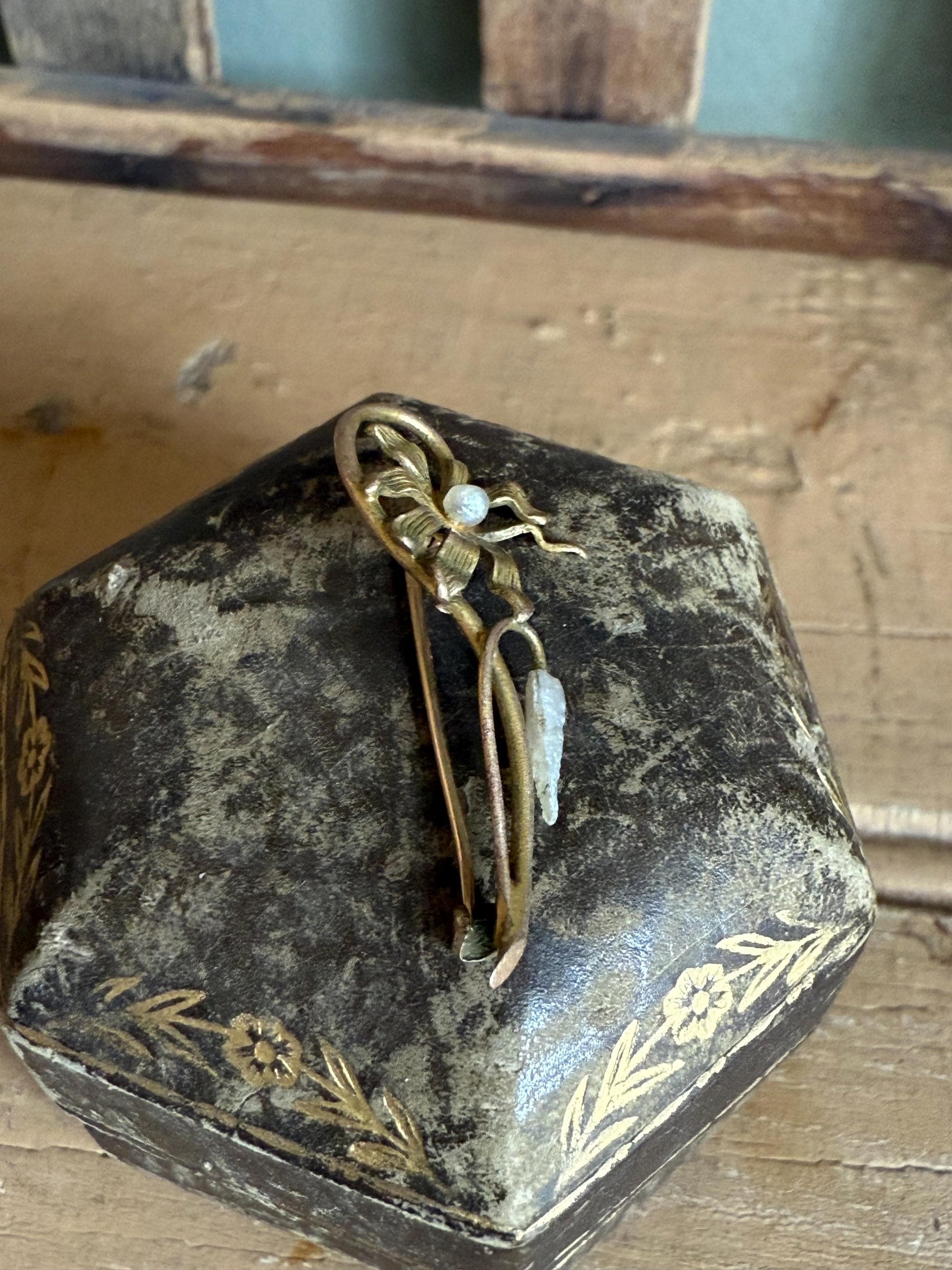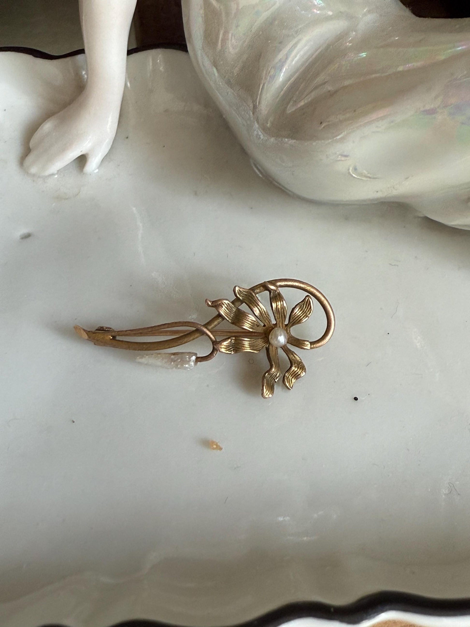 Antique Edwardian c1910 10K Yellow Gold Flower Brooch with Natural Pearls