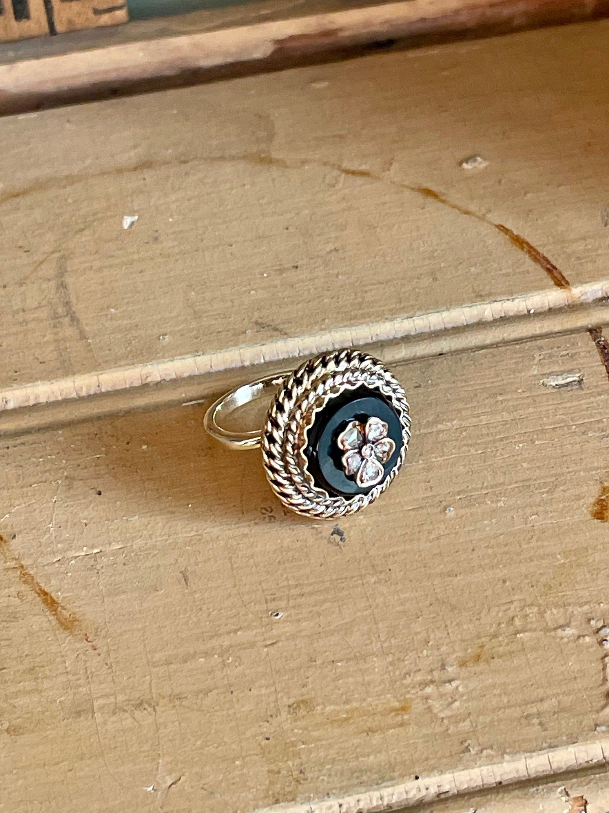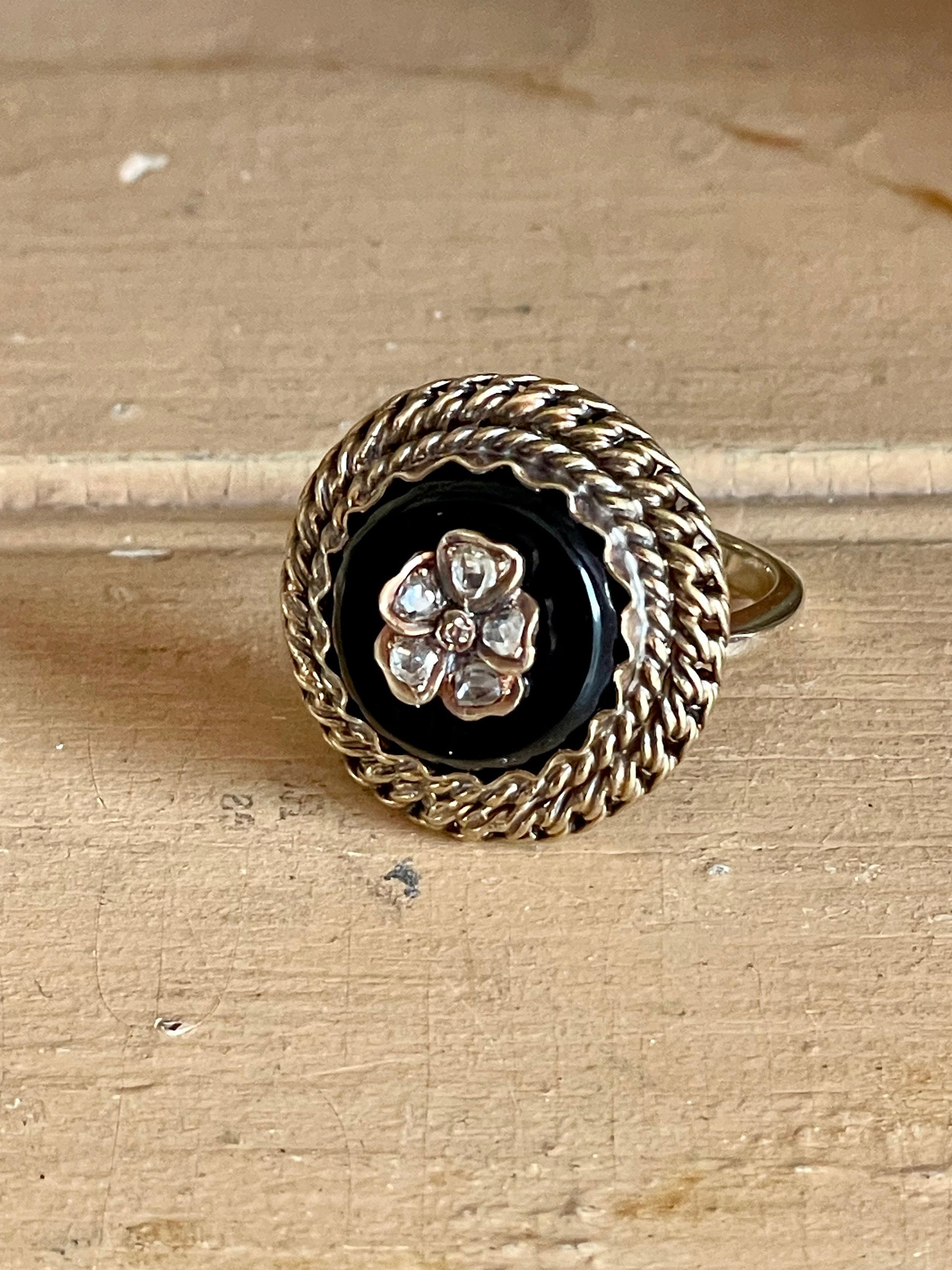 The ring featuring a round onyx measuring approx. 11.66 mm. In the center is a delightful pansy set with rose cut diamonds. The onyx is crimped set in a twisted rope frame. The front measures 19.61 mm and it sits off the finger 10.42 mm. The shank is think and currently sized to a 6 but message me if you need a different size.