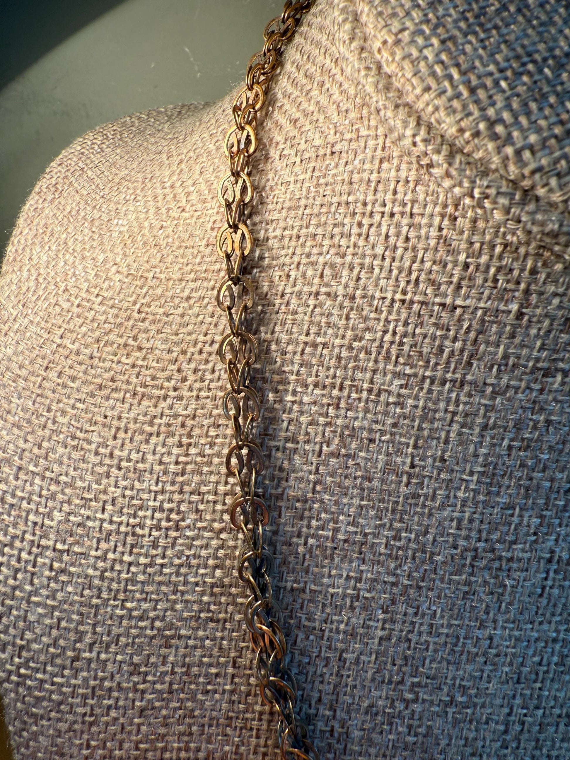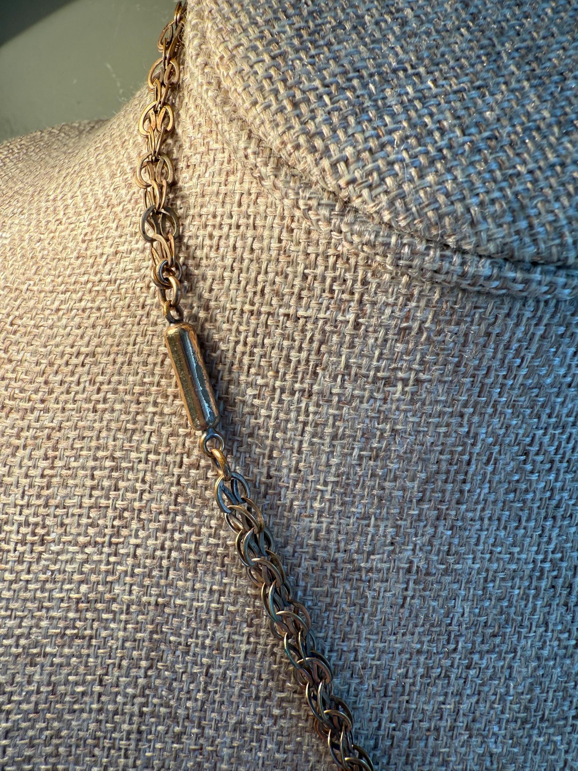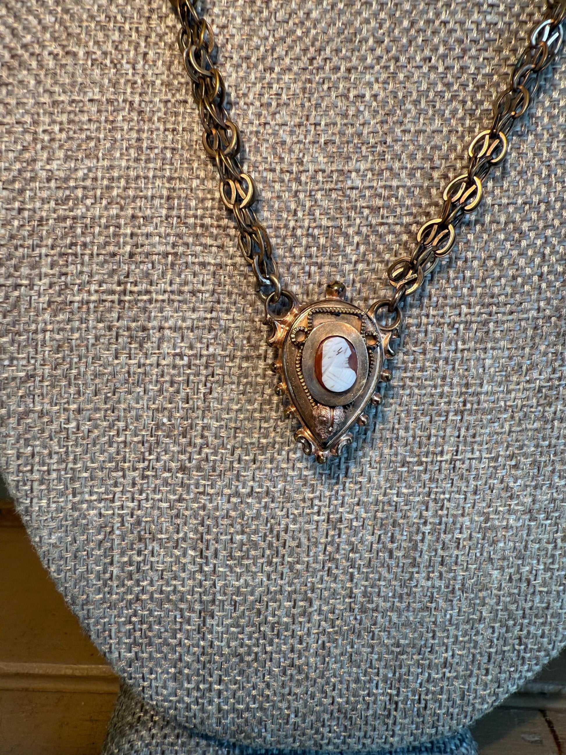 Slightly rose gold filled Victorian necklace featuring an agate carved from banded agate with lady in profile, on the back is a hook you can add pocket watch/charm or pocket watch. The chain is an interesting link and 3/16" wide, finished with a barel clasp. 18" length chain. The pendant is 1" in length.