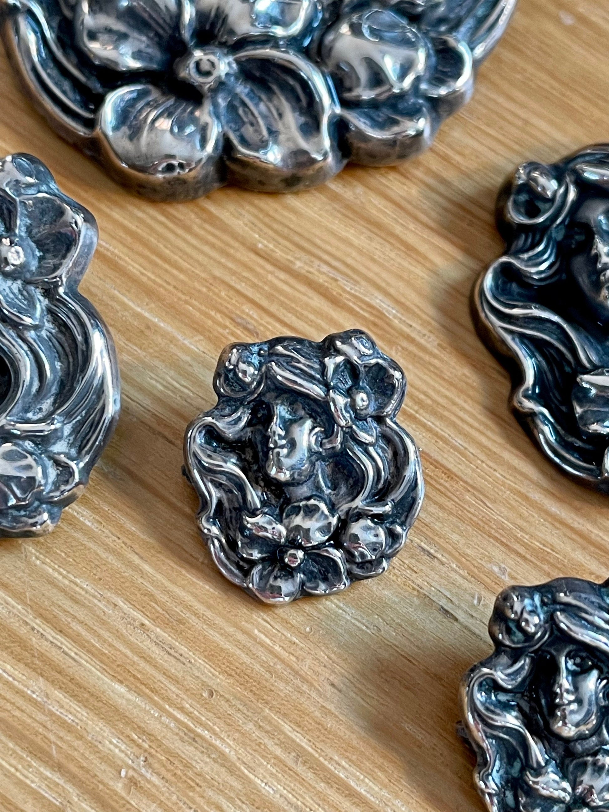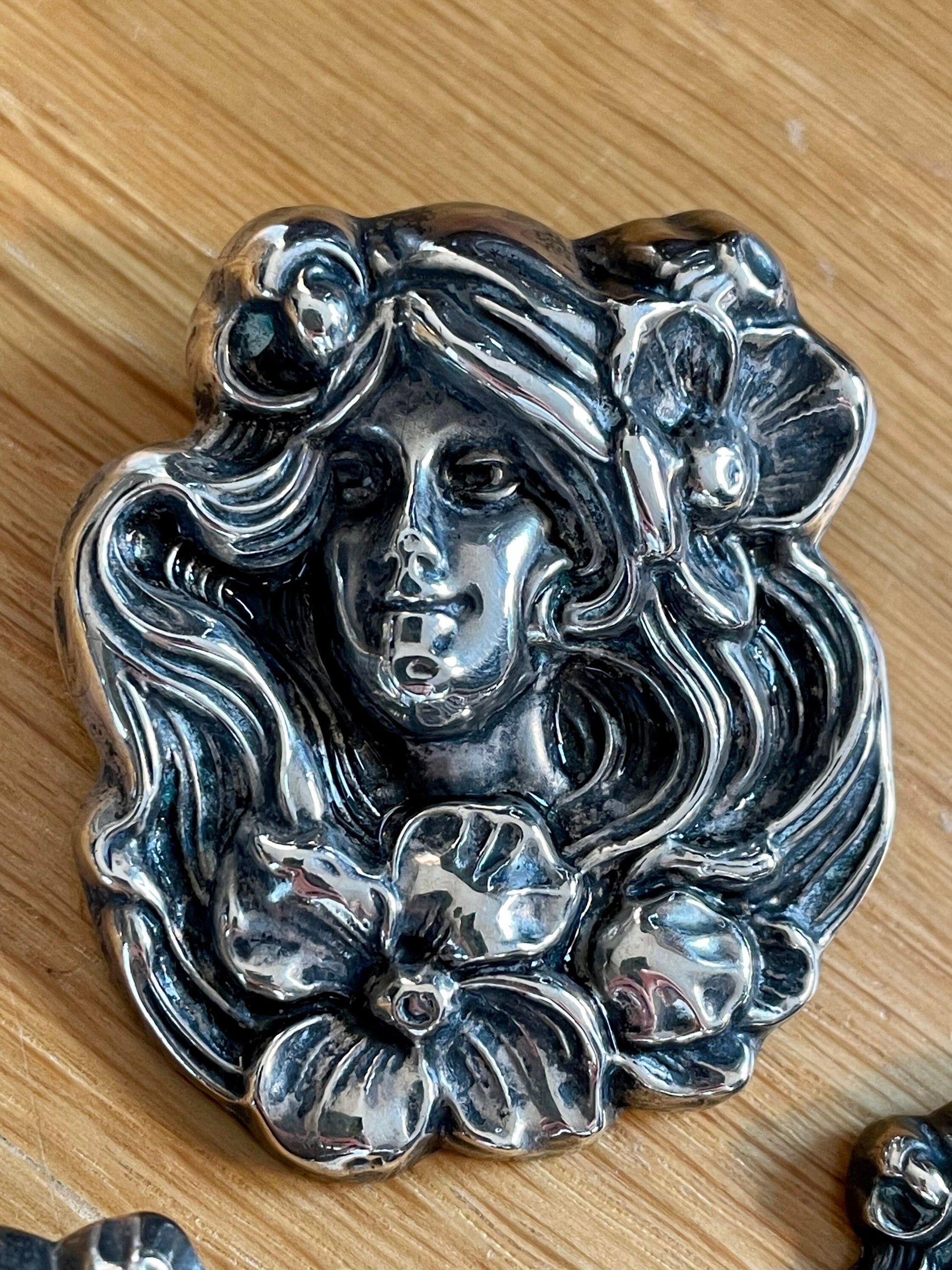 Art Nouveau Sterling Silver Five Piece Brooch Set Lady with Poppies