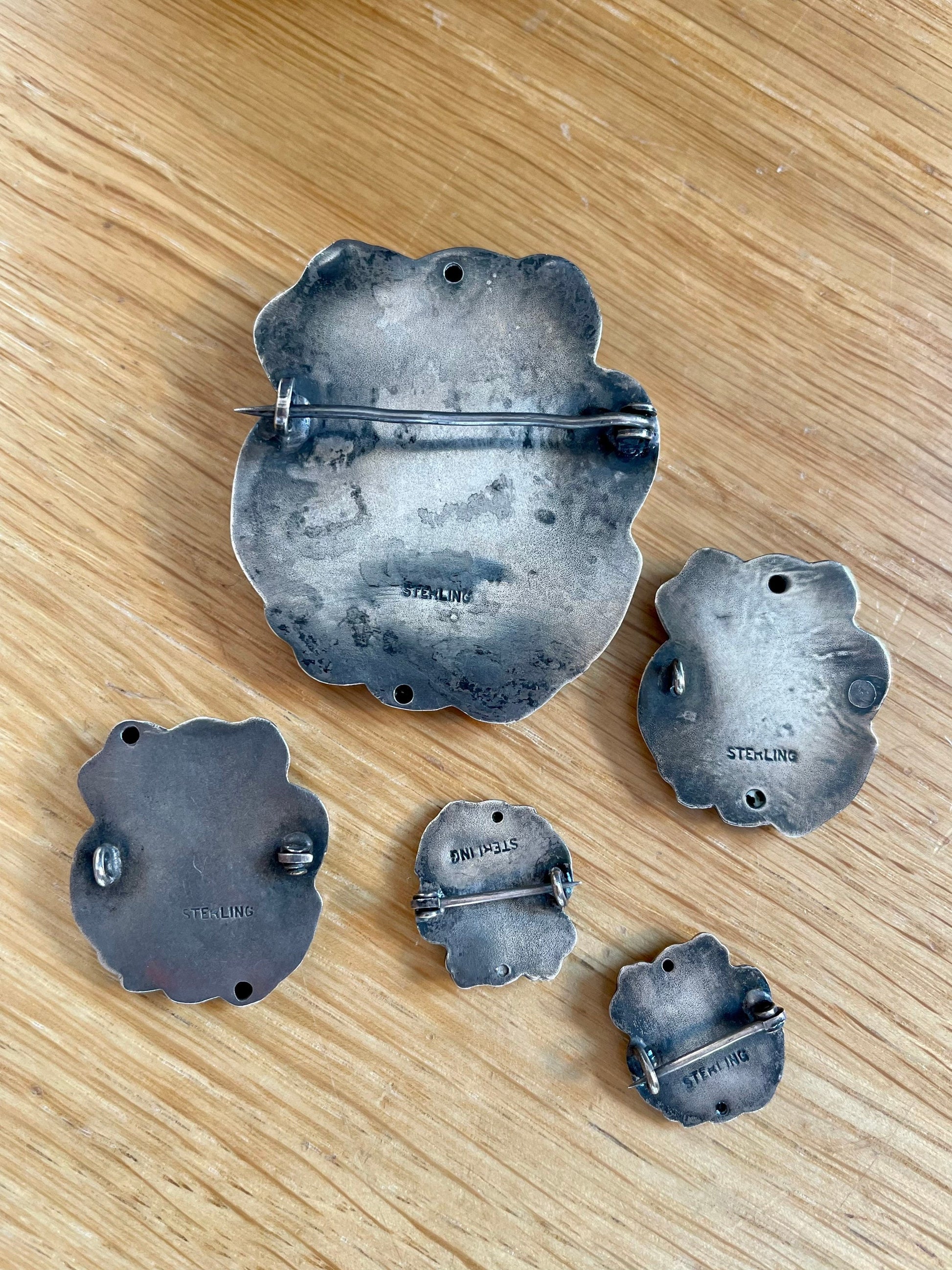 Sterling silver and dating to the early 1900's. The largest brooch measures 1.75" tall, 1.5" wide. The medium size ones measure 1" tall, 15/16" wide. The two smaller ones are 5/8" tall, 1/2" wide.