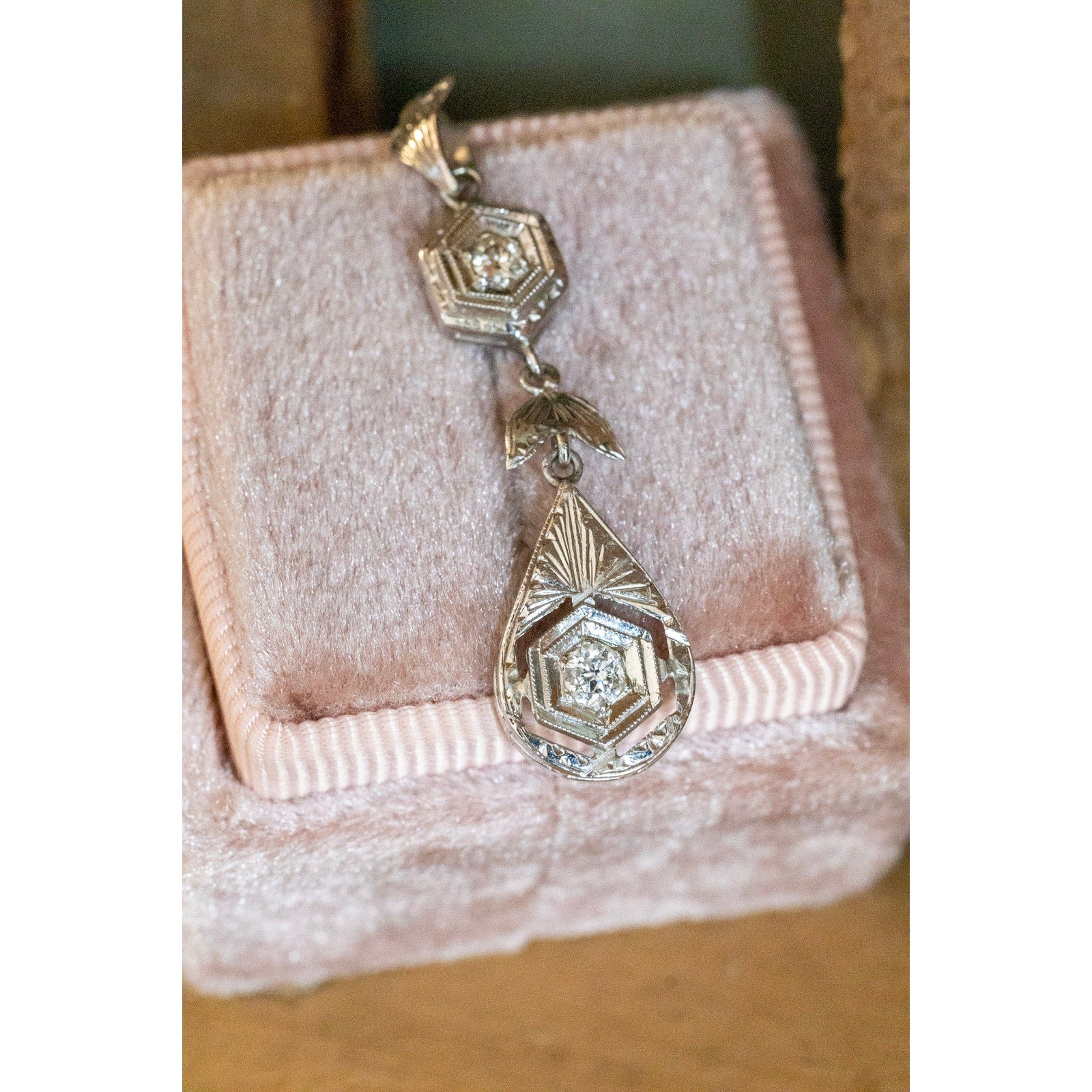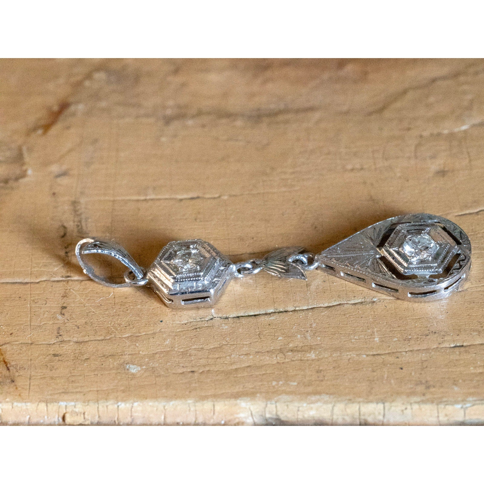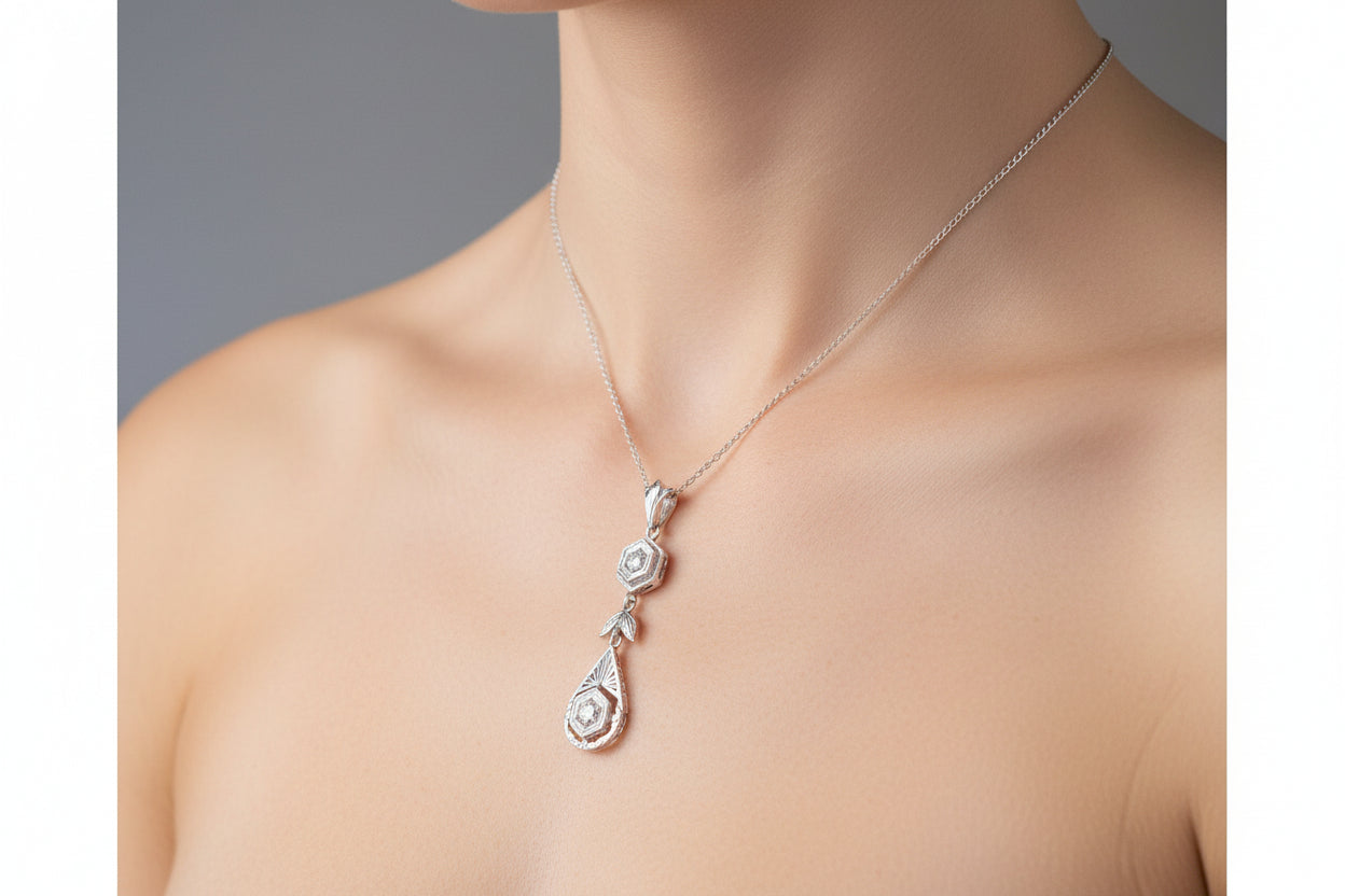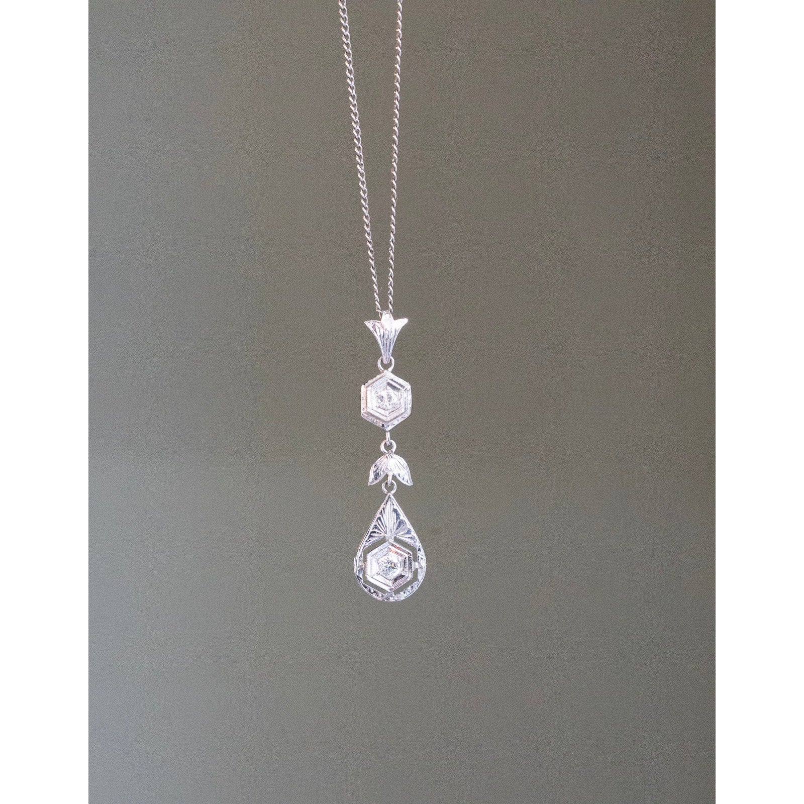 Crafted in rich 18K white gold (stamped and tested), this pendant showcases the timeless sophistication of the Art Deco era. The upper hexagonal diamond is delicately milgrain-set, leading to a finely engraved leaf motif and a striking teardrop-shaped drop. The lower centerpiece displays a sparkling Old European cut diamond framed by intricate openwork and engraved detailing, reflecting the era’s love of symmetry and architectural form.
