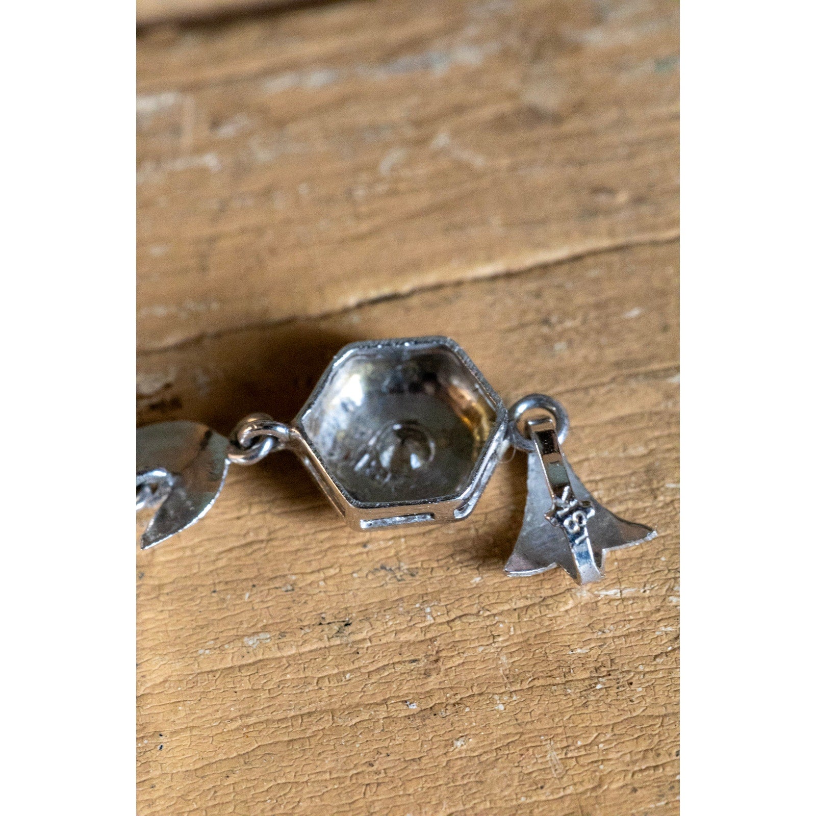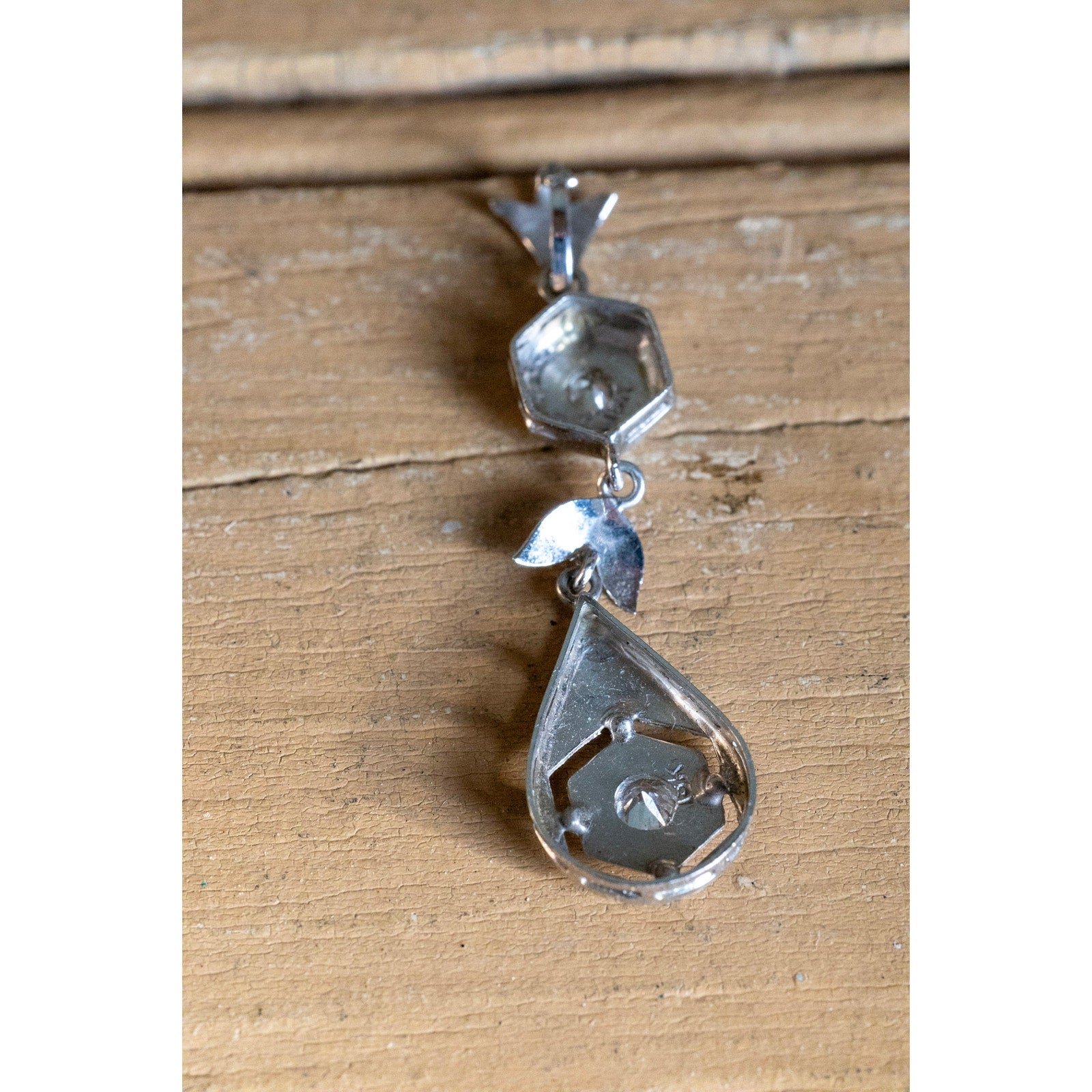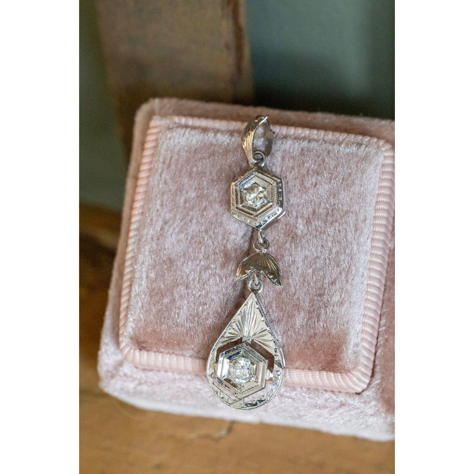 Crafted in rich 18K white gold (stamped and tested), this pendant showcases the timeless sophistication of the Art Deco era. The upper hexagonal diamond is delicately milgrain-set, leading to a finely engraved leaf motif and a striking teardrop-shaped drop. The lower centerpiece displays a sparkling Old European cut diamond framed by intricate openwork and engraved detailing, reflecting the era’s love of symmetry and architectural form.