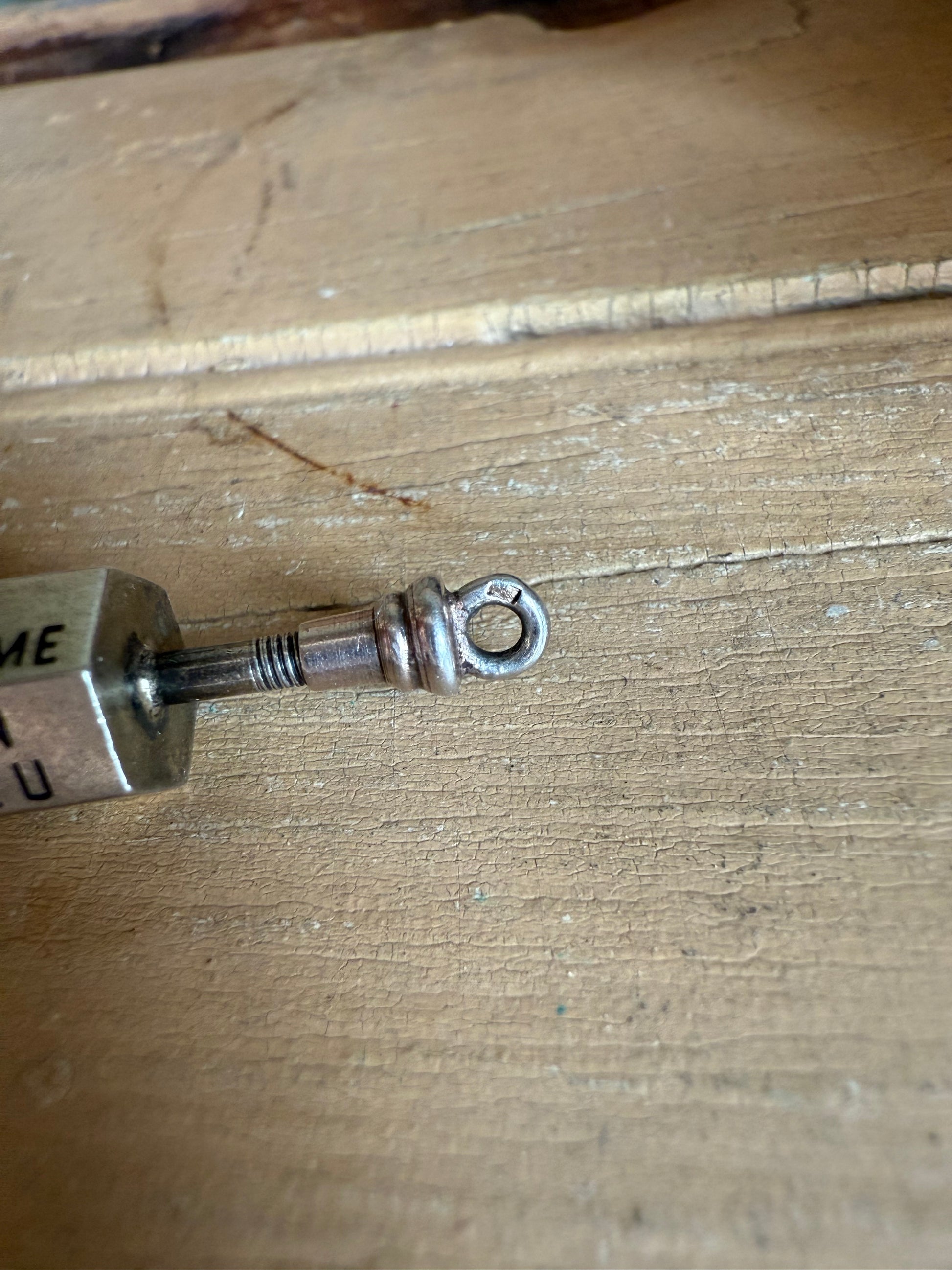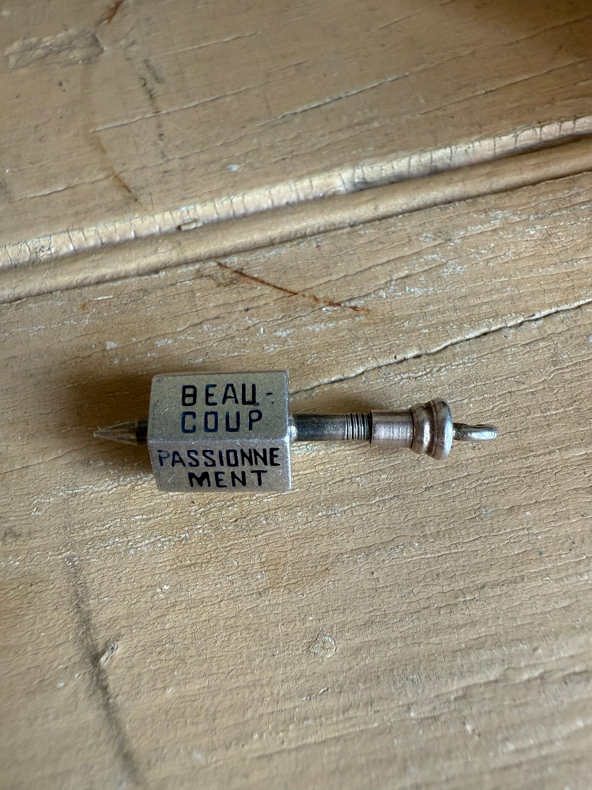 The piece does have a hallmark on the top ring (I can't make it out). The material is silver and it retains its original screw-on bail, which may be removed to allow the top to spin and balance properly, just as intended. A delightful and unusually romantic novelty jewel from the height of the Victorian era.