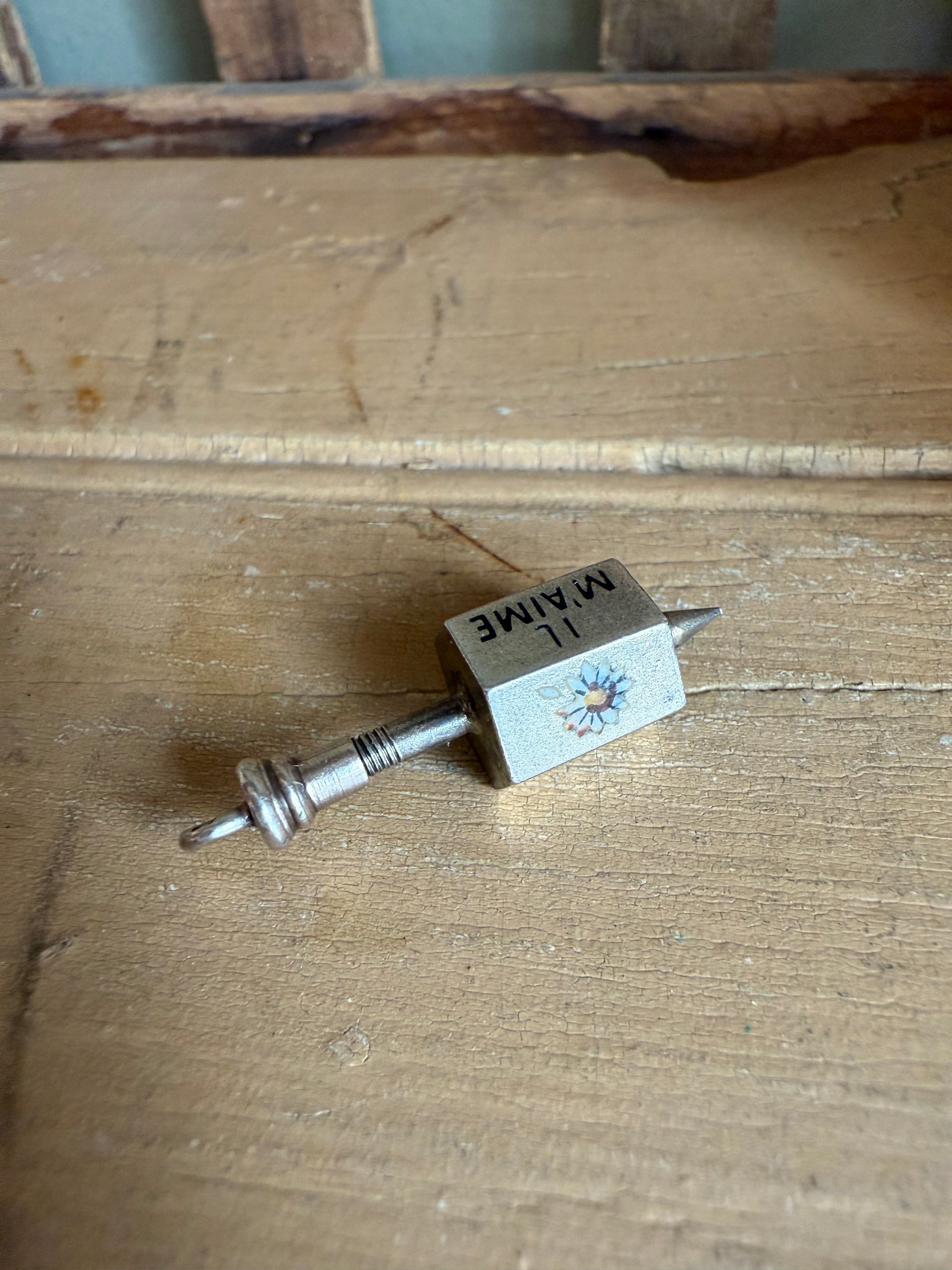 An utterly charming Victorian spinning-top pendant dating to the late 19th century, circa 1880. The six-sided top is enamelled with romantic outcomes inspired by the French parlour game Effeuiller la Marguerite (“Pluck the Daisy,” better known as he loves me, he loves me not), though here expanded well beyond a simple yes or no.