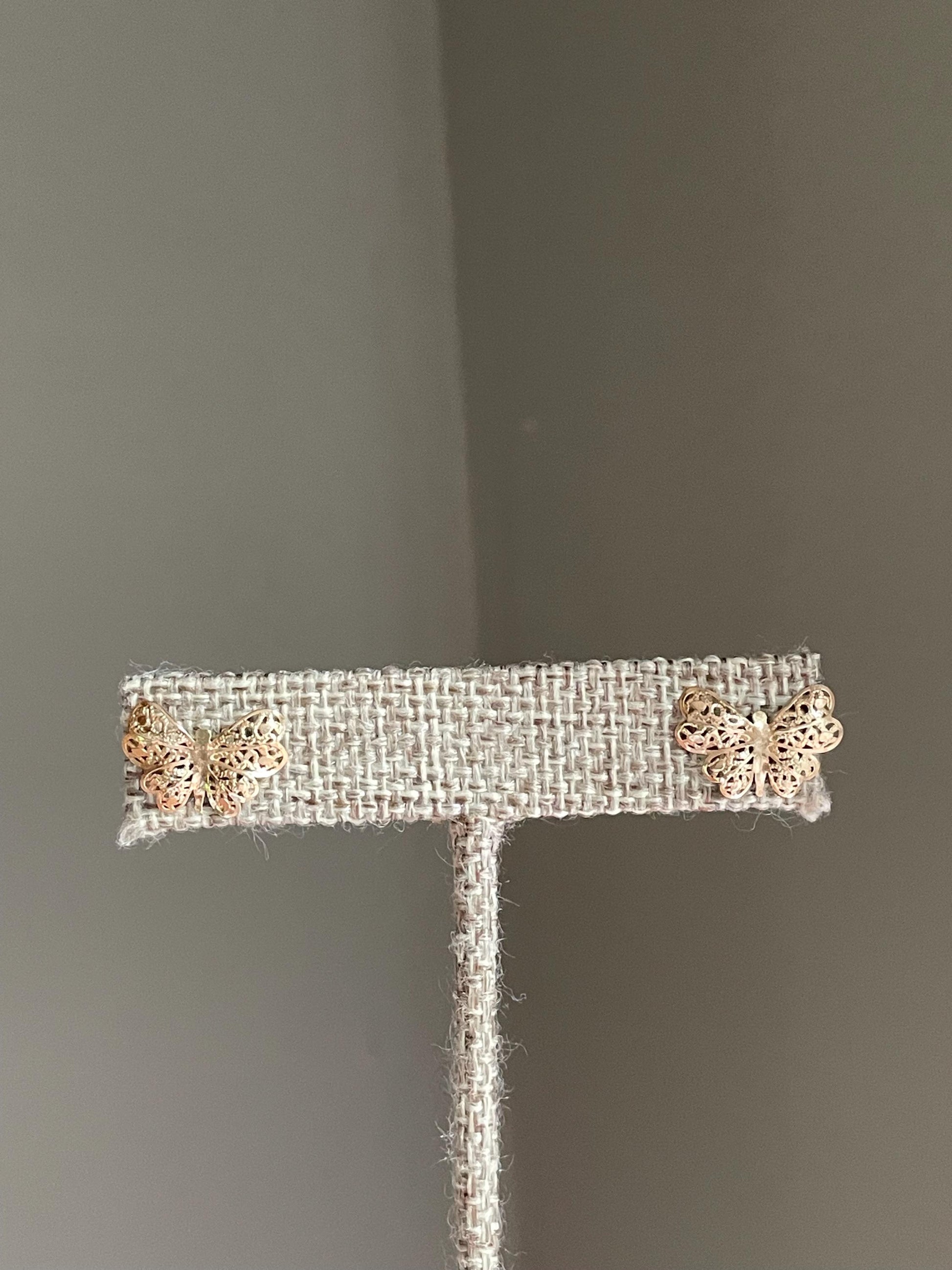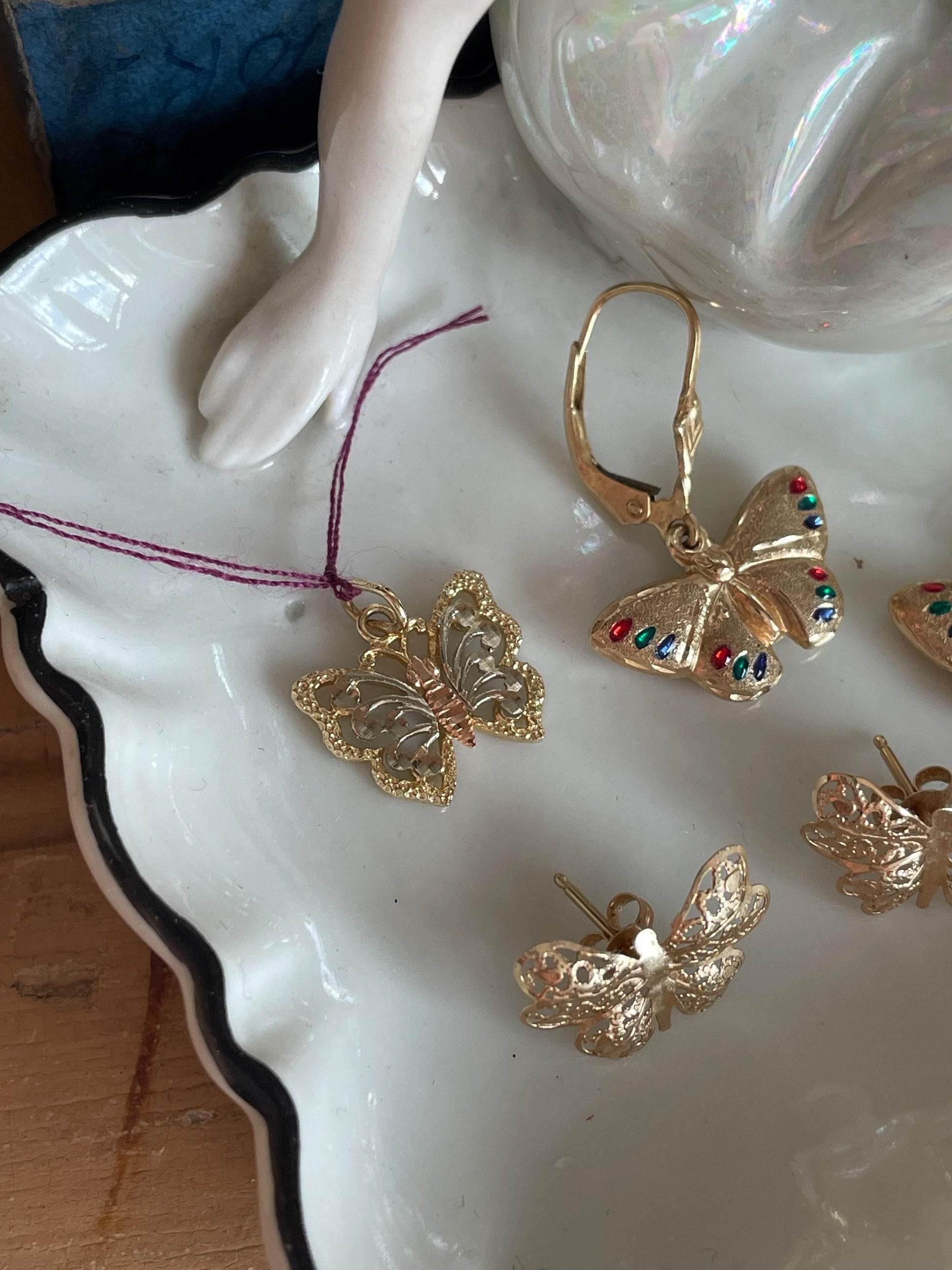 Vintage c1970-1980 14K yellow gold butterfly jewelry 1) 14K yellow, rose and white gold butterfly pendant, 5/8" top to bottom, 9/16" wide, oval shape bail, stamped 14k on back, tested, very good condition, .9 grams-reach out if you need a chain 2) 14K yellow gold lacy wing butterfly earrings, stamped 14k with 14k backings, 5/8" wide each, very good condition, .5 grams tw 3) SOLD 14K yellow gold puffy dangle butterfly earrings, with red, blue, green enamel accents, stamped 14k, very good condition, 2.2 grams tw