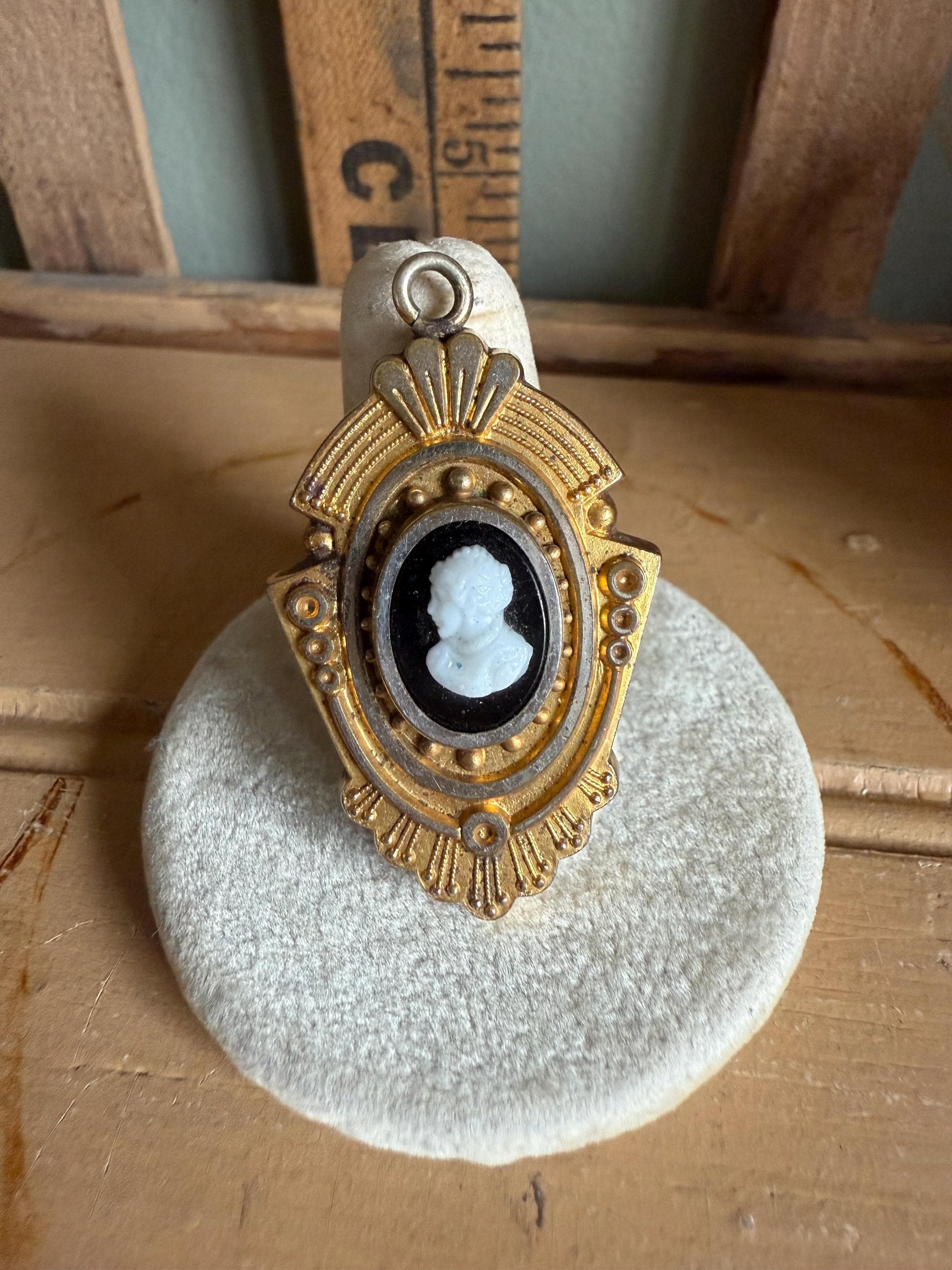 Antique Victorian 1880's-Gold filled set with an oval hand carved banded agate cameo of a lady in profile. The style is etruscan revival. Back has a glass covered compartment. 1 3/4 x 1 wide. Overall in very good antique condition.